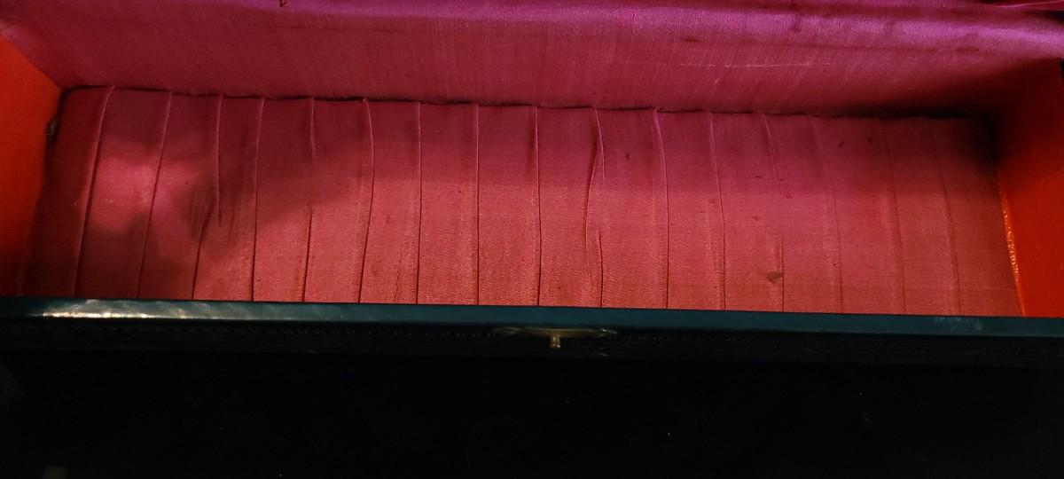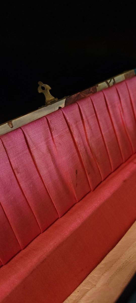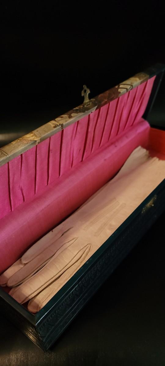 Fun Antique Celluloid Trinket Storage box with pink lined interior that is still intact. Some parts of the veneer around the top corners has experienced some degradation but otherwise this box has many years left. White Ladies gloves are included and appear to be a size M/L.