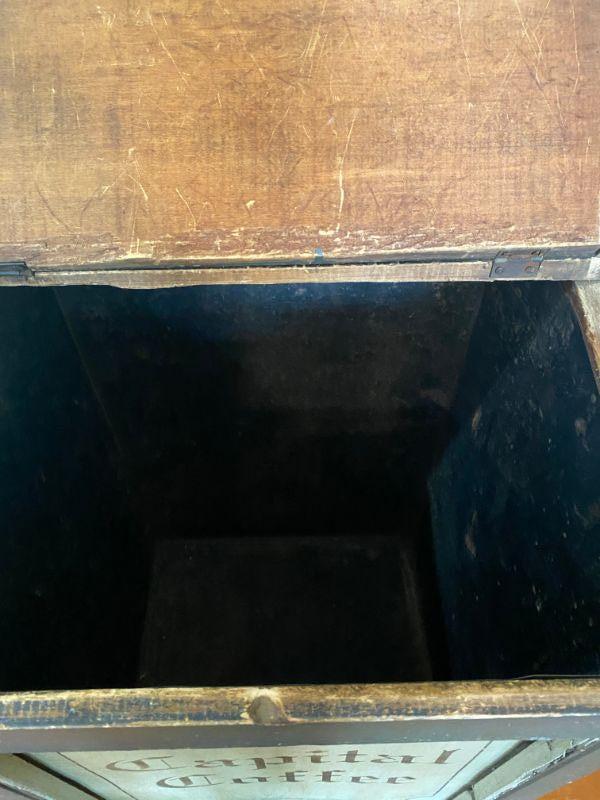 Antique Wooden Coffee Storage bin measures 21" wide x 19.5" deep x 32.5" tall