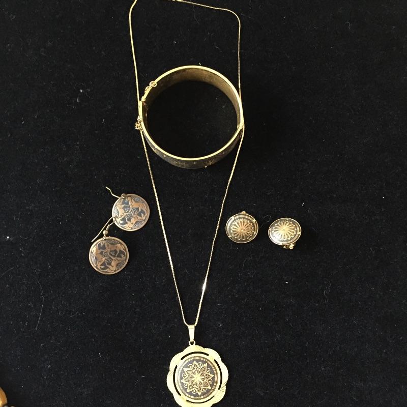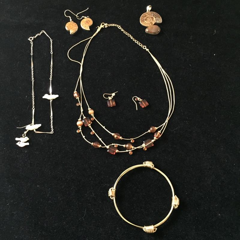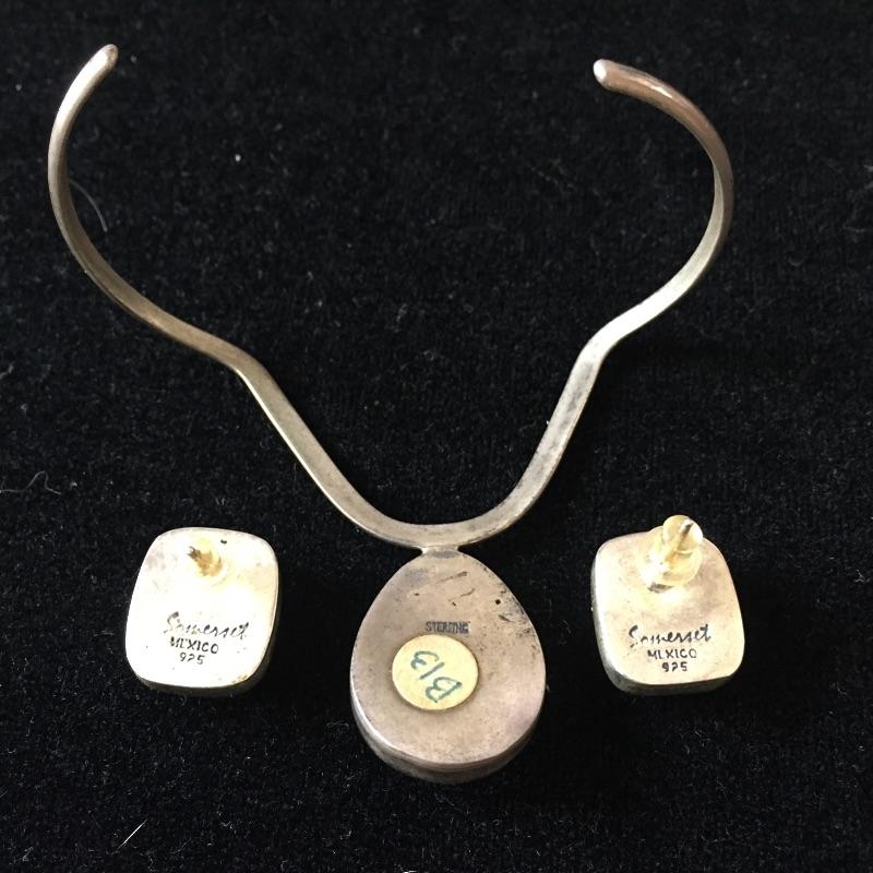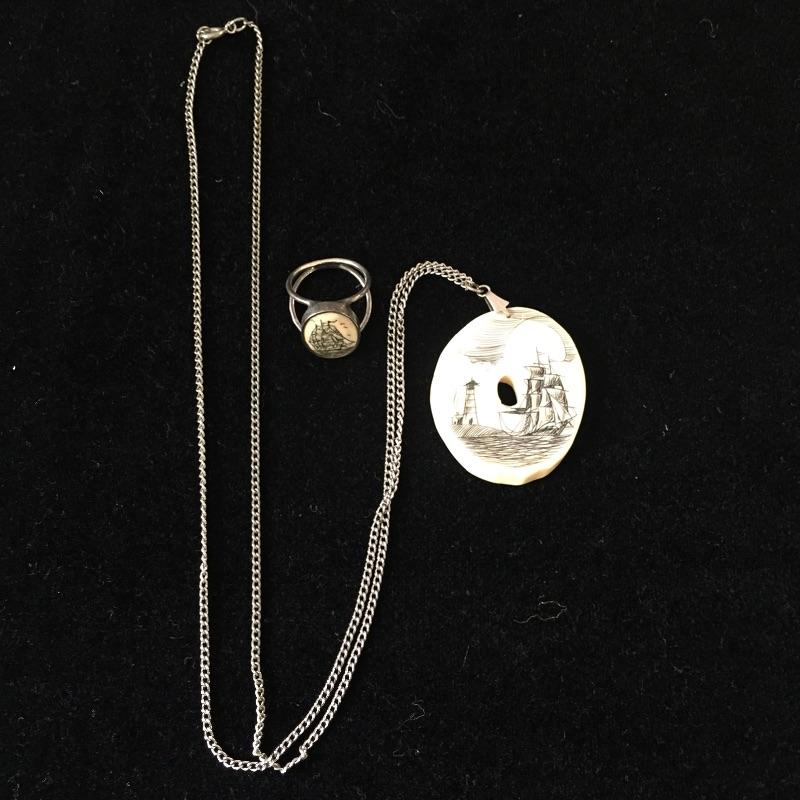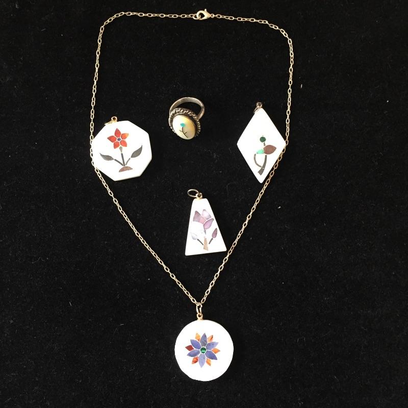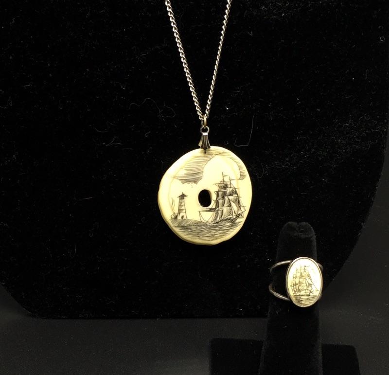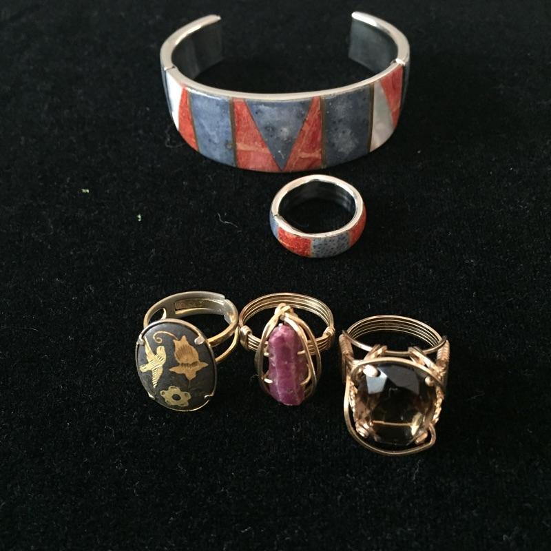 Large array of jewelry sets including Sterling Set of what appears to be scrimshaw, three rings are sized 5.5 and two rings sized 6.5. This large assortment of jewelry sets covers the basis of any wardrobe.