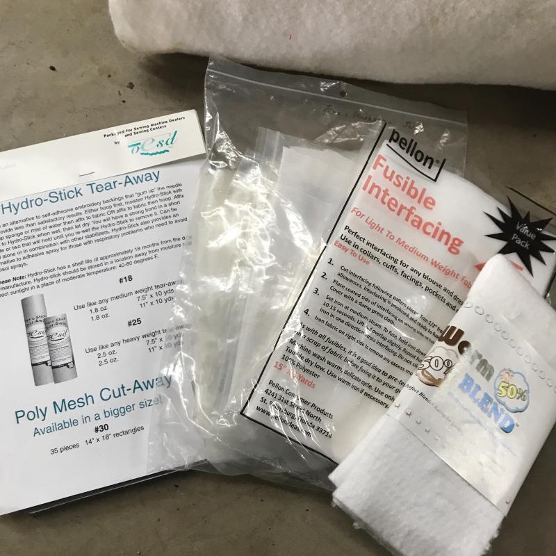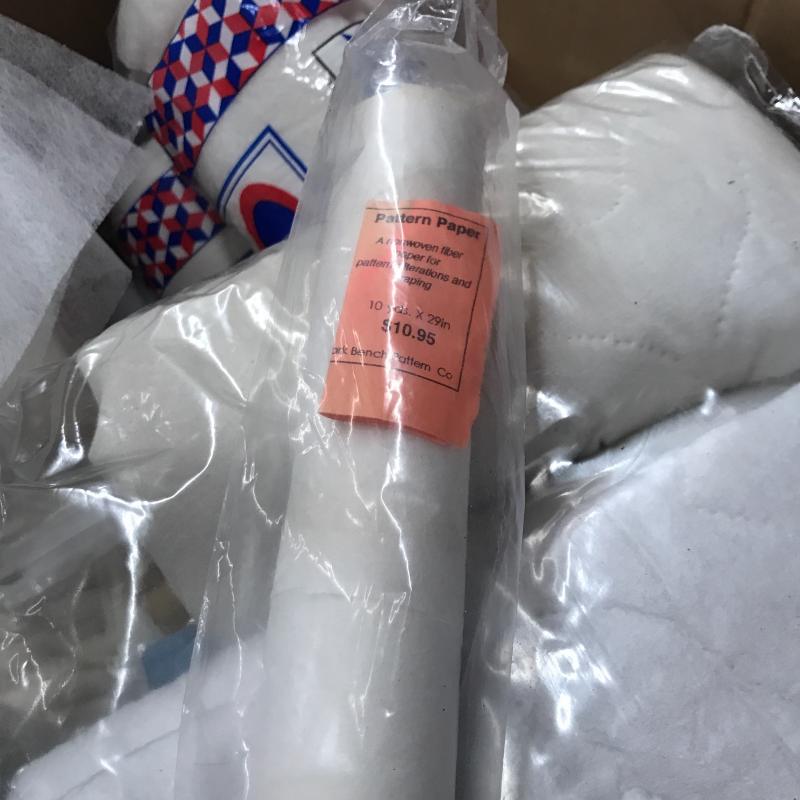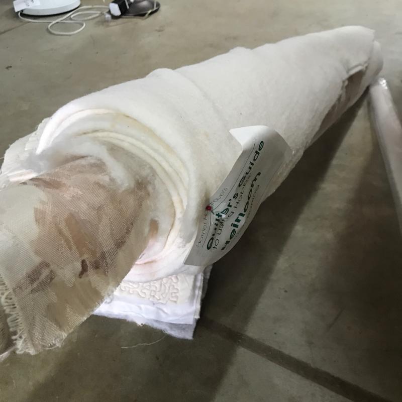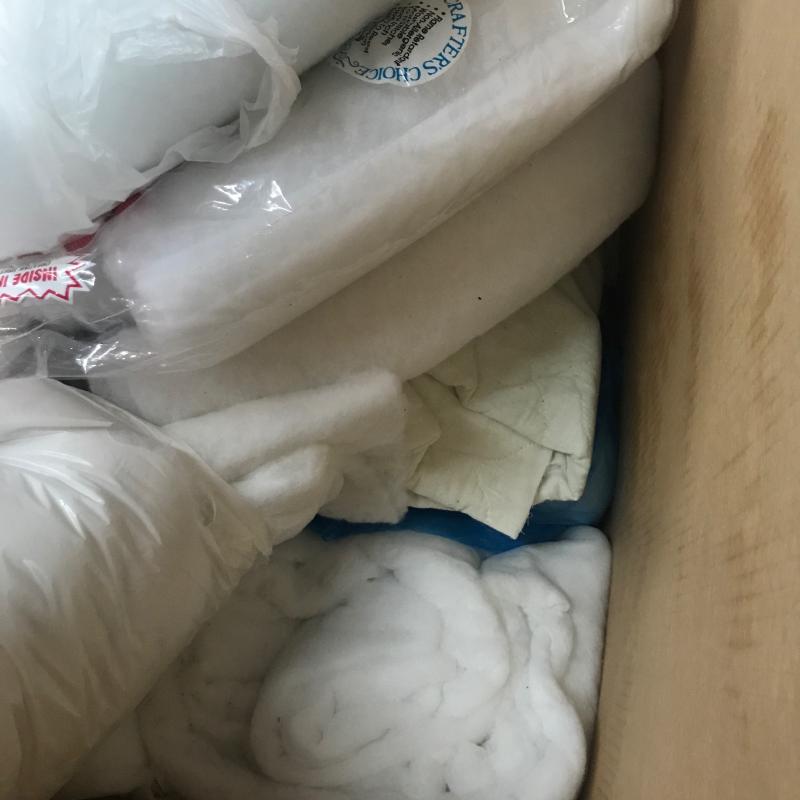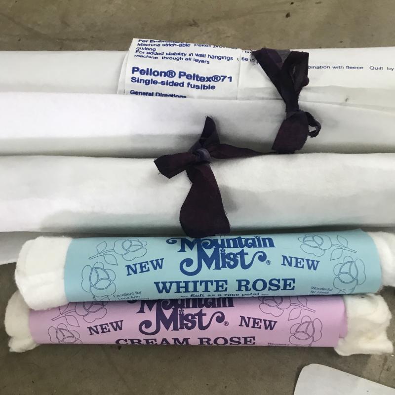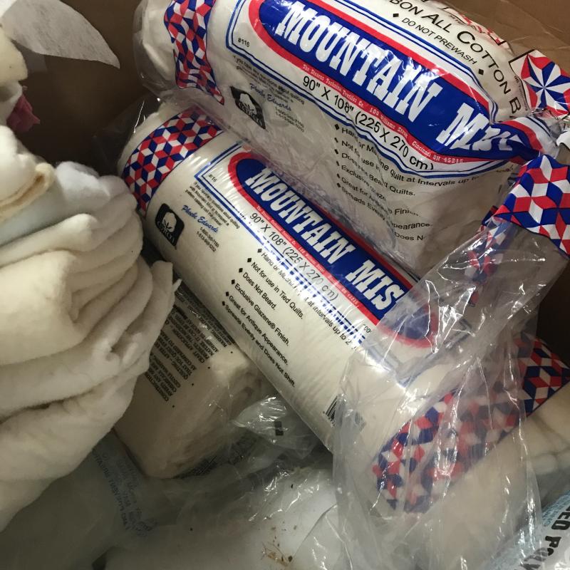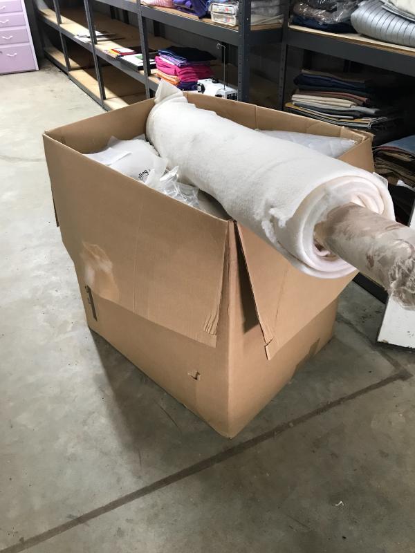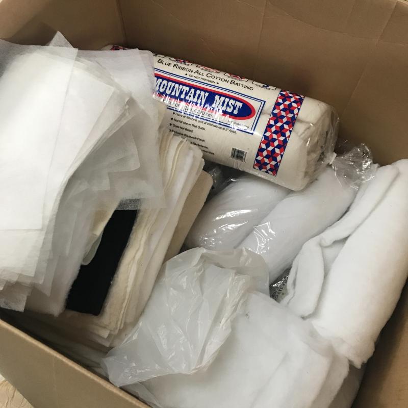 Huge lot of batting material. Synthetic and cotton batting. Large box full! Box measures 30” x 35” x 31” to give you an idea of quantity. Some have not been used. Two pieces of piping material are also in this Lot. No shipping.