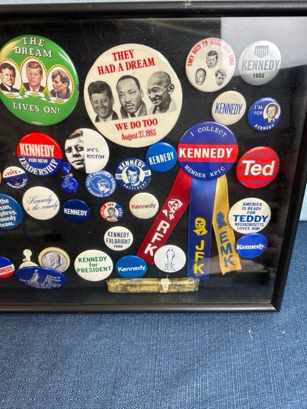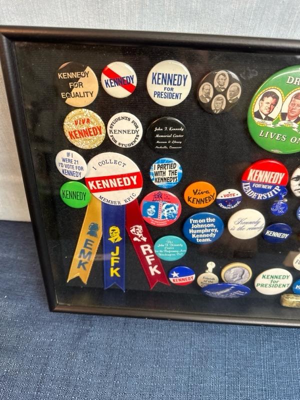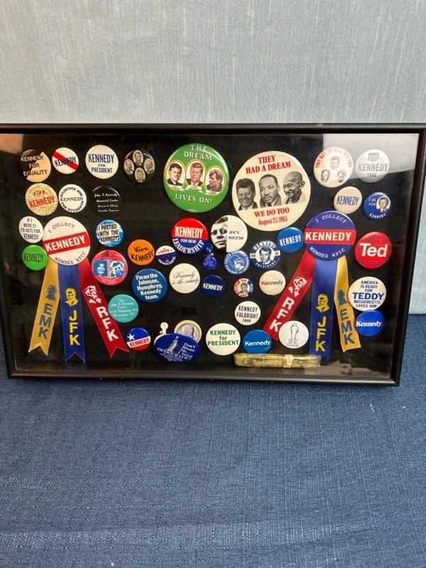 collection of Kennedy campaign buttons, 18 1/2” x 11 1/2”