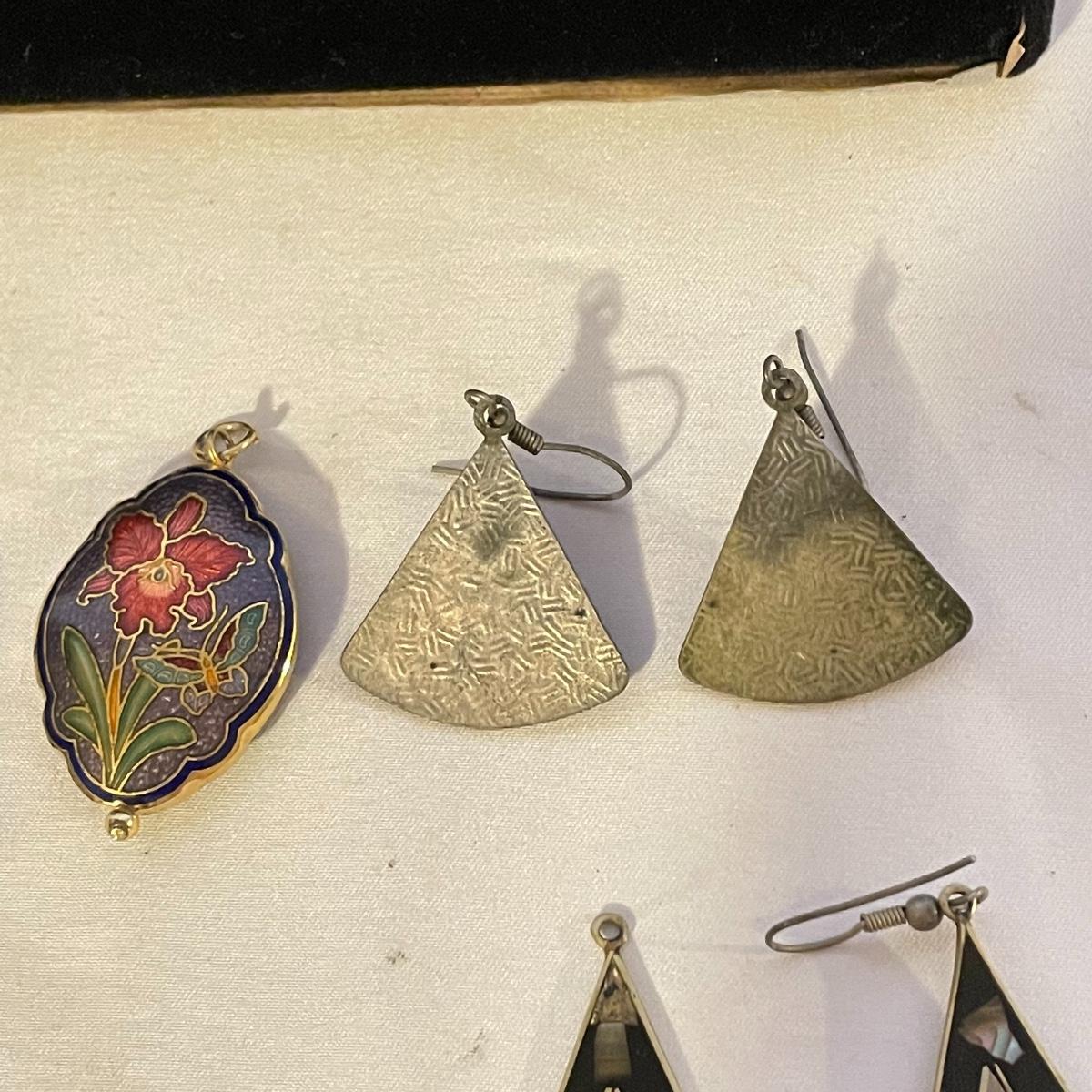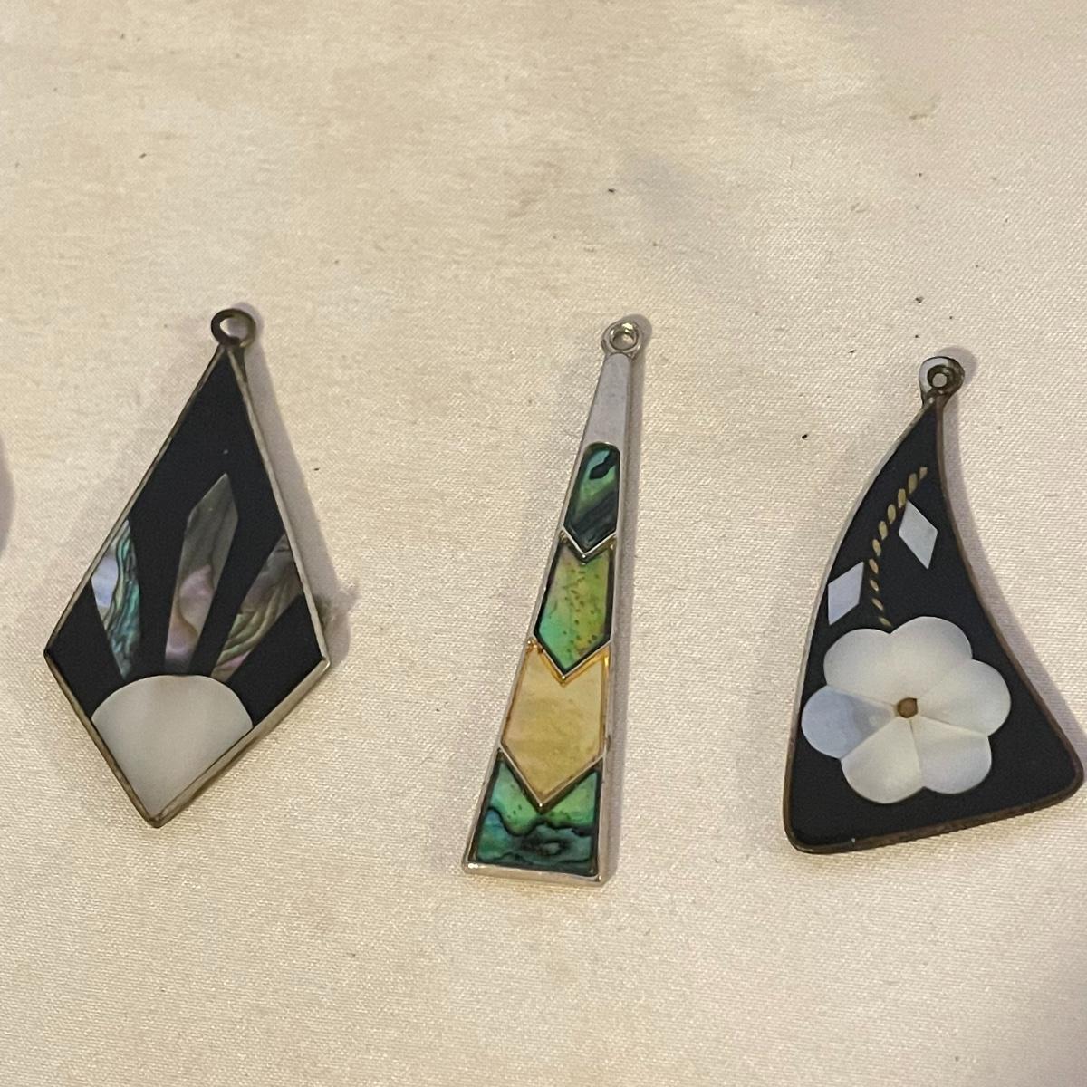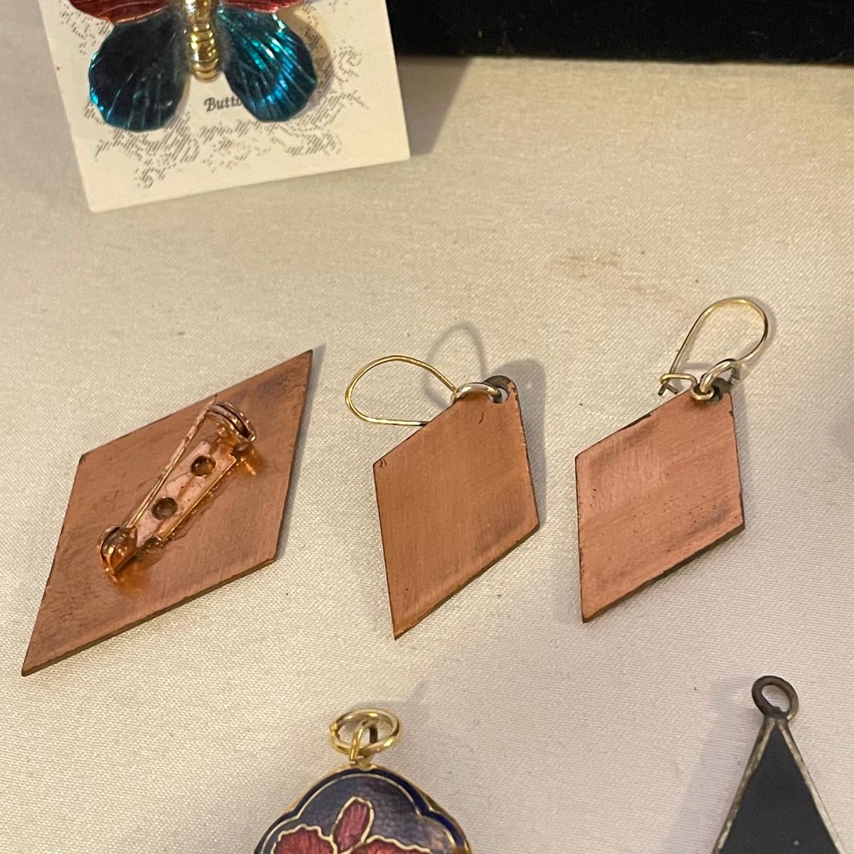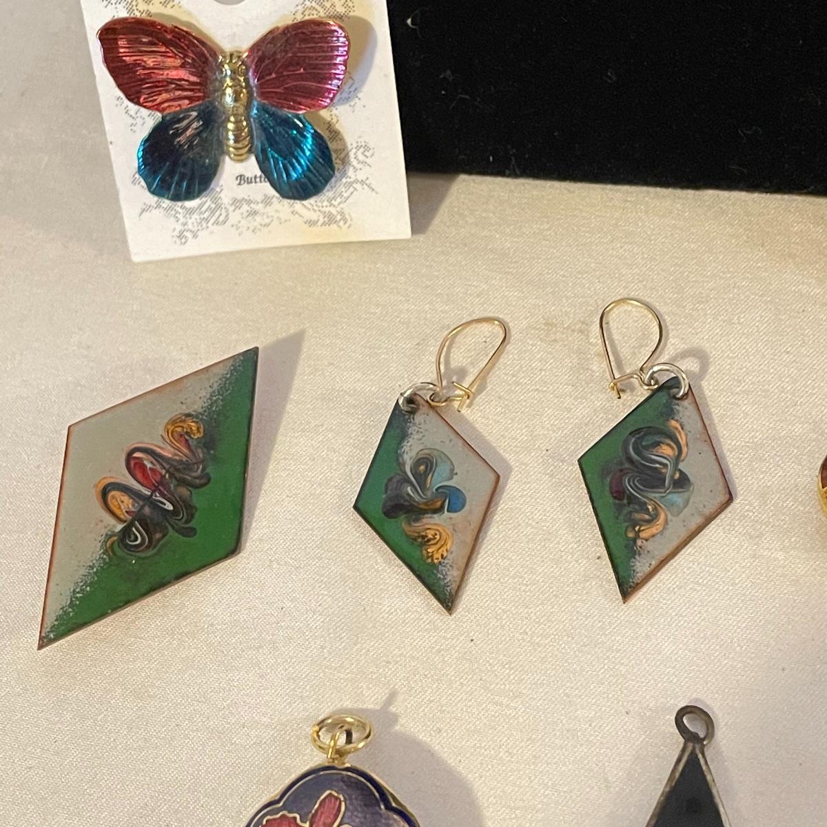 A bright collection of metal and enamel accents. The beauty of enamel is it is long lasting and rarely fades! Many pieces are from Mexico, all known markings are shown in photos. Lot features an earring and brooch set, two beaded 22” necklaces, more earrings and stud pendants along with brooches and a belt buckle. One earring has a small chip and is missing it’s hook, this pair can either be repaired by the buyer or upcycled to stud pendant or necklace pendants. See images. Shipping available.