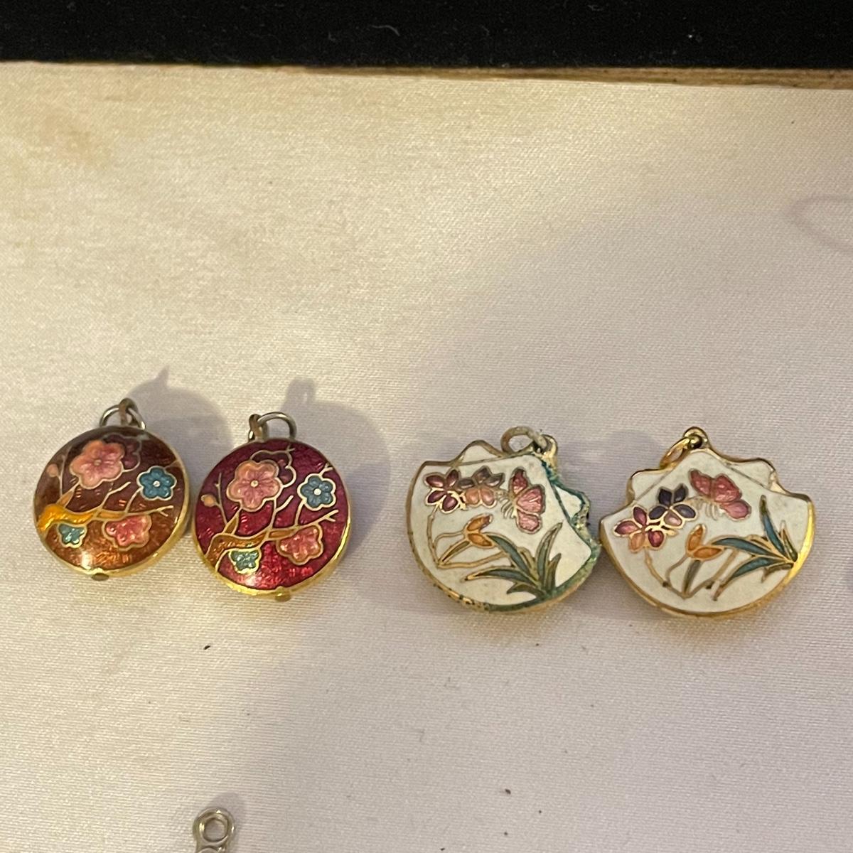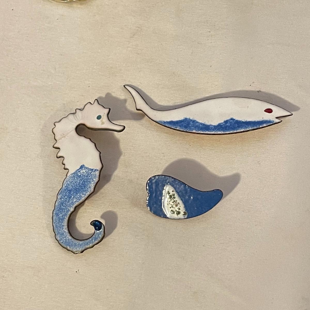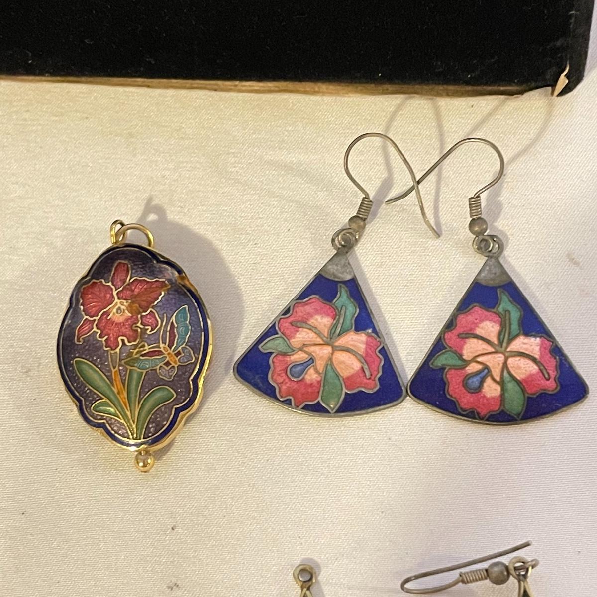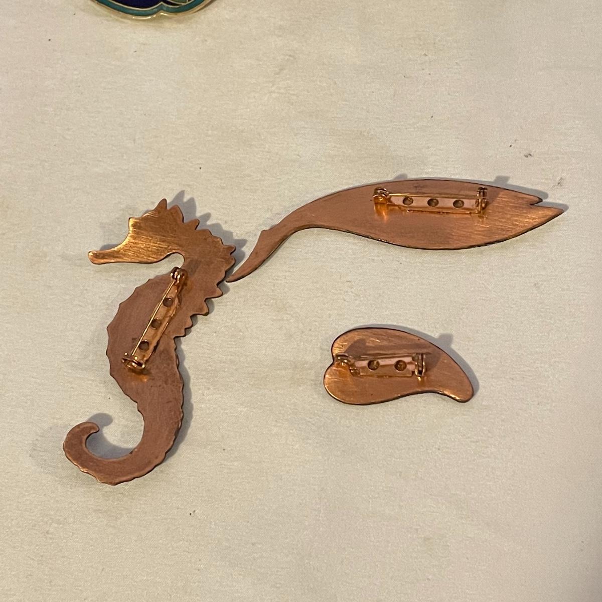 A bright collection of metal and enamel accents. The beauty of enamel is it is long lasting and rarely fades! Many pieces are from Mexico, all known markings are shown in photos. Lot features an earring and brooch set, two beaded 22” necklaces, more earrings and stud pendants along with brooches and a belt buckle. One earring has a small chip and is missing it’s hook, this pair can either be repaired by the buyer or upcycled to stud pendant or necklace pendants. See images. Shipping available.