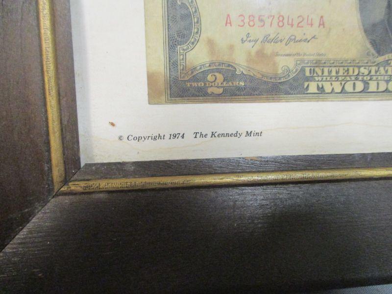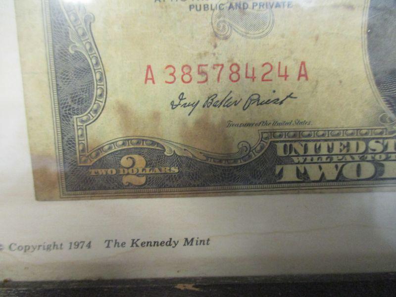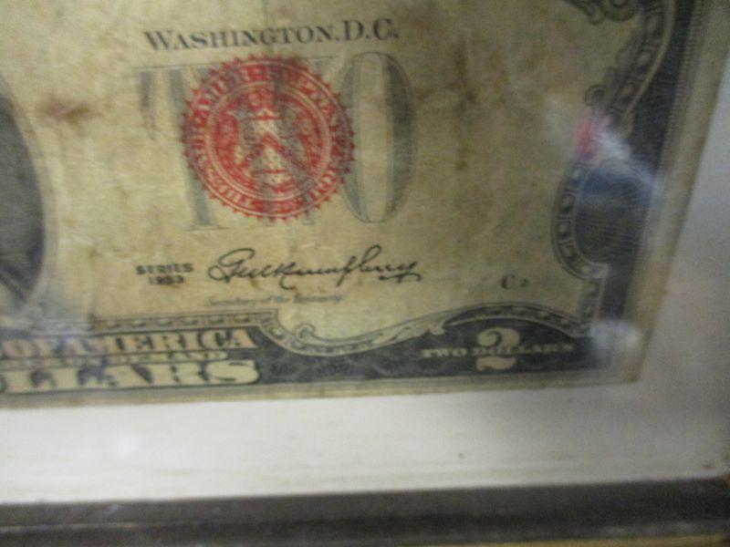 This is an old $2 bill and not the current model. This one is signed by Ivy Baker Priest and G.M. Humphrey. The $2 bill was retired in 1966, then re-introduced by the Federal Reserve with a different look in 1974. This one is definitely used and there seems to be discoloration to it, but no tears. The frame is about 12.5" x 10.5".