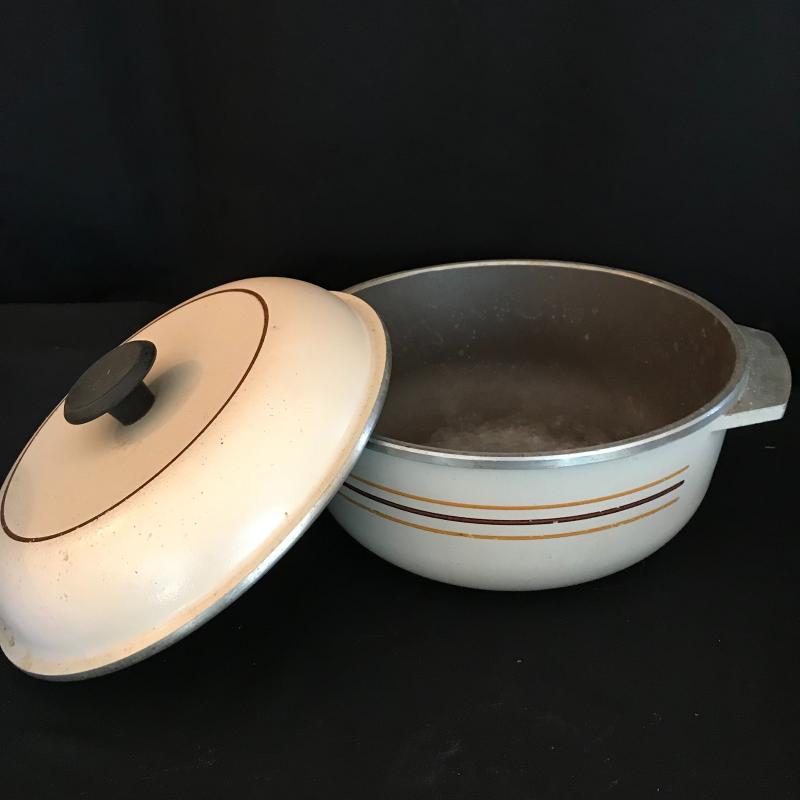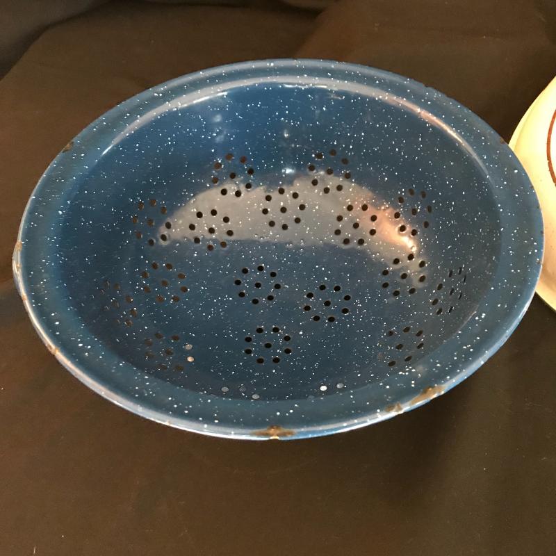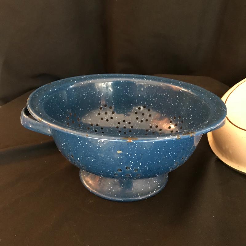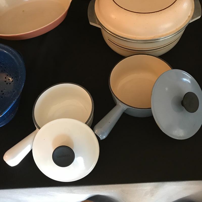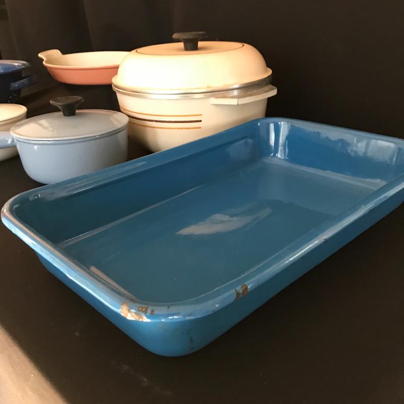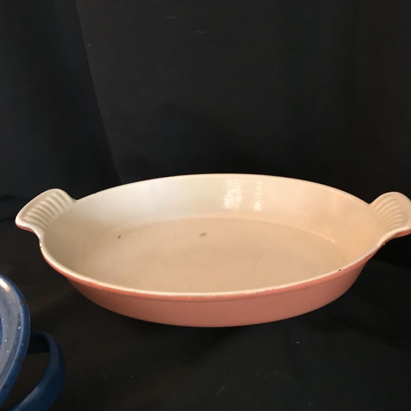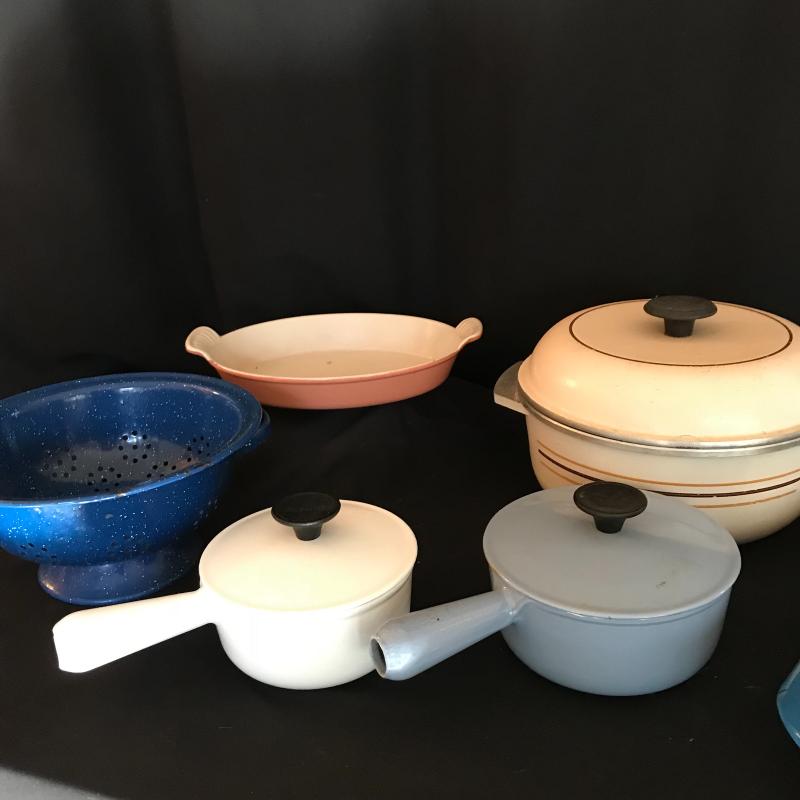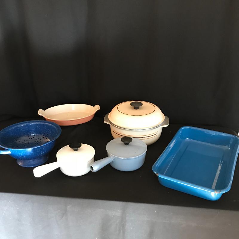Two (14 & 16) Cousances pots and one (24) Le Creuset dish. Also a blue enamel colander and blue enamel pan and stew pot. This lot is available for local pick up in Flat Rock, NC only.