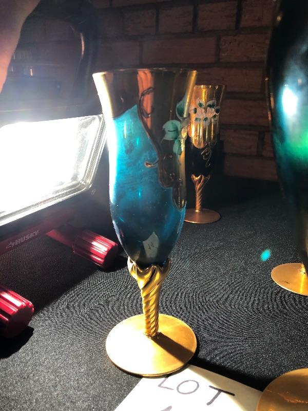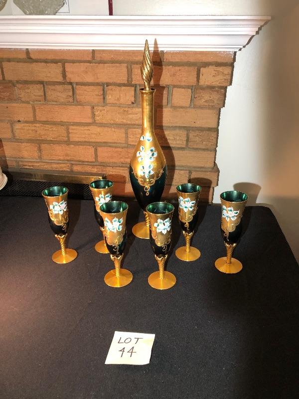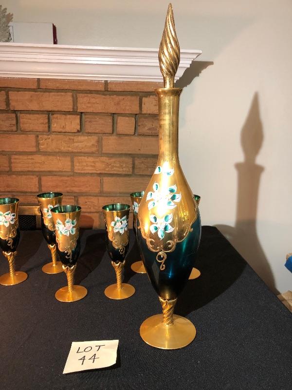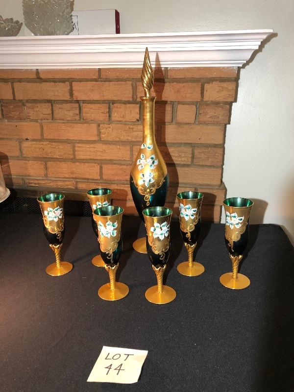 Lot 44 - Gorgeous Venetian Italian 24K Gold Decanter with Green Glass and 6 Glasses