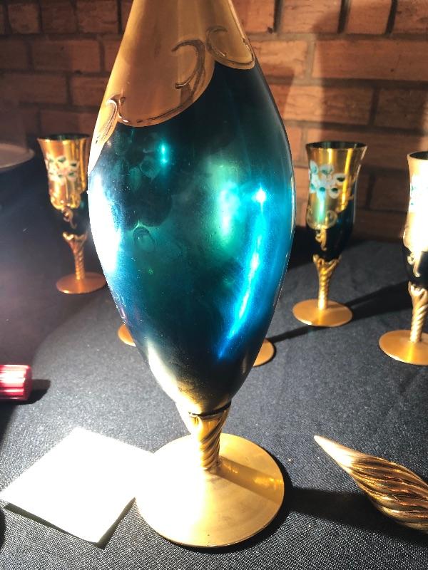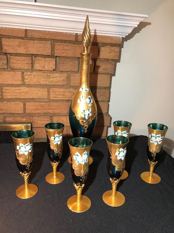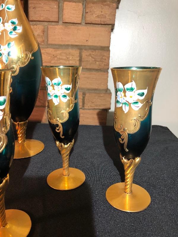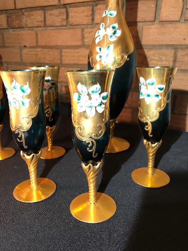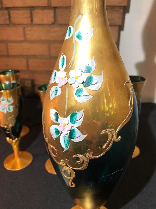 Gorgeous Venetian Italian Hand Painted 24K Gold Decanter with Green Glass and 6 glasses.