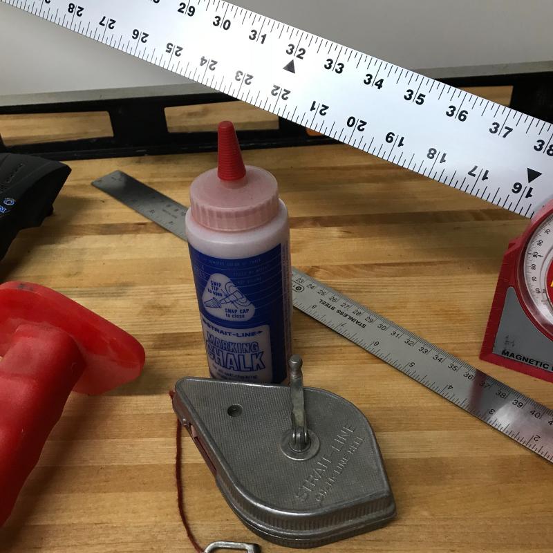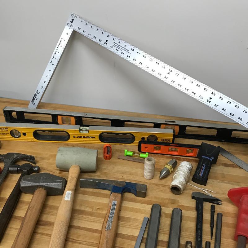 Various hammers, different size levels, chalk line, stud finder, different weight tappets Metal L square, plum line and more. Lot is available for local pick up in Asheville, NC only.
