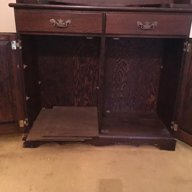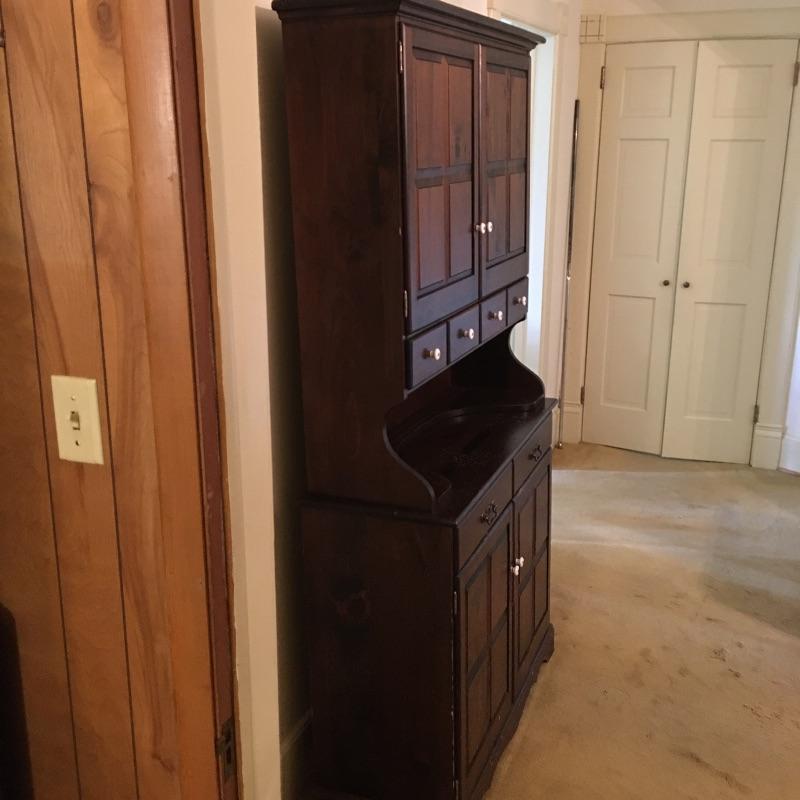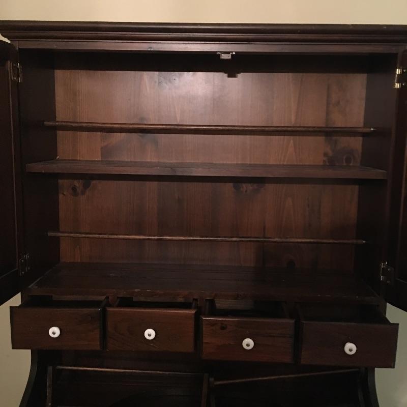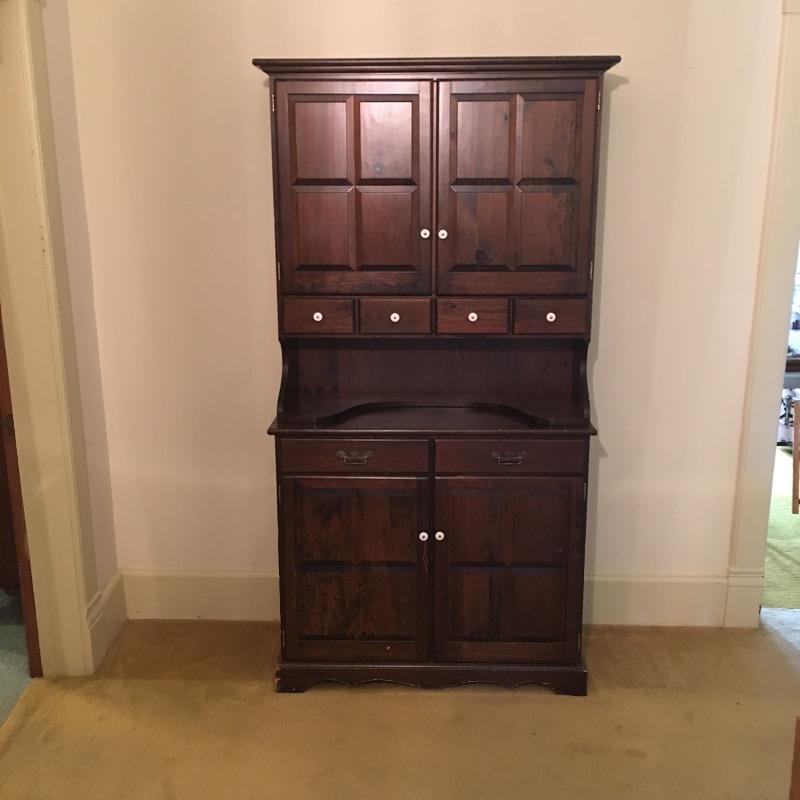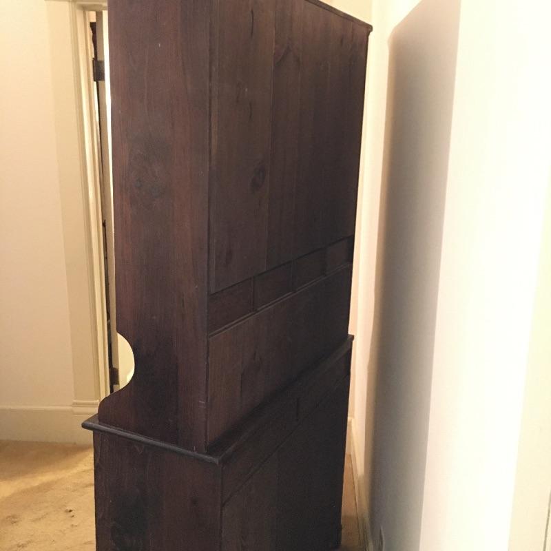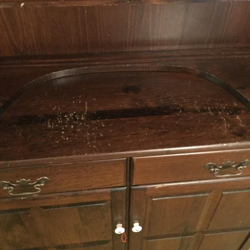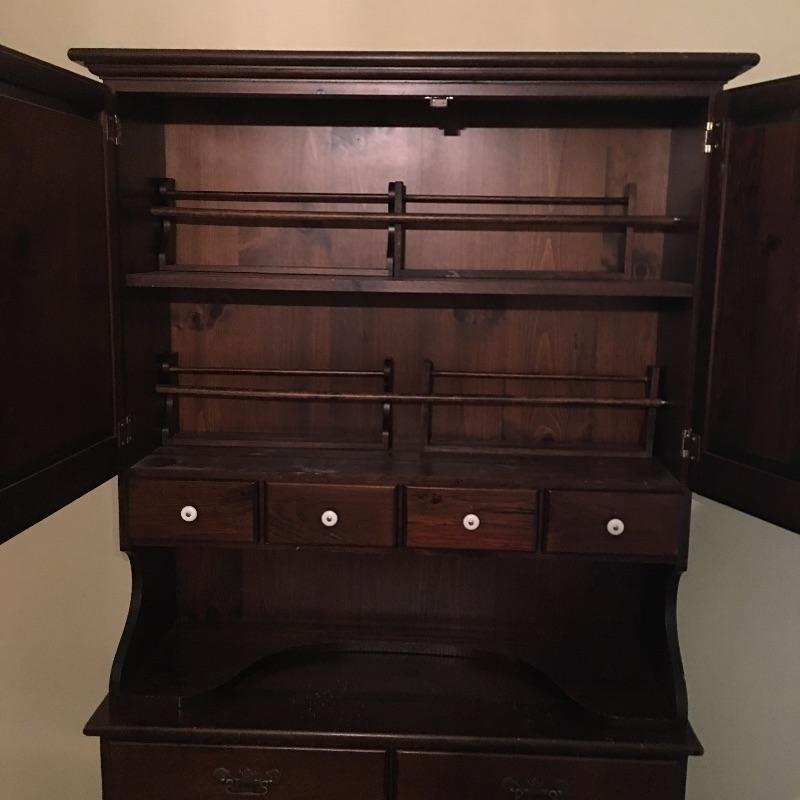 What a beautiful find! This piece definitely makes a statement and gives multiple opportunities for organization. This wooden hutch has two drawers with a cabinet including three adjustable shelves in lower cabinets that are not currently inserted and are missing five of the plastic pieces that hold up shelves. It also features four drawers and two shelves with plate bar and grooves inside cabinet on the upper portion. We’ve included four separate matching plate stands. The middle has some deep gouges, but is otherwise in fine condition with a little wear elsewhere. See pictures. Bring help to load, item is substantial. All drawers have white glass pulls on top and metal pulls on bottom. Hutch measures 38.5” x 15” x 75”. Item appears to be screwed together to make it one piece.