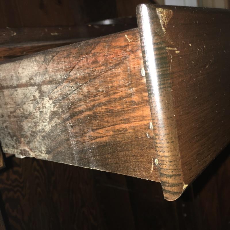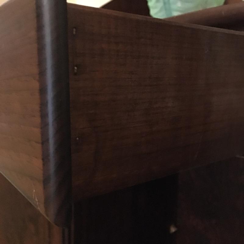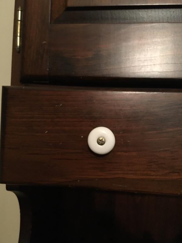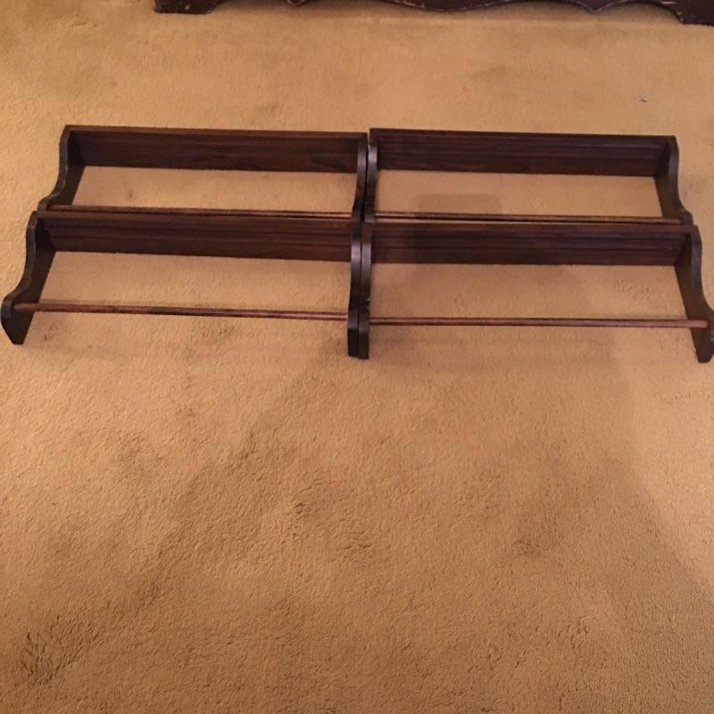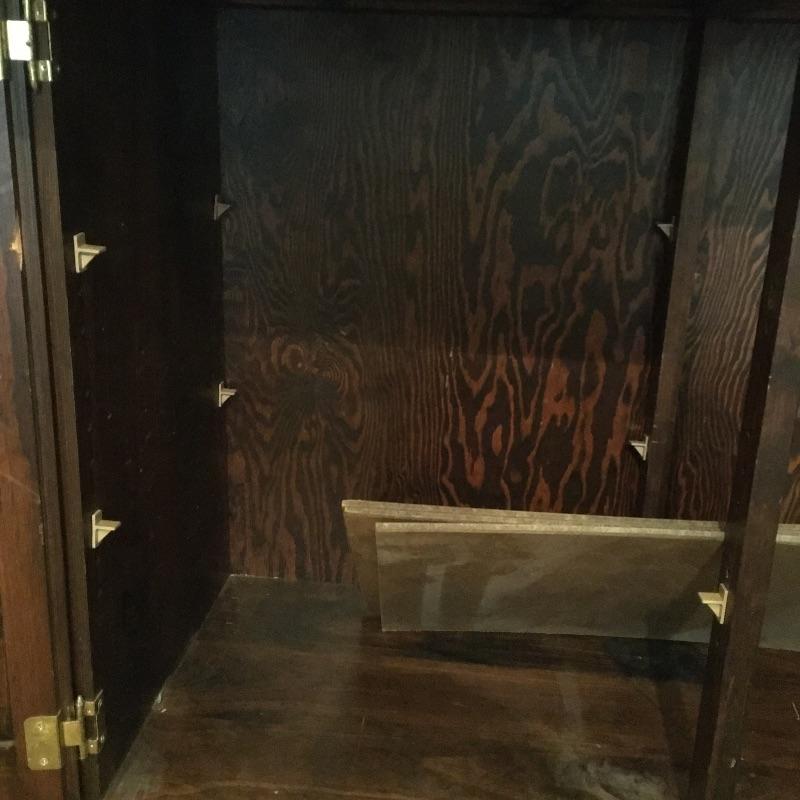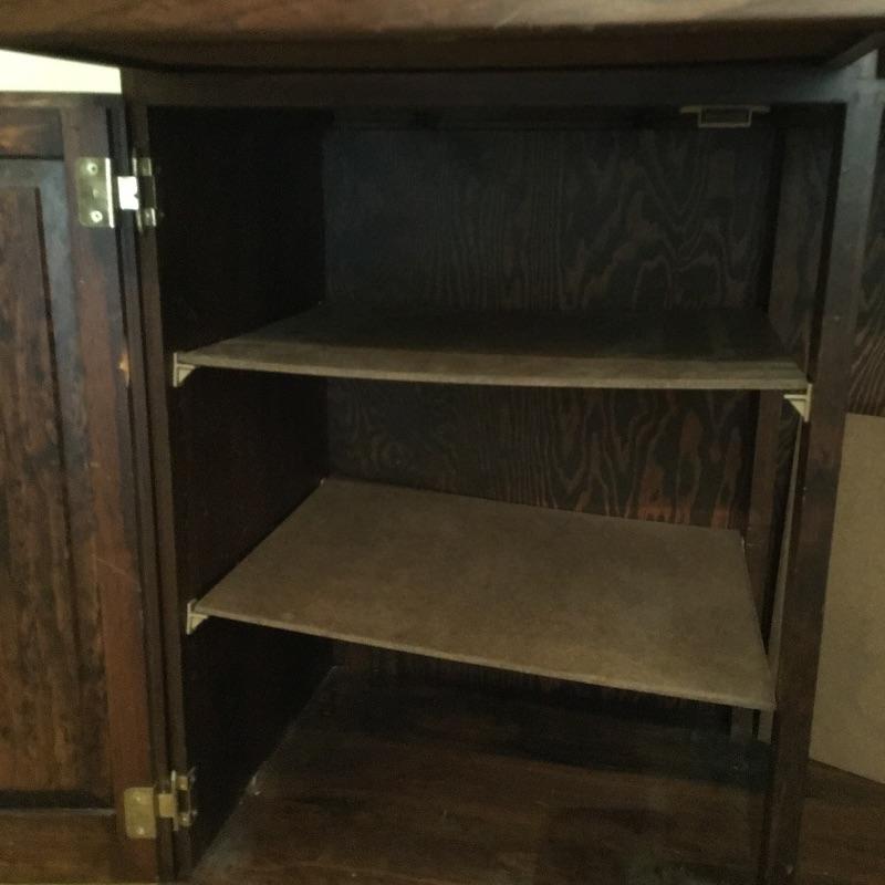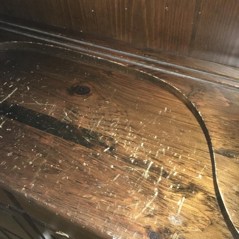 What a beautiful find! This piece definitely makes a statement and gives multiple opportunities for organization. This wooden hutch has two drawers with a cabinet including three adjustable shelves in lower cabinets that are not currently inserted and are missing five of the plastic pieces that hold up shelves. It also features four drawers and two shelves with plate bar and grooves inside cabinet on the upper portion. We’ve included four separate matching plate stands. The middle has some deep gouges, but is otherwise in fine condition with a little wear elsewhere. See pictures. Bring help to load, item is substantial. All drawers have white glass pulls on top and metal pulls on bottom. Hutch measures 38.5” x 15” x 75”. Item appears to be screwed together to make it one piece.