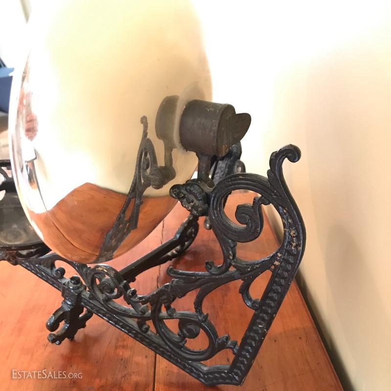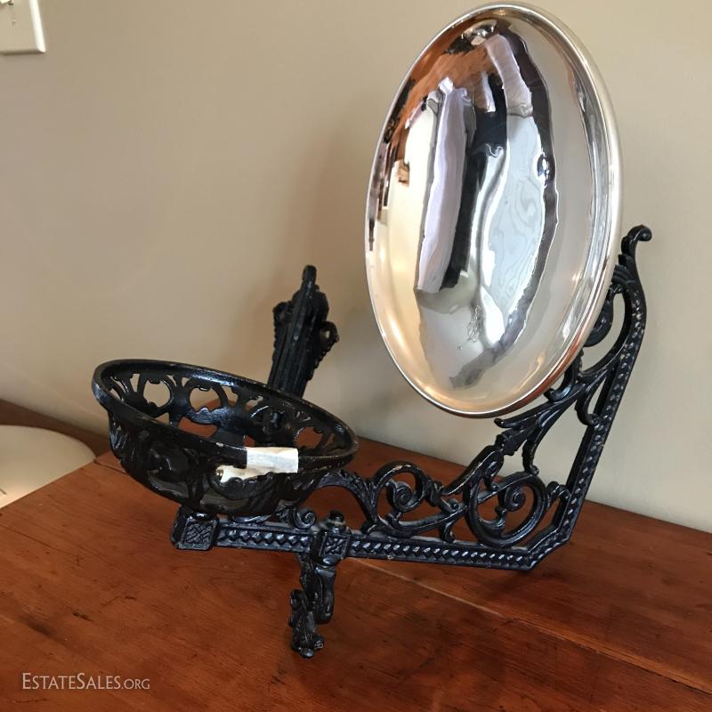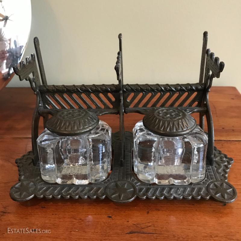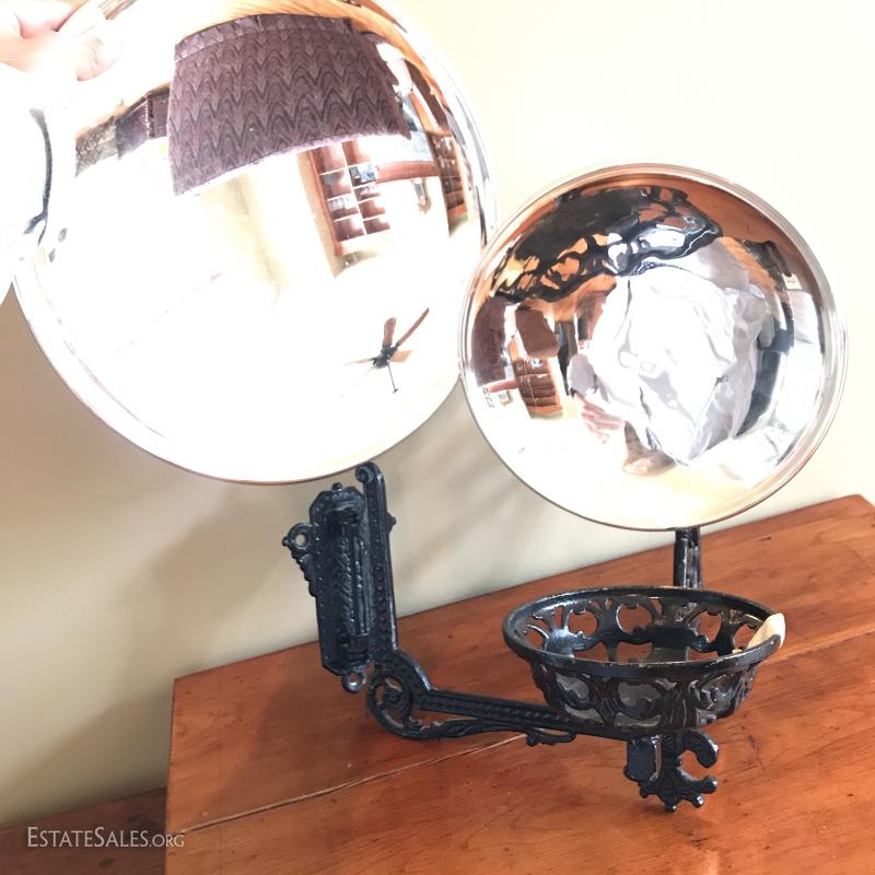 Lot includes a Cast iron and glass inkwell. Also includes a Cast iron/wall mounted candle or light holder with two mercury glass light diffusers/reflectors.