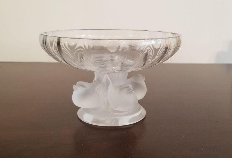 Charming little Lalique crystal compote with four fat little birds on the base. Plainly marked on underside. Note the small boo-boo in photos - this is not a "chip" - you can't feel it with your finger - looks like a small firing error. Very tiny - wanted to mention it for accuracy. This piece may have been purchased as a "second." No box.