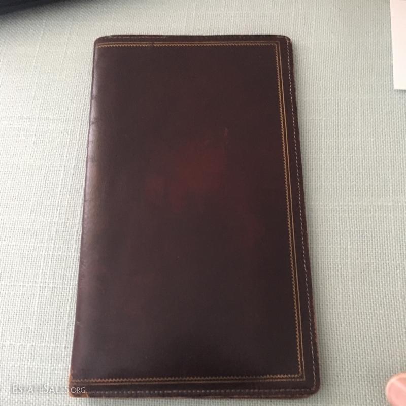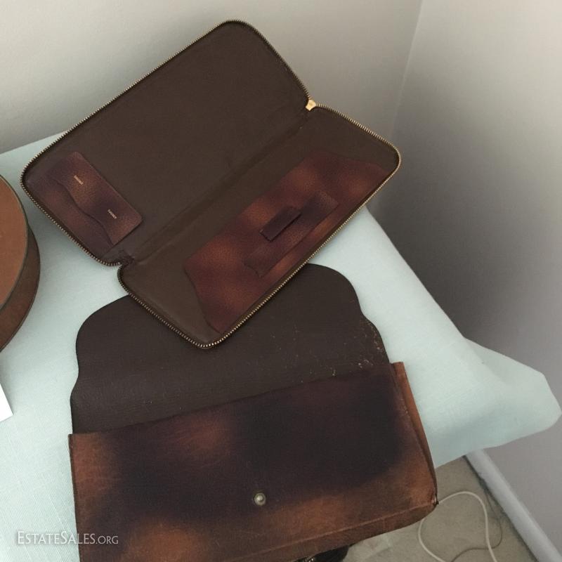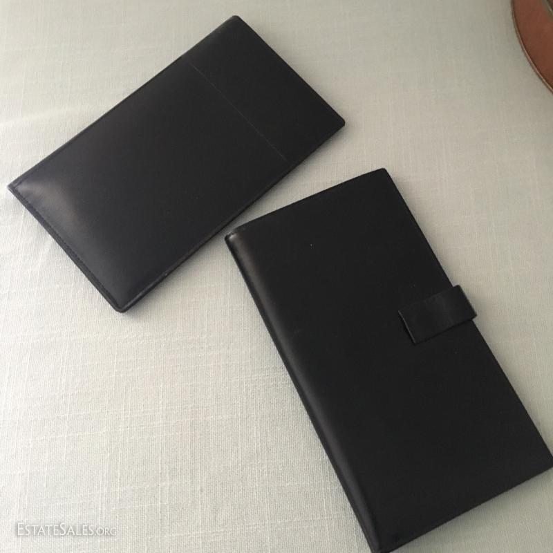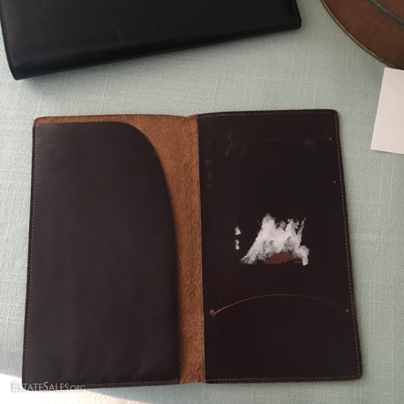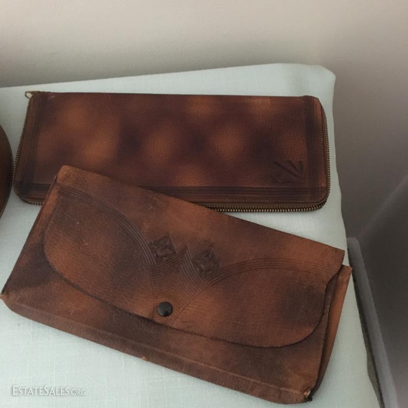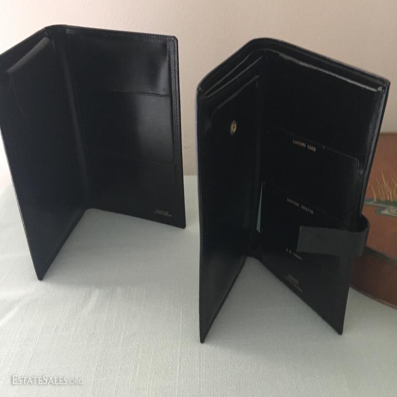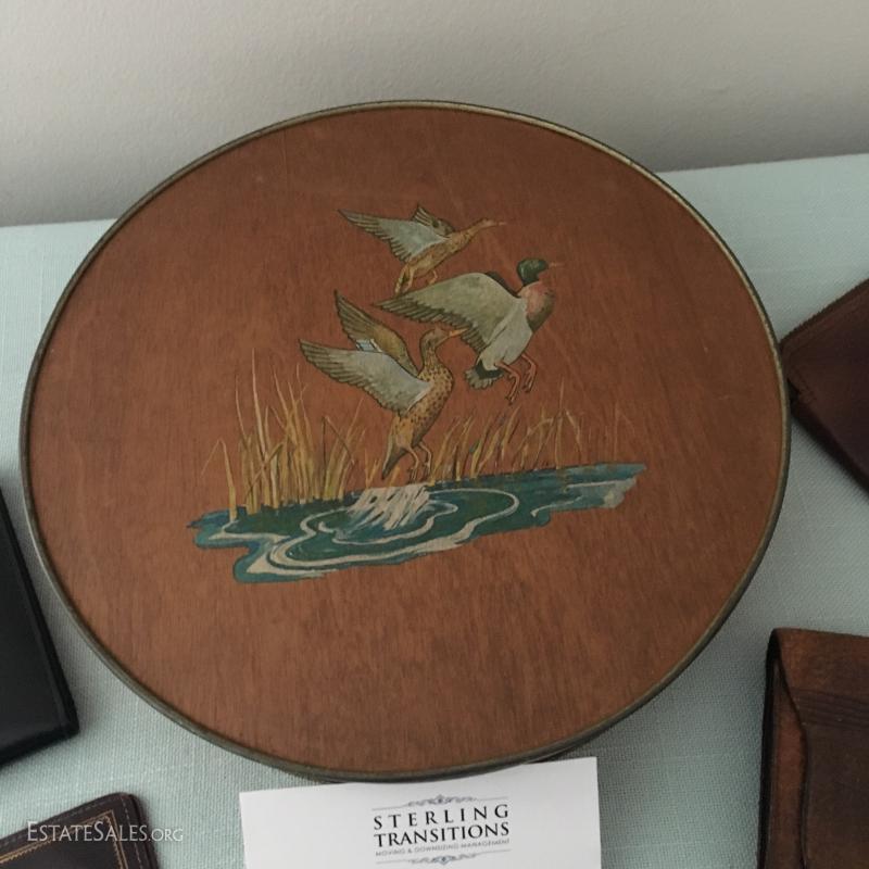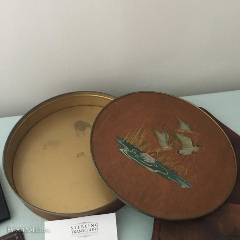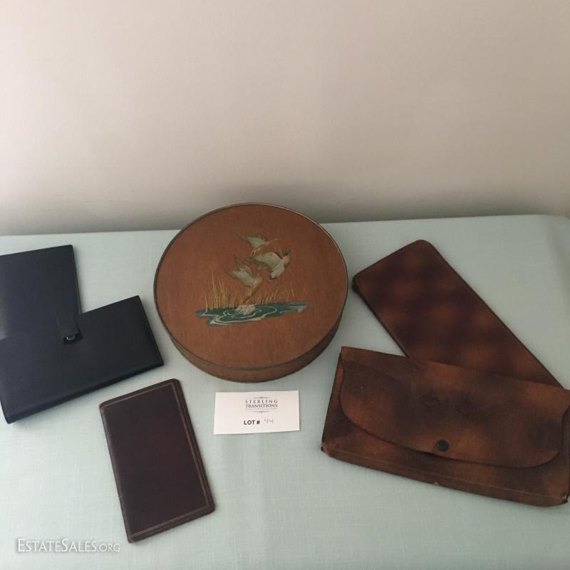 Metal tin with veneer wood covering and waterfowl painting on top. Five leather folders/wallets. Two are black cowhide (one Buxton, one Princess Gardner). Three are brown with varying tones.