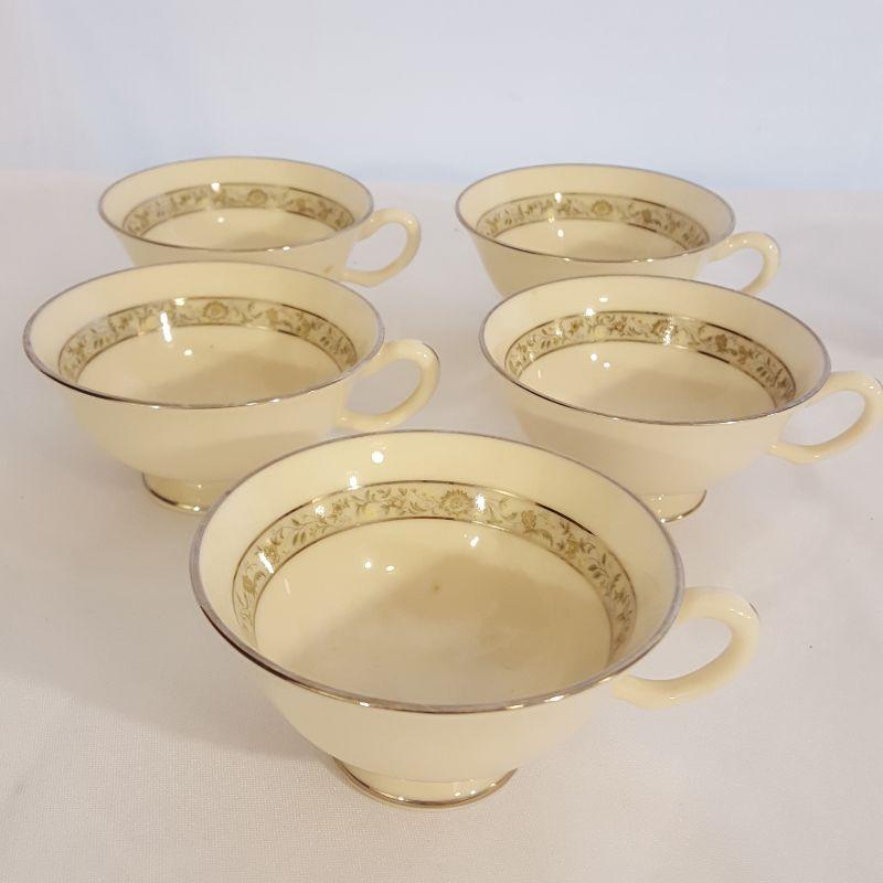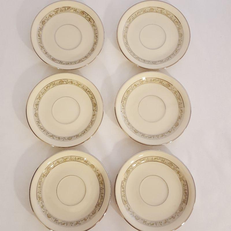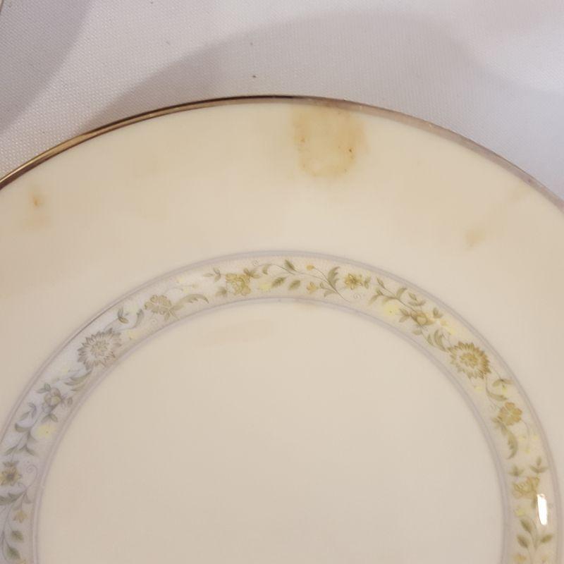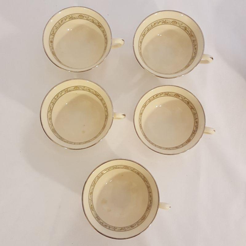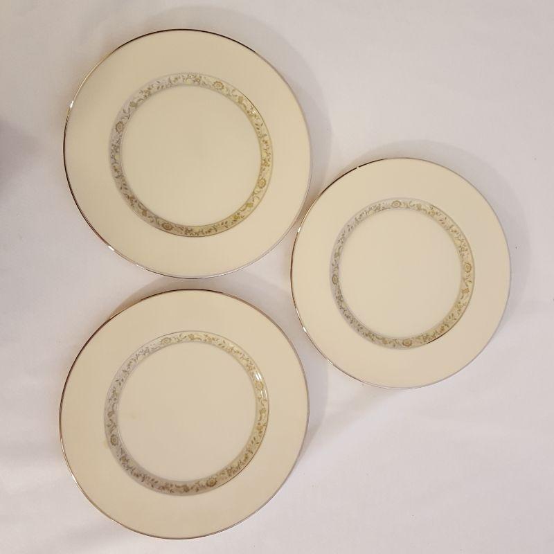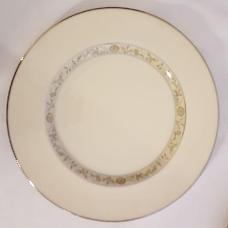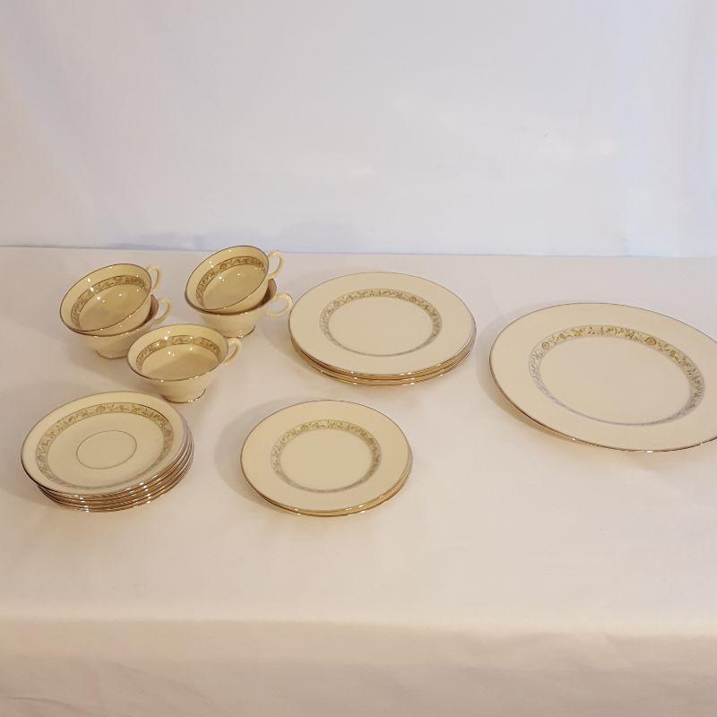 This Lenox Springdale China collection contains 5 cups, 6 saucers, 2 dessert plates, 3 salad plates and 1 dinner plate. The pictures indicate the condition of each piece, as this set has some spots and wear on them.