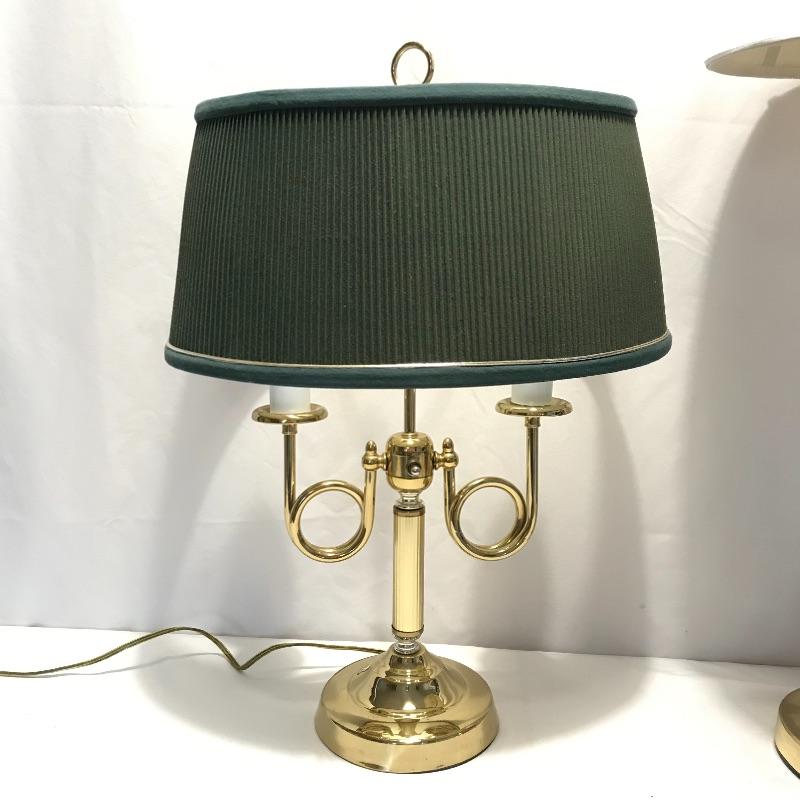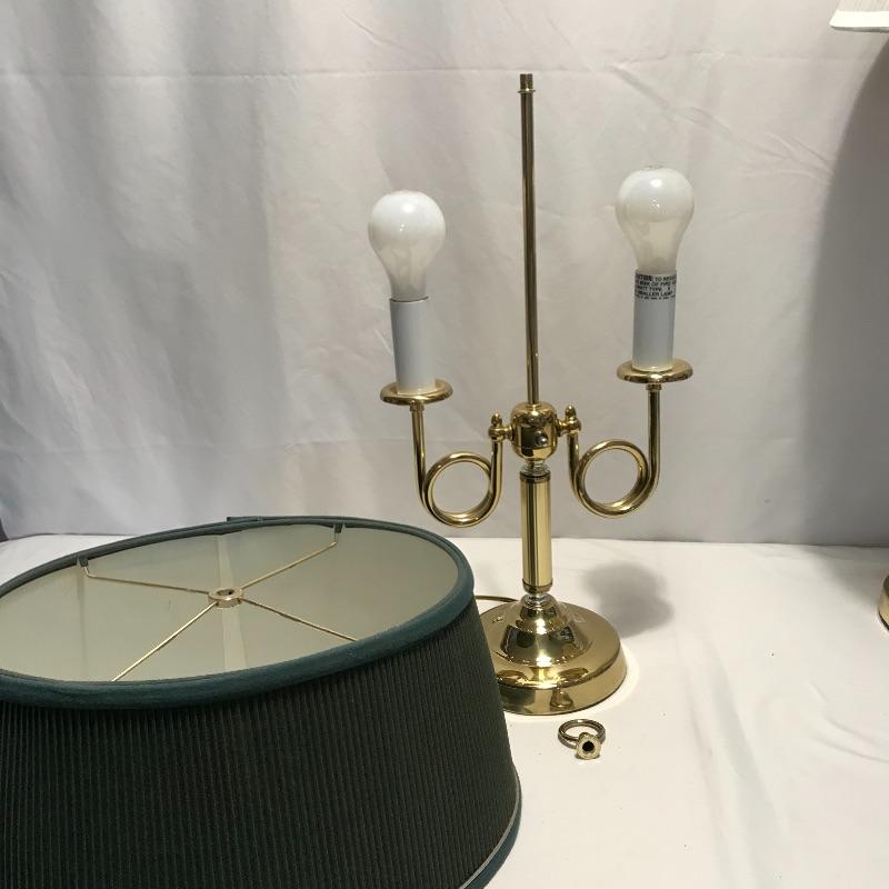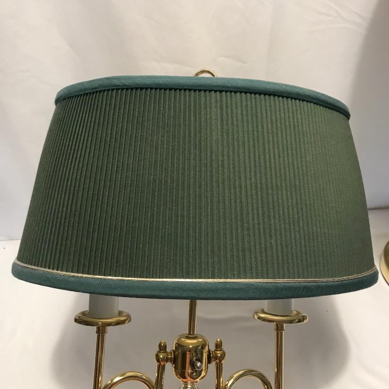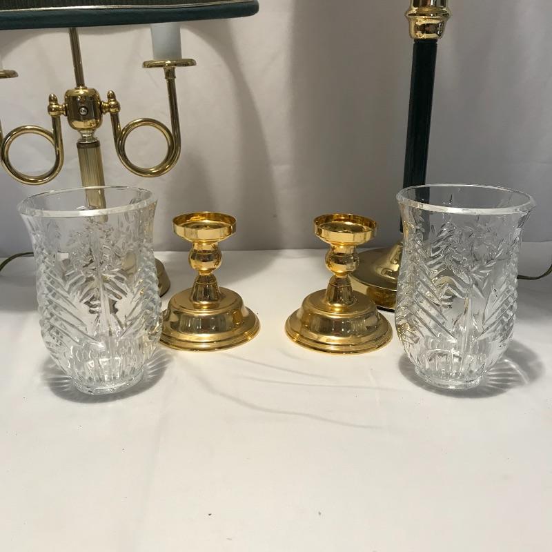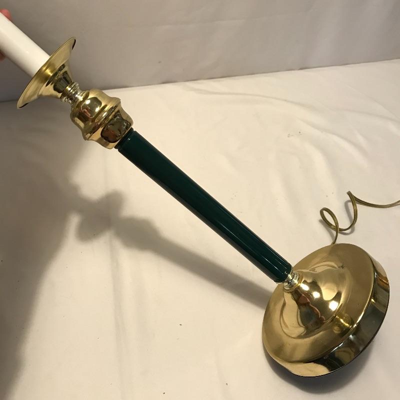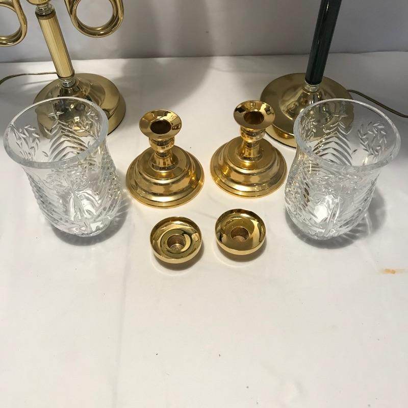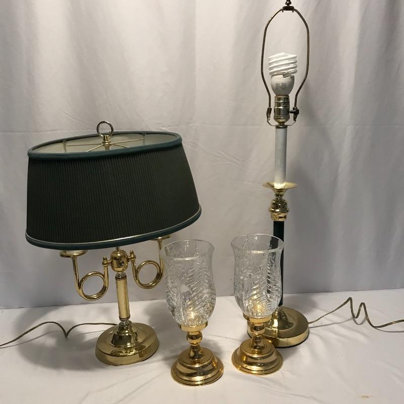 Lovely quartet of brass and forest green to brighten up your space. A super cool double lamp with dark green shade that needs a dusting perfect for an office or home. A 32” tall brass colored metal lamp with a green middle area perfectly complementing the other’s green shade. Lastly two nice candleholders from The International Silver Company with a few different ways to display. See photos. Lamps worked when tested. Local pick up only.