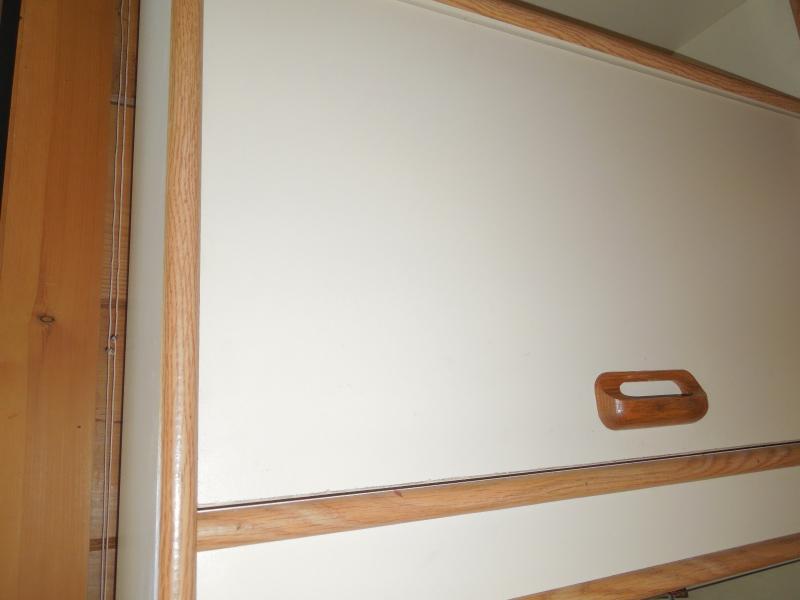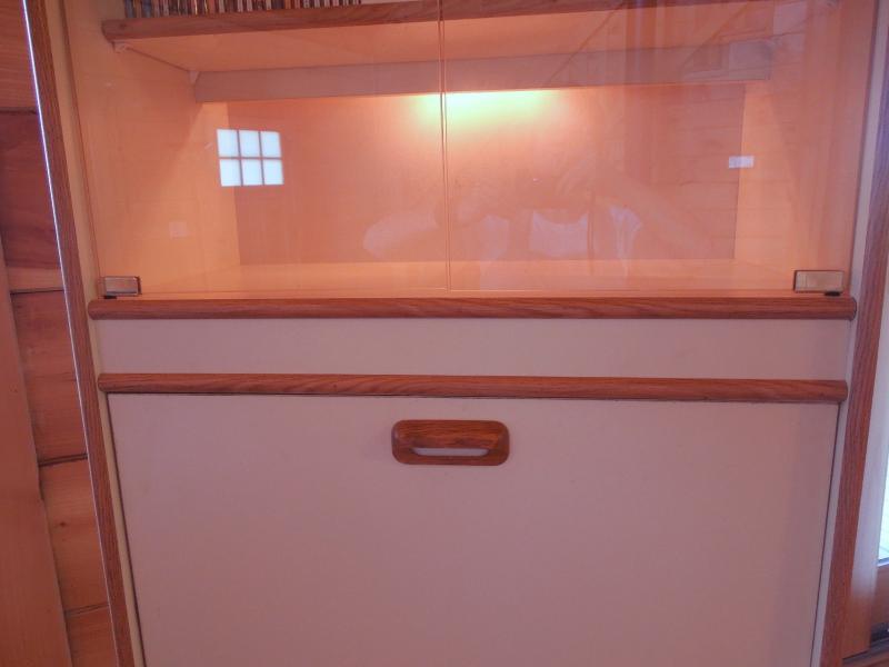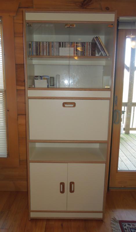 Upper swinging magnetized glass doors on vinyl laminated pressed board cabinet trimmed with oak strips on edges and handles. 75" H x 29" W x 15" D. No damage noted. Needs cleaning. Another identical unit sold separately.