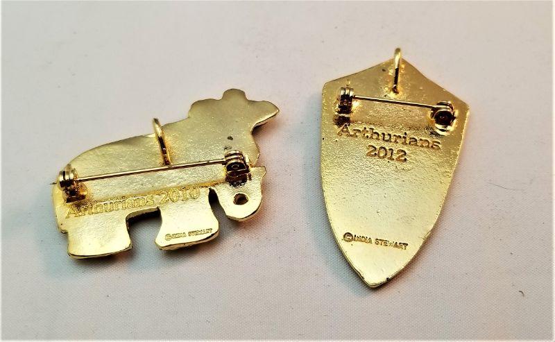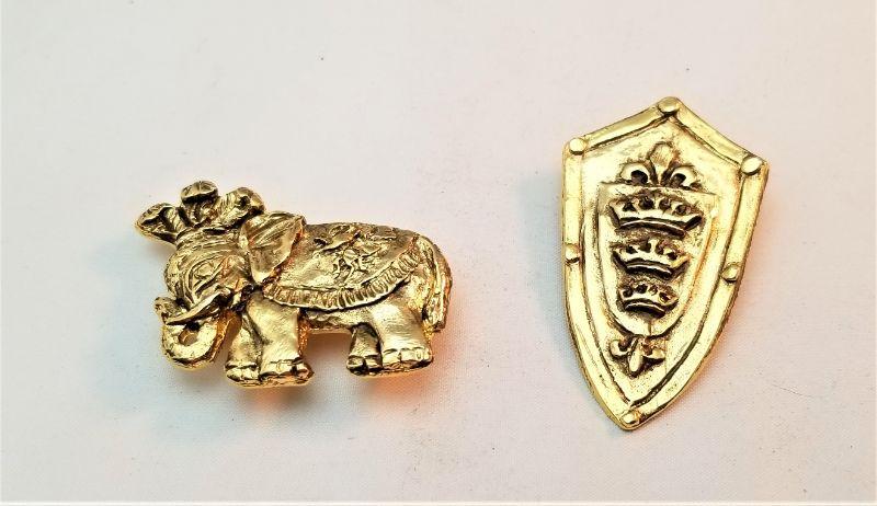 Two Mardi Gras favors from the Arthurians, both designed by India Stewart. The elephant is from 2010 and the shield is from 2012. Good condition. For scale, shield is 2 inches tall.