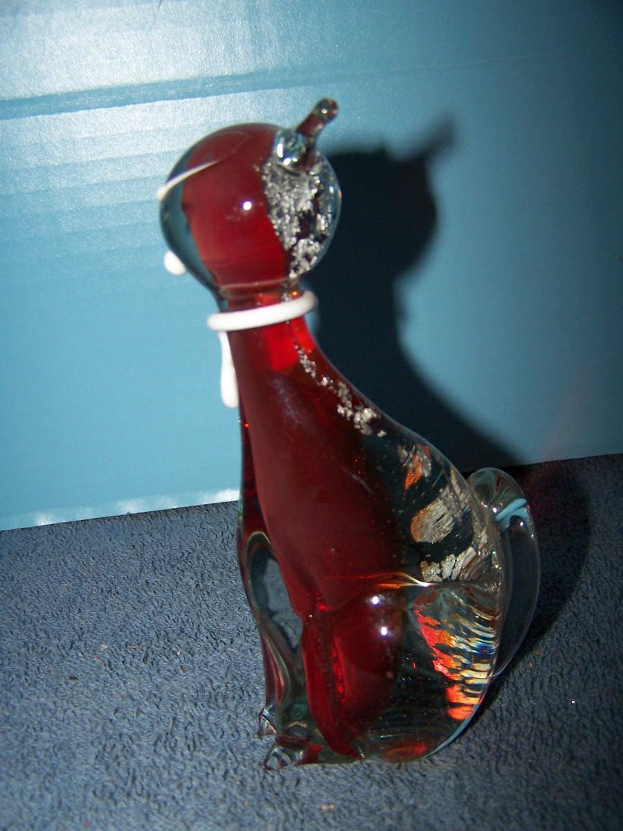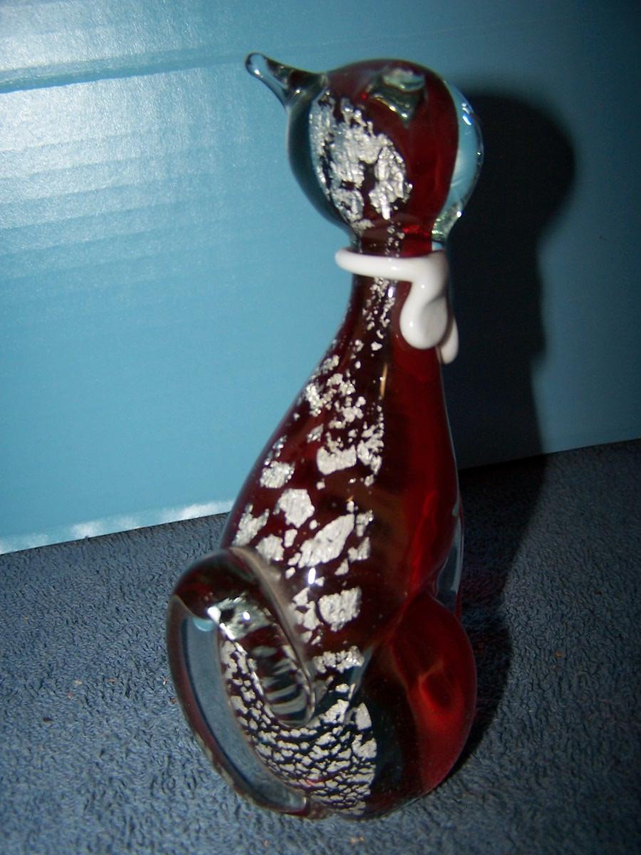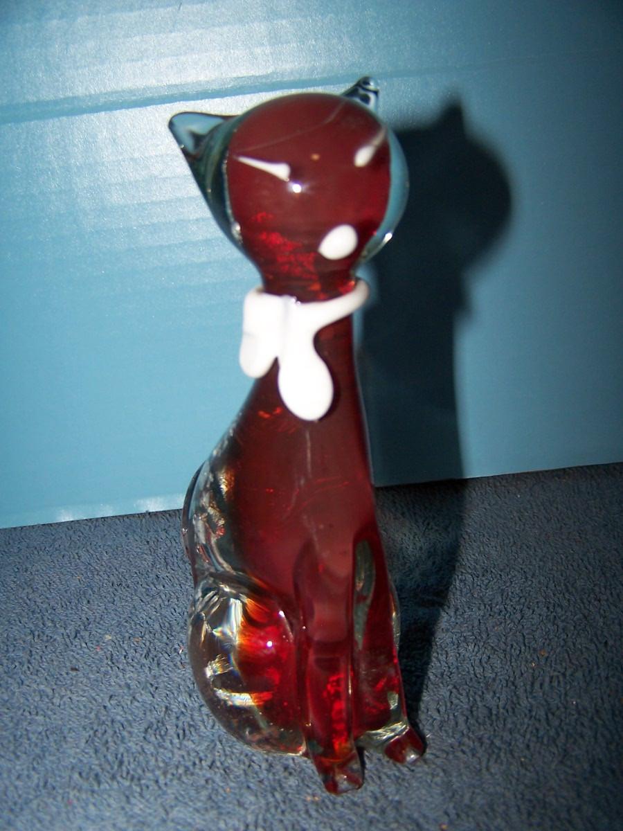 THIS IS LOVELY COLORFUL ART GLASS!!! UNMARKED..CAT-6'' TALL, HAS SMALL FLAKE ON FOOT... OTHERWISE, LIGHT WEAR...