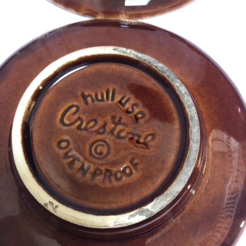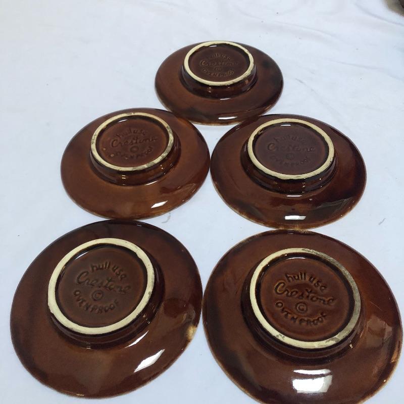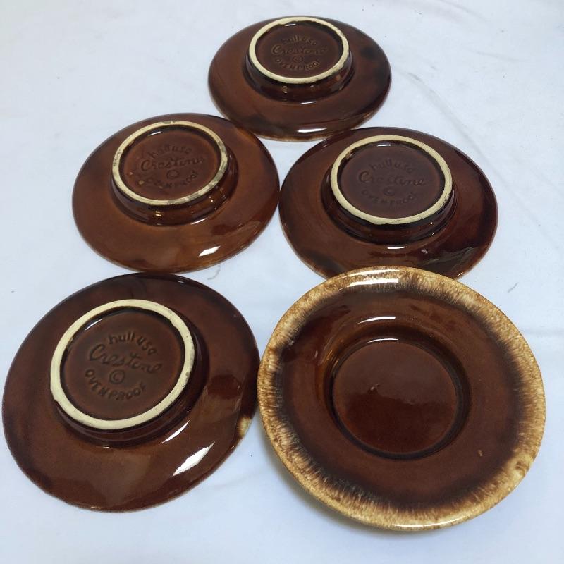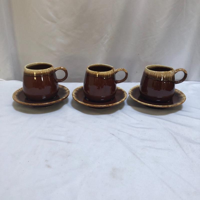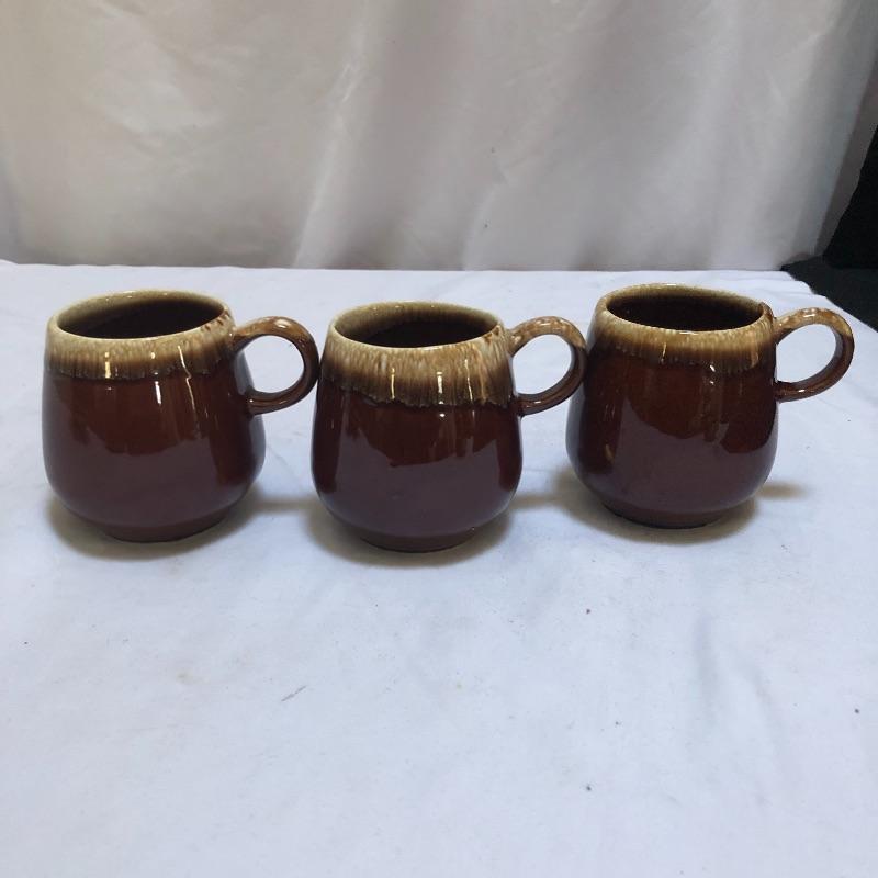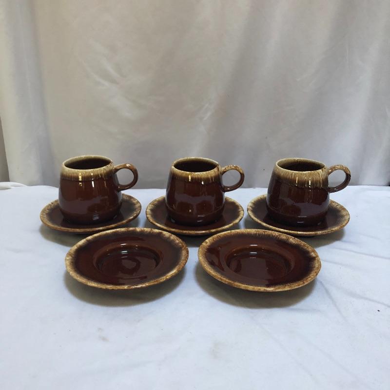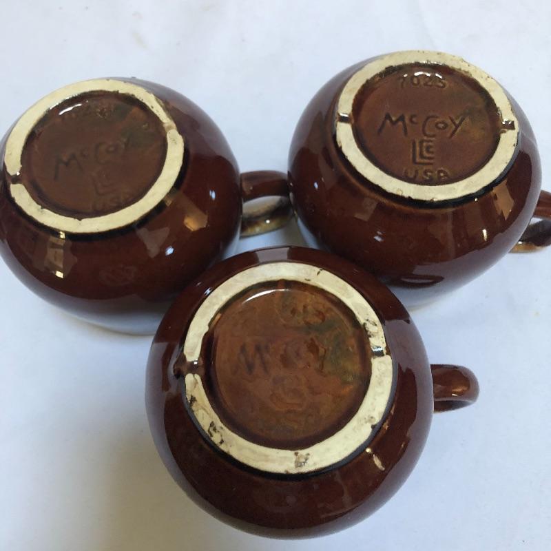 A nice collection of mugs and saucers. Lot includes three McCoy mugs and five Hull saucers that look like they were made to go with the McCoy mugs. Mugs measure 3.5”D x 3.75”.