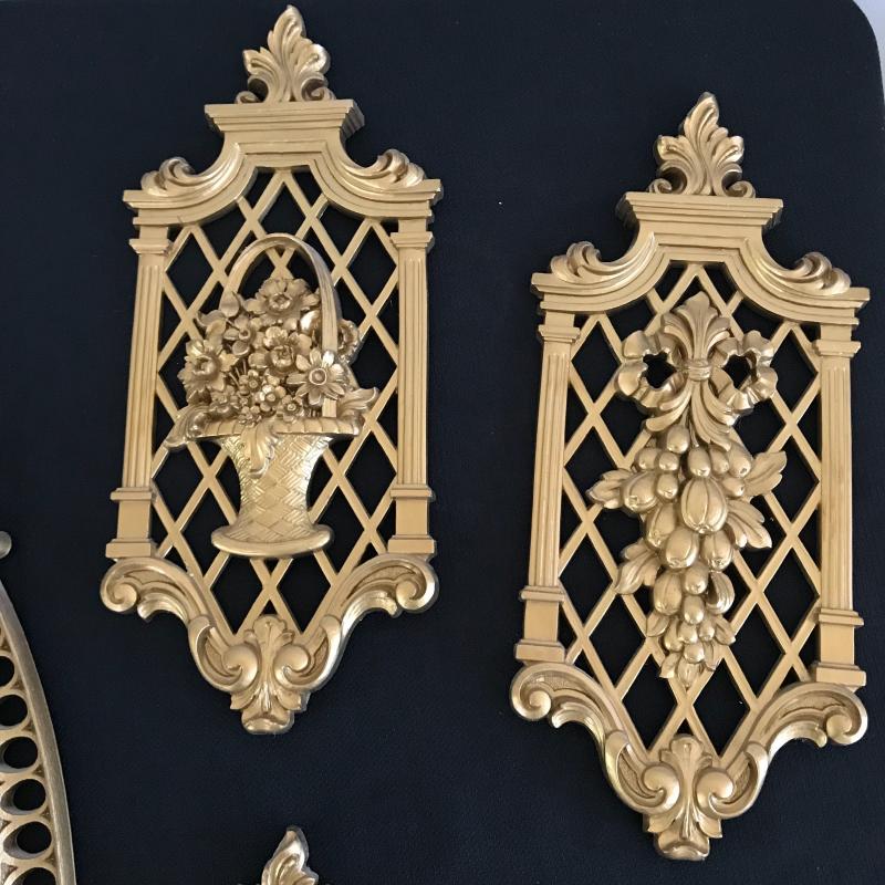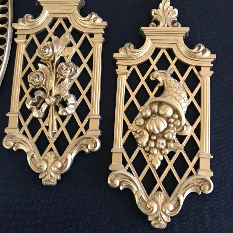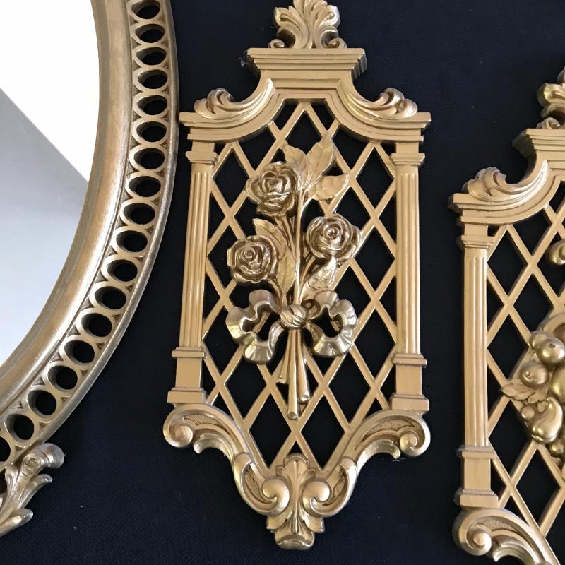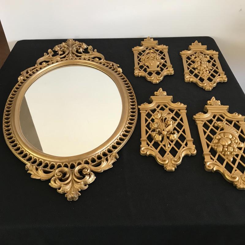 Lot includes vintage gold mirror and four plastic wall hangings. Mirror is approx. 31” tall. No shipping available. Local pickup only in Asheville, NC.