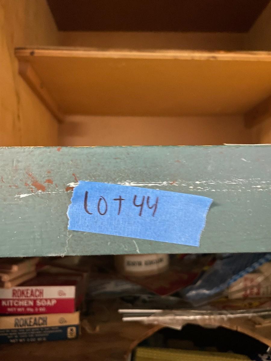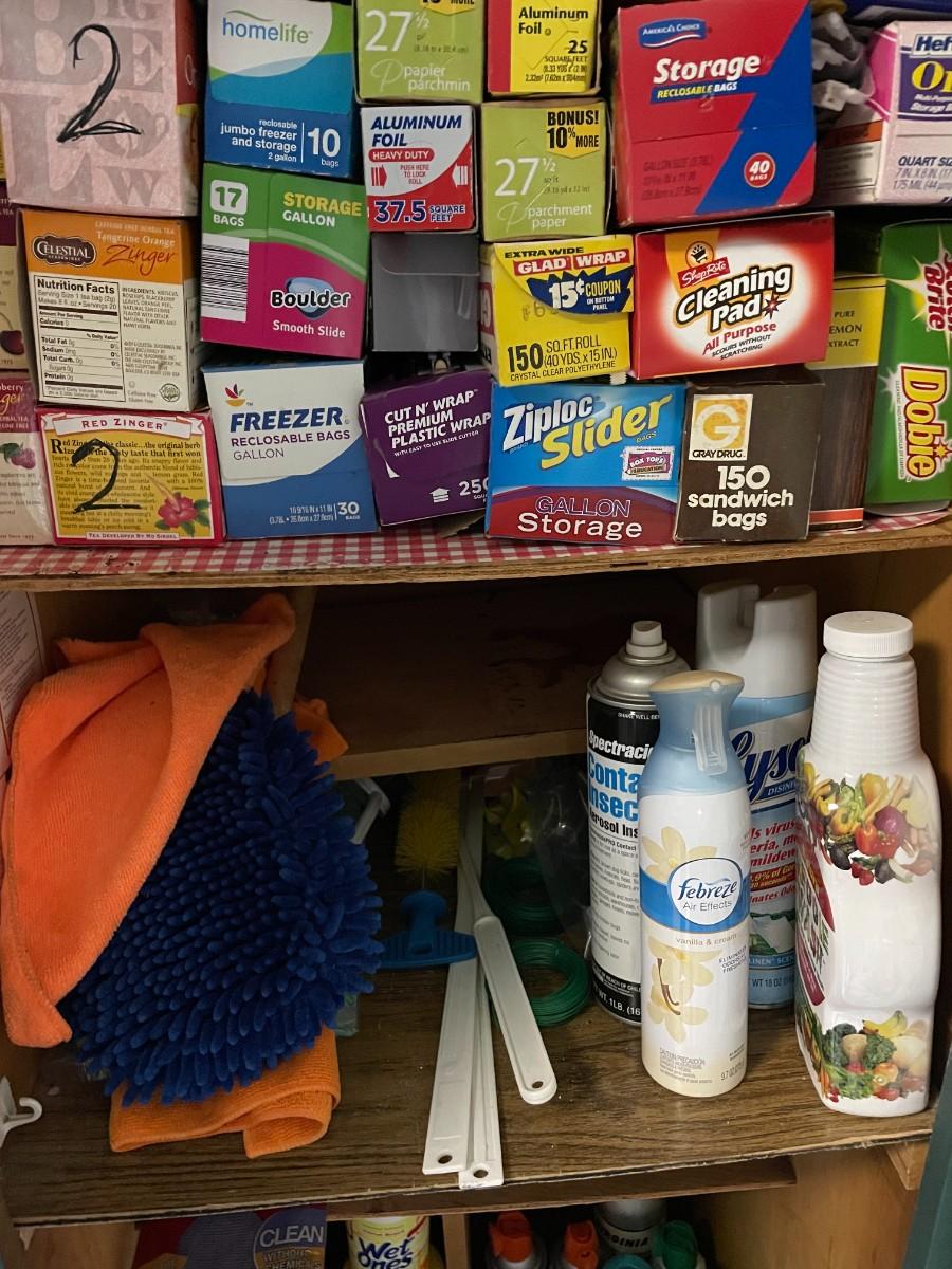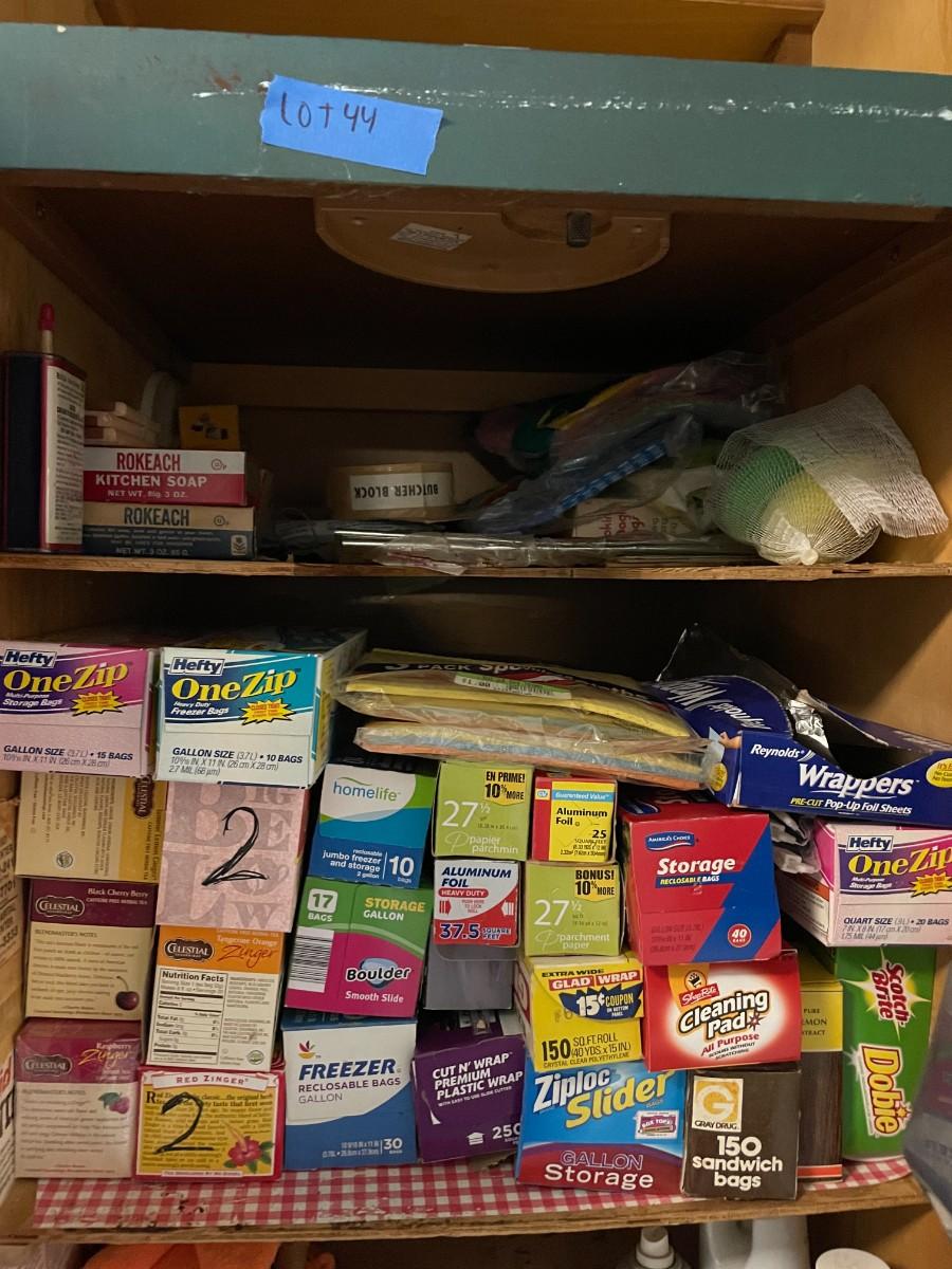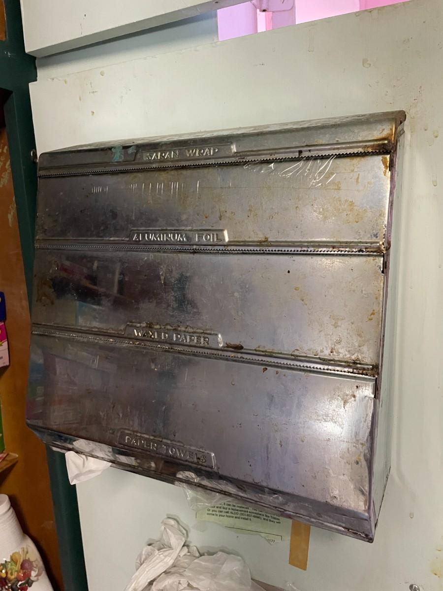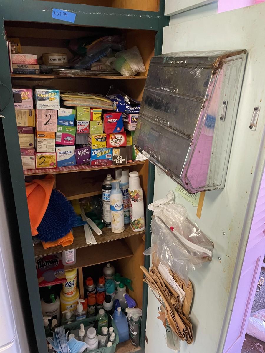 lot 44- Misc. cleaners, hand sanitizer, foil/ plastic wrap, cleaning supplies, vintage metal paper rack