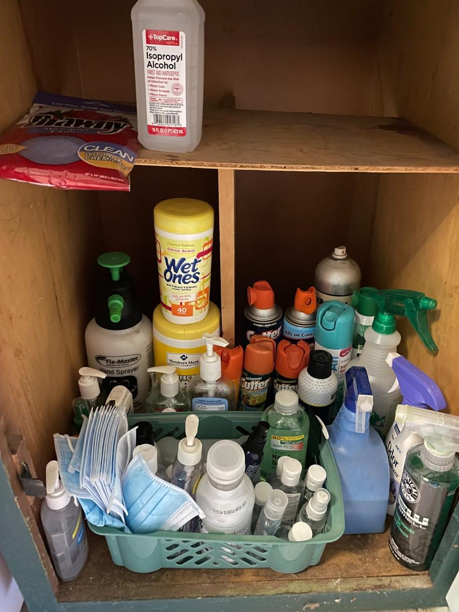 Misc. cleaners, hand sanitizer, foil/ plastic wrap, cleaning supplies, vintage metal paper rack.