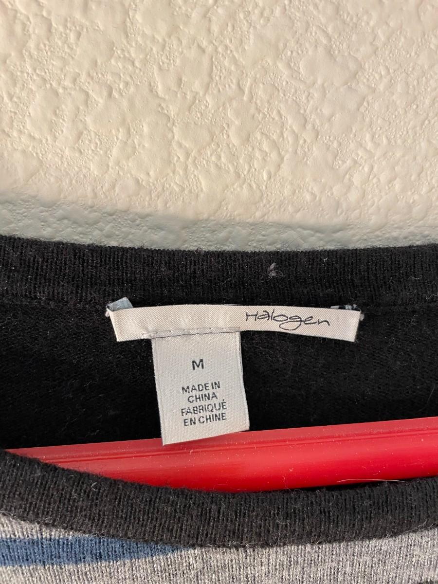 Halogen sweater, size medium. 40% viscose, 30% nylon, 25% polyester & 5% cashmere.