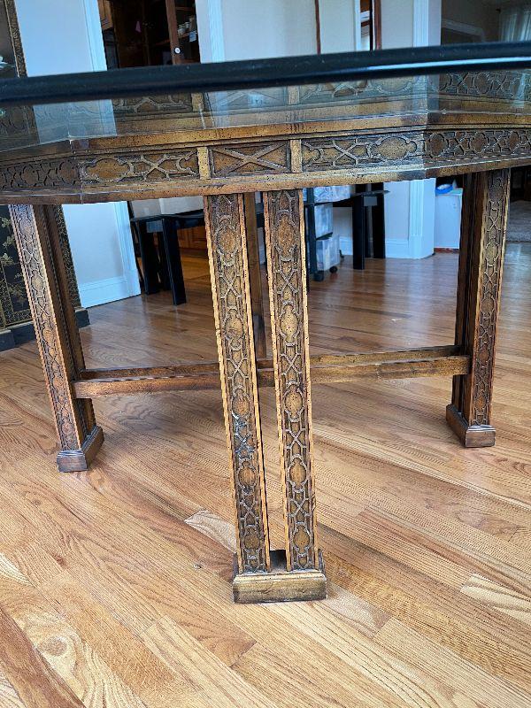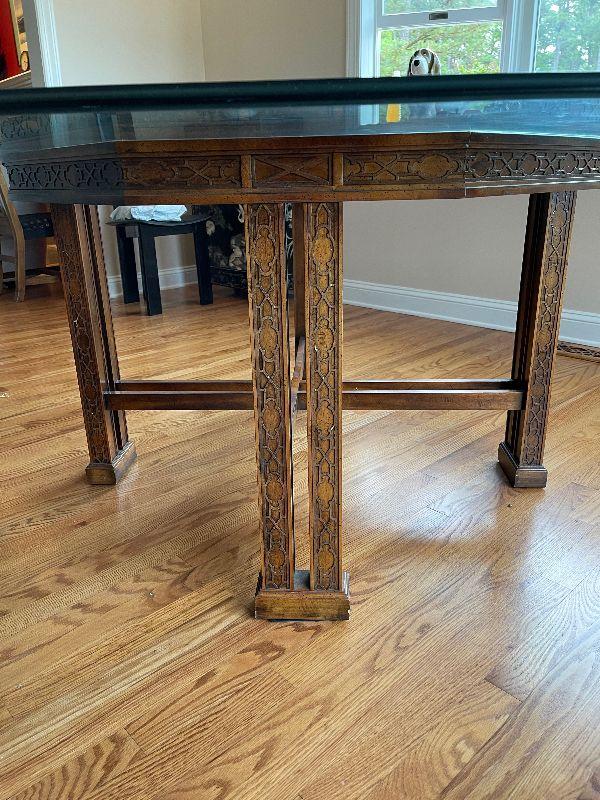 Octagonal Oriental Glass Top Dining Room Table with Carved Wood Base