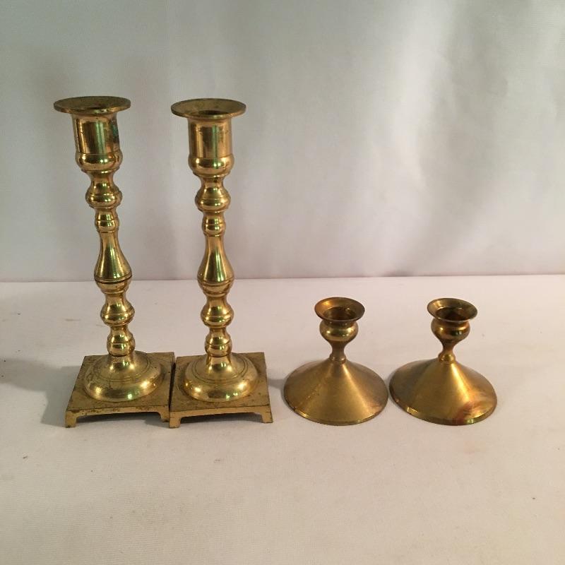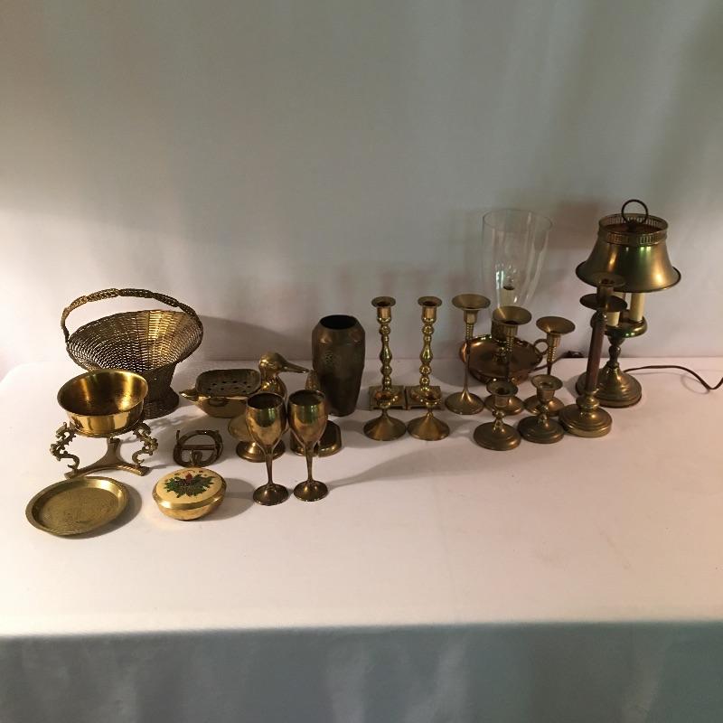 Oodles of brass. Lot contains basket, key hanger, pair of glasses, bookends, 10 candle stick holders, duck soap holder, pair of lamps, candleholder, tall cup and small plate. For the brass lovers out there.