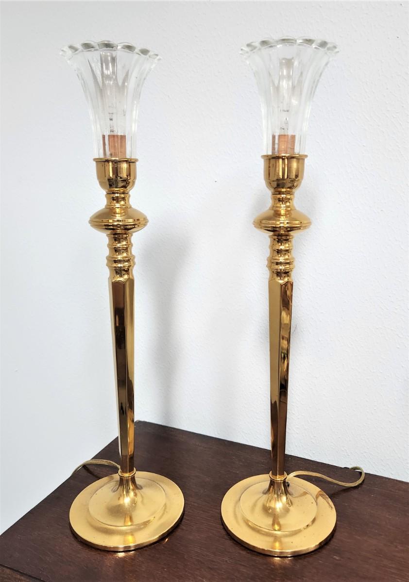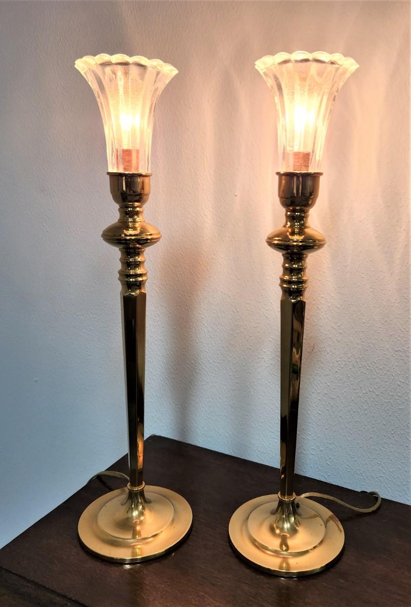 Pair of handsome torchiere-style table lamps, brass finish, switch on cord. Each stands about 20" tall. Good working condition.