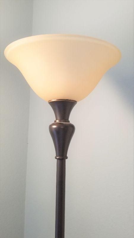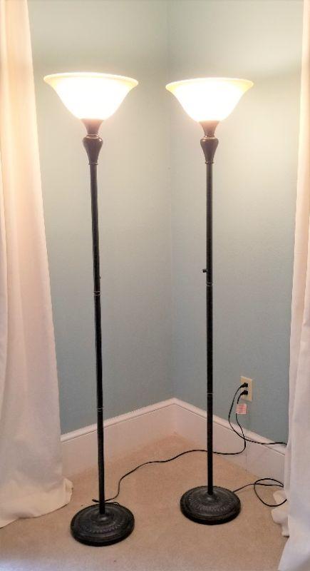 Good pair of contemporary floor lamps - glass shades - good working condition. 71" tall.