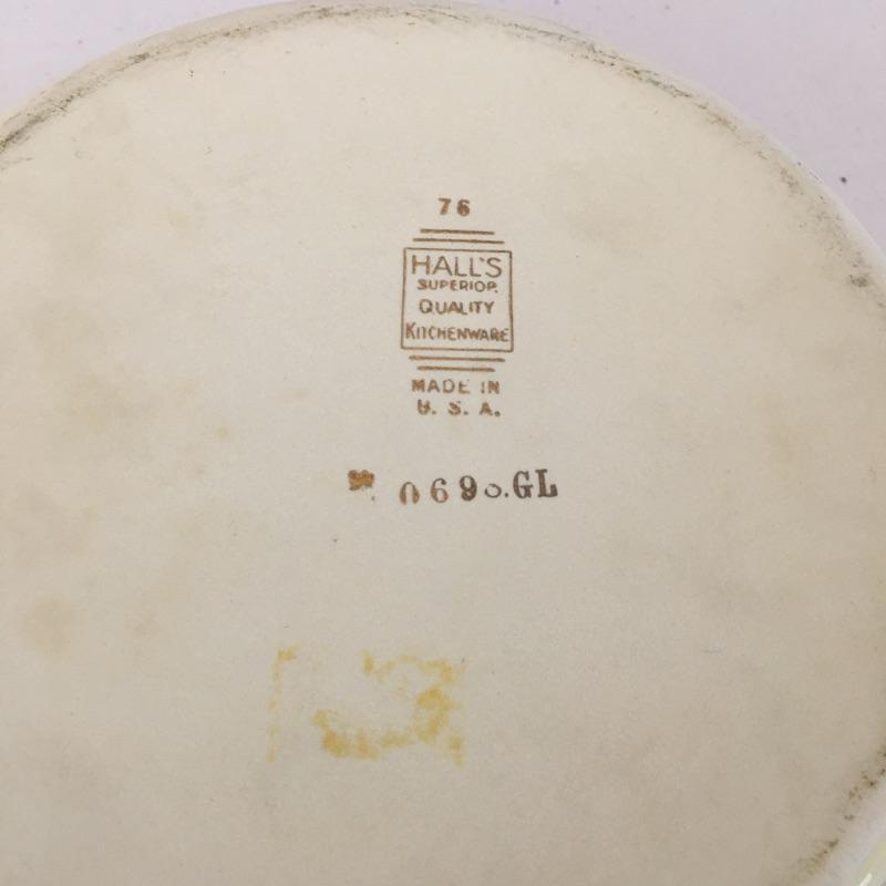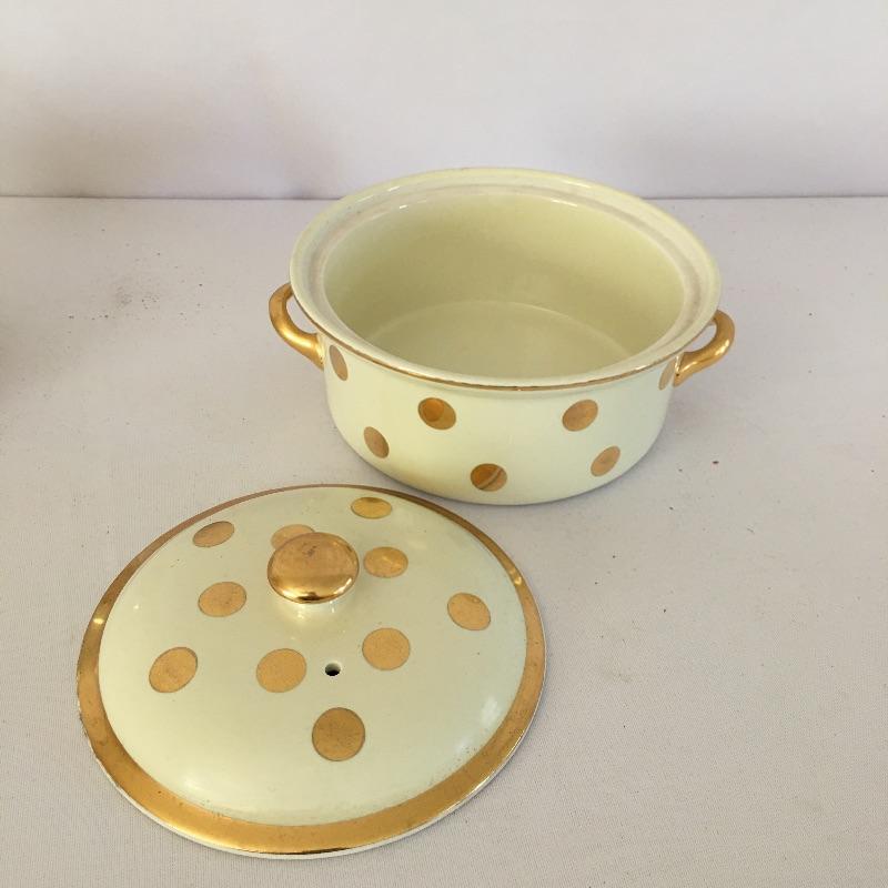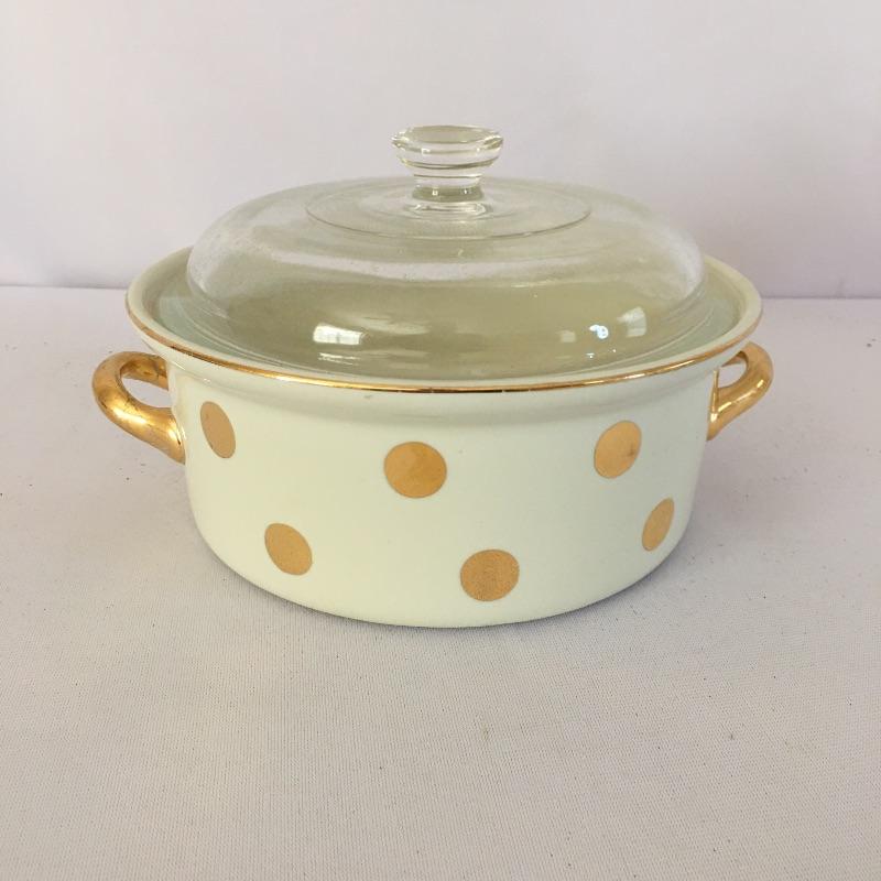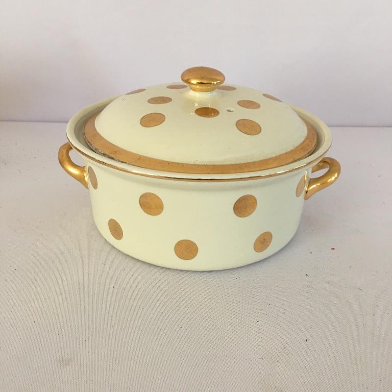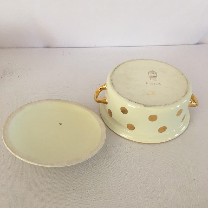 Do you need more MCM style in your kitchen? Of course you do! Pair of Hall gold leaf polka dot bowls with lids and handles. One lid is clear, it may be an aftermarket addition. Both bowls are signed Hall. Bowls measure 8.5”D x 5.5” tall.