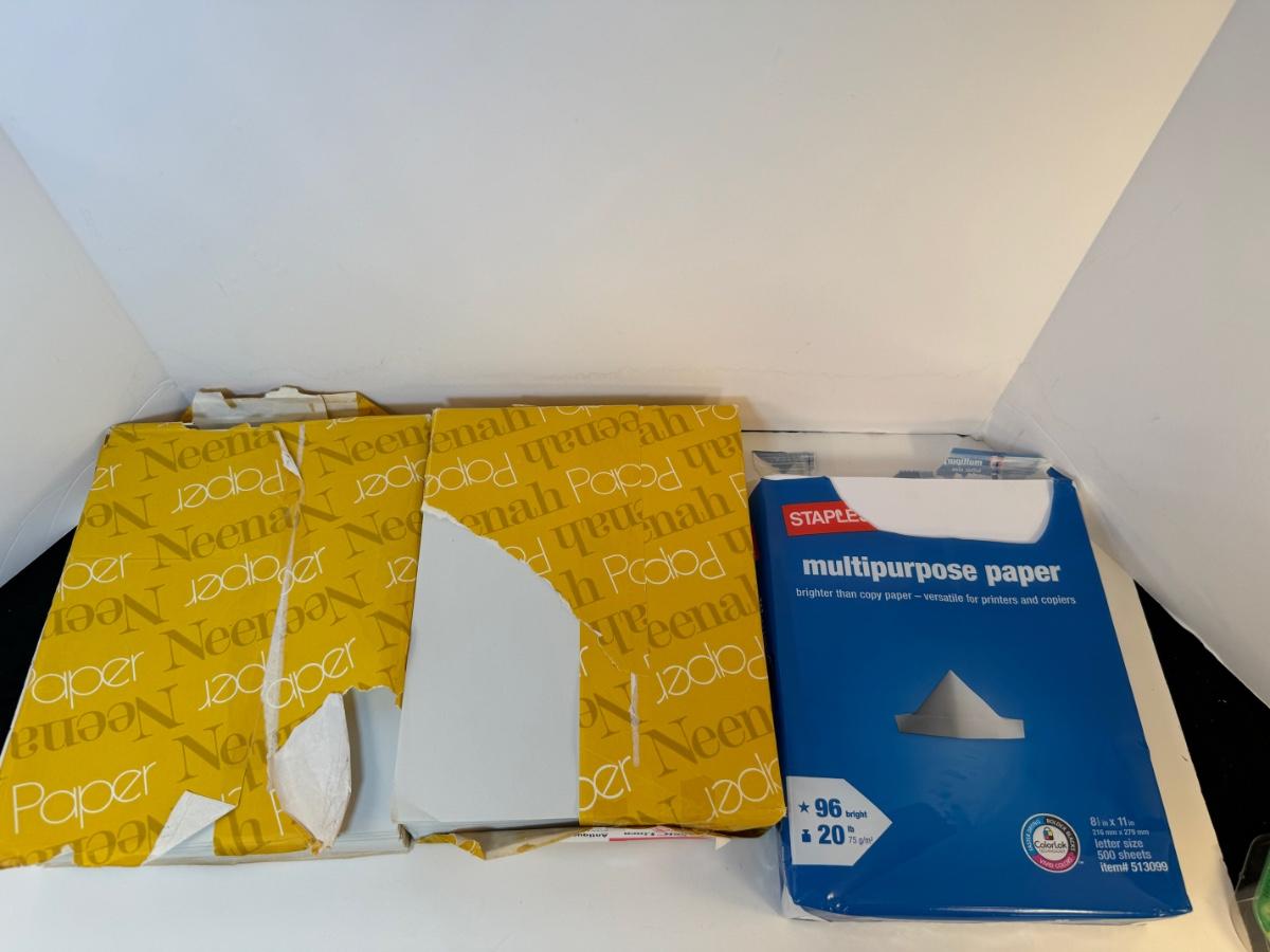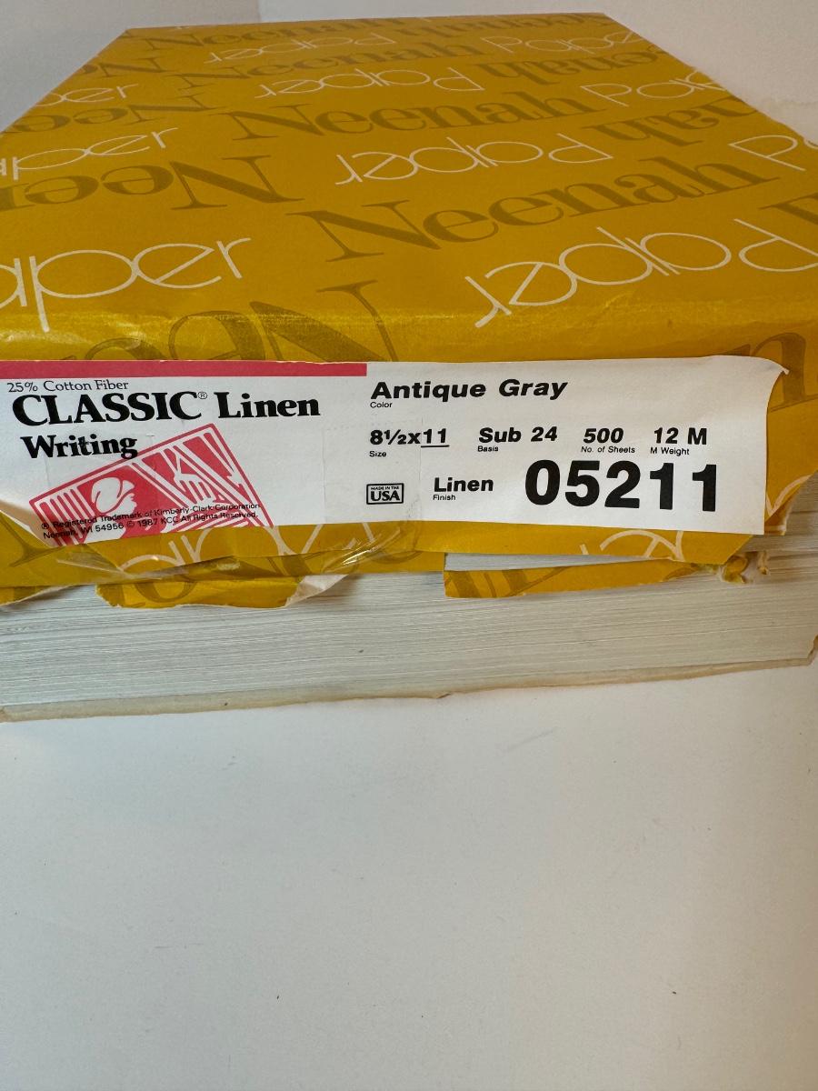 Includes 2 500 sheet packs(partially used) 8 1/2” x 11” Antique Gray 25% cotton fiber Neenah Paper classic linen writing paper and a partially used pack of 500 sheets 20lb multipurpose paper.