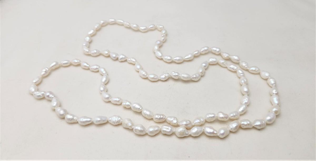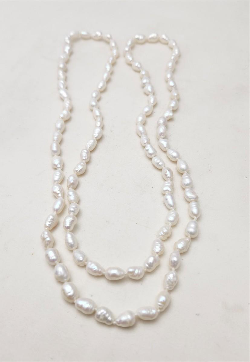 Nice Freshwater Natural Pearl necklace - measures 34" long - no clasp. Meant to wear long or double once around the neck. A classic! I would be willing to ship this - you pay priority postage.