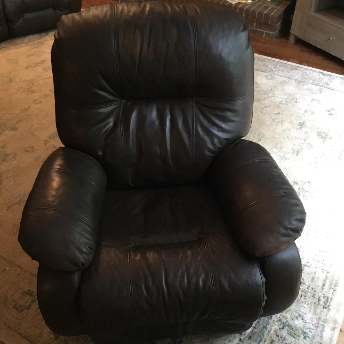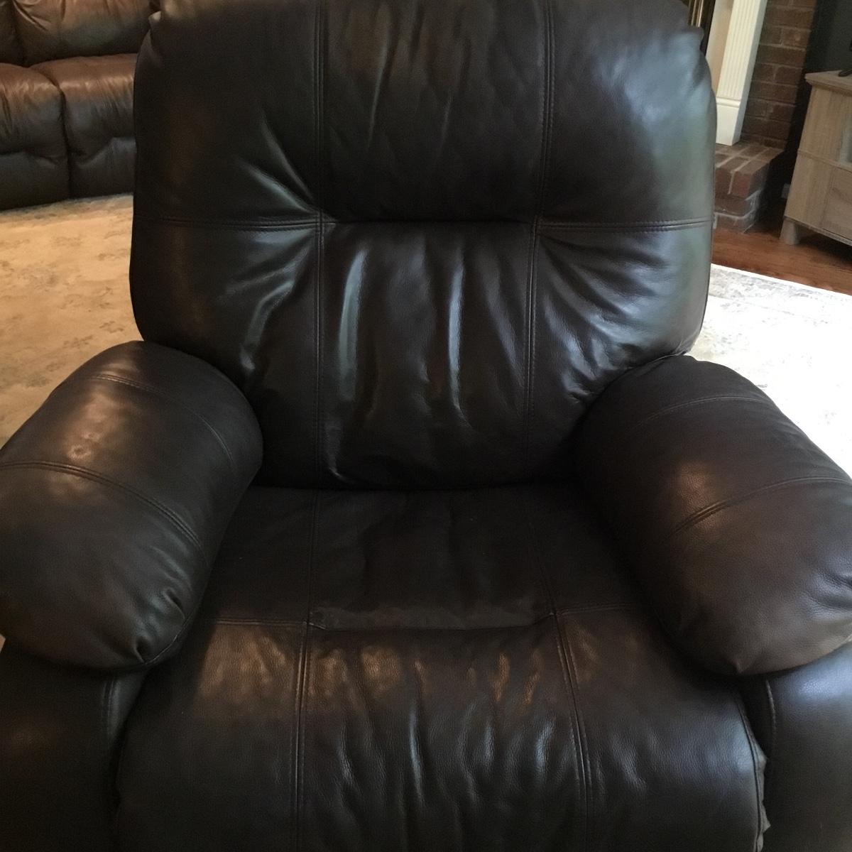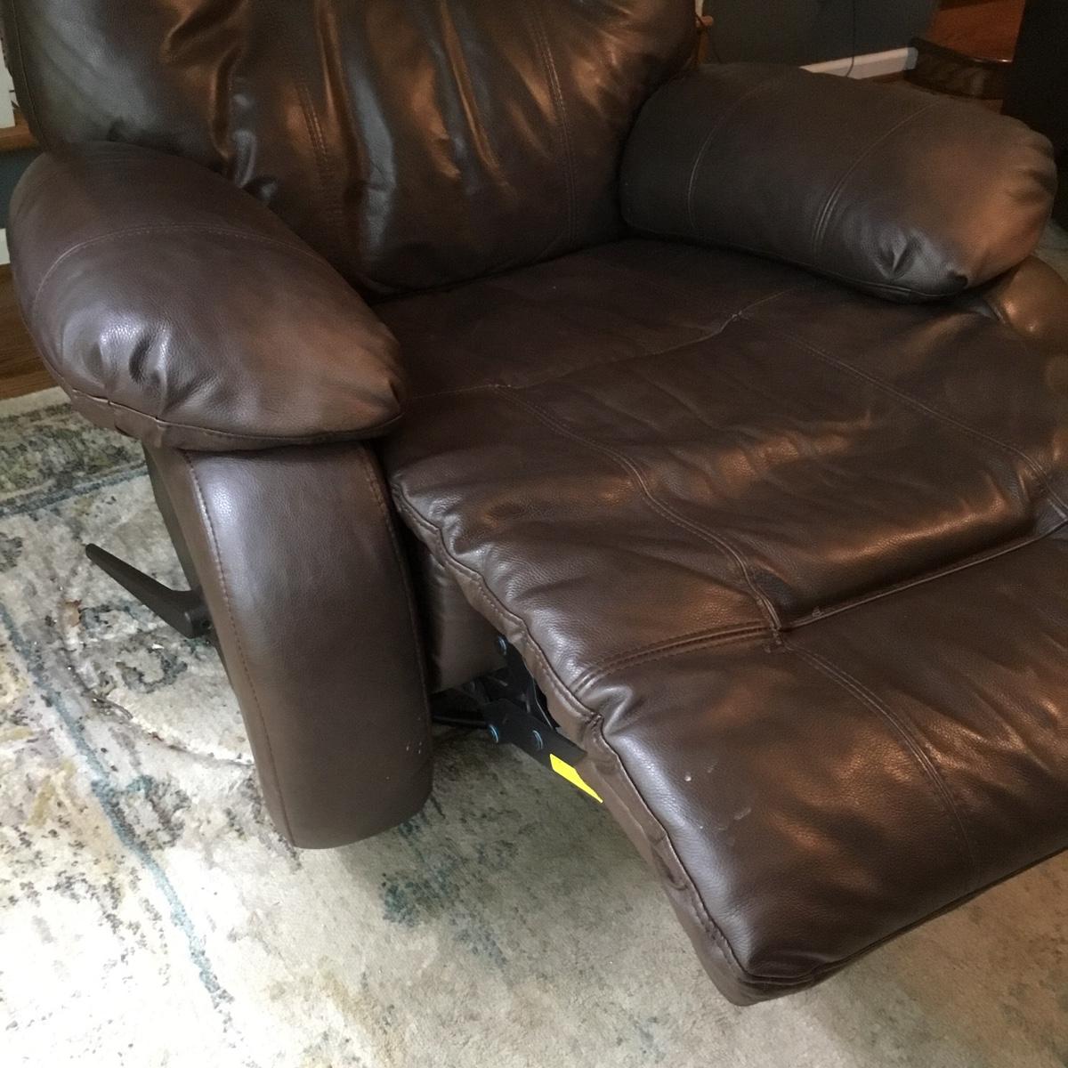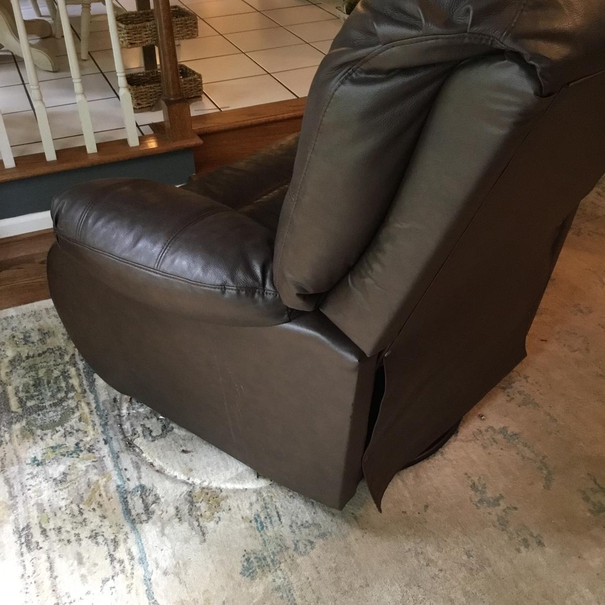 Lot includes a leather-like reclining chair that matches the reclining couch included in lot 43. Be sure to take a look. In good condition, rocks and swivels. Chair seat measures 25”x23”x16. Seat back stands 44” tall and can recline to approx. 90” long. See photos. Local pickup only.