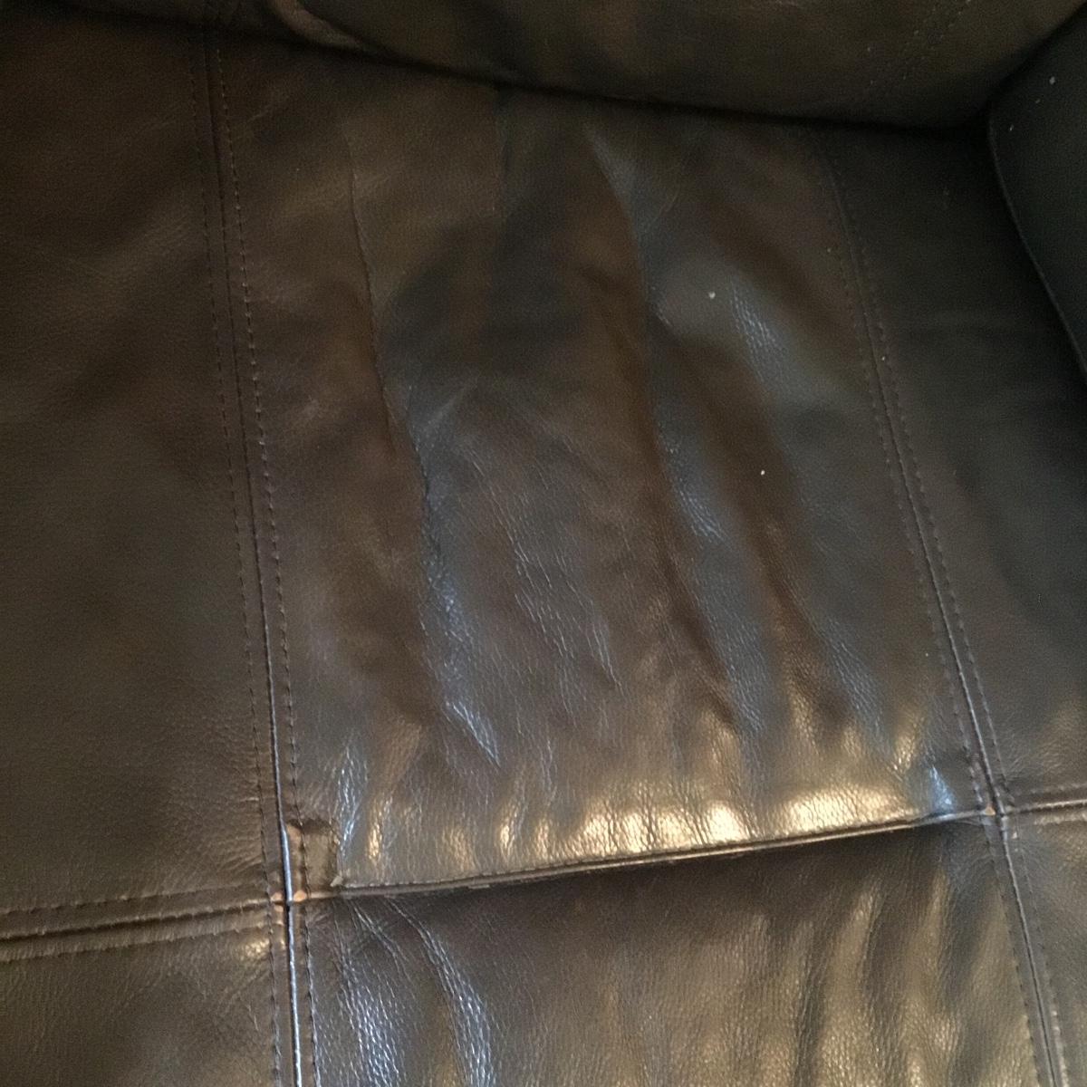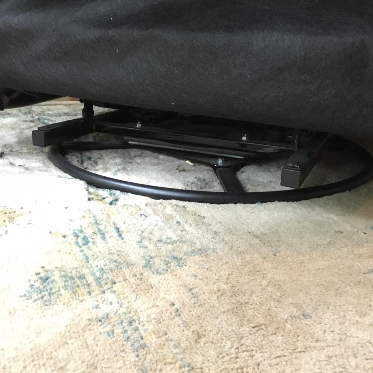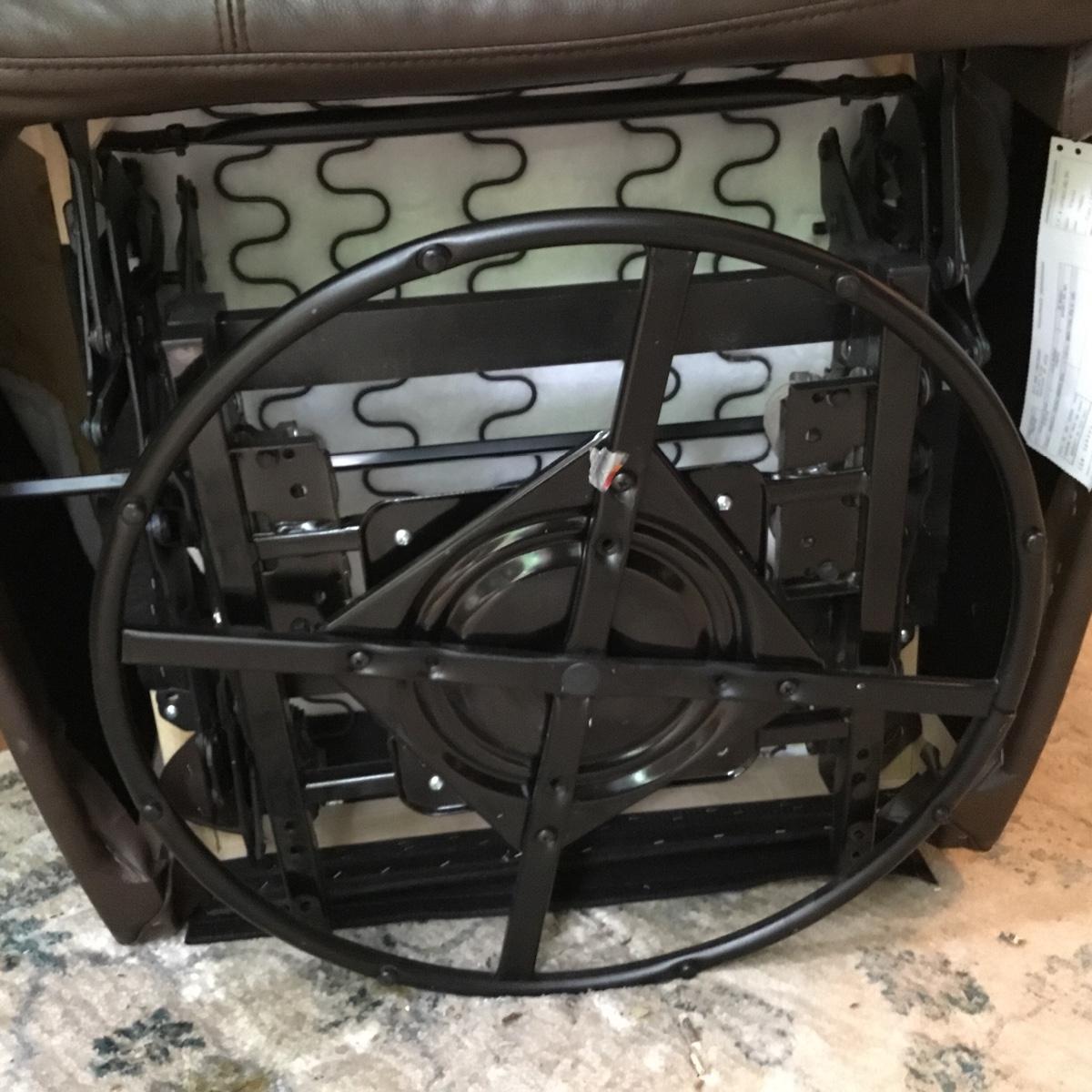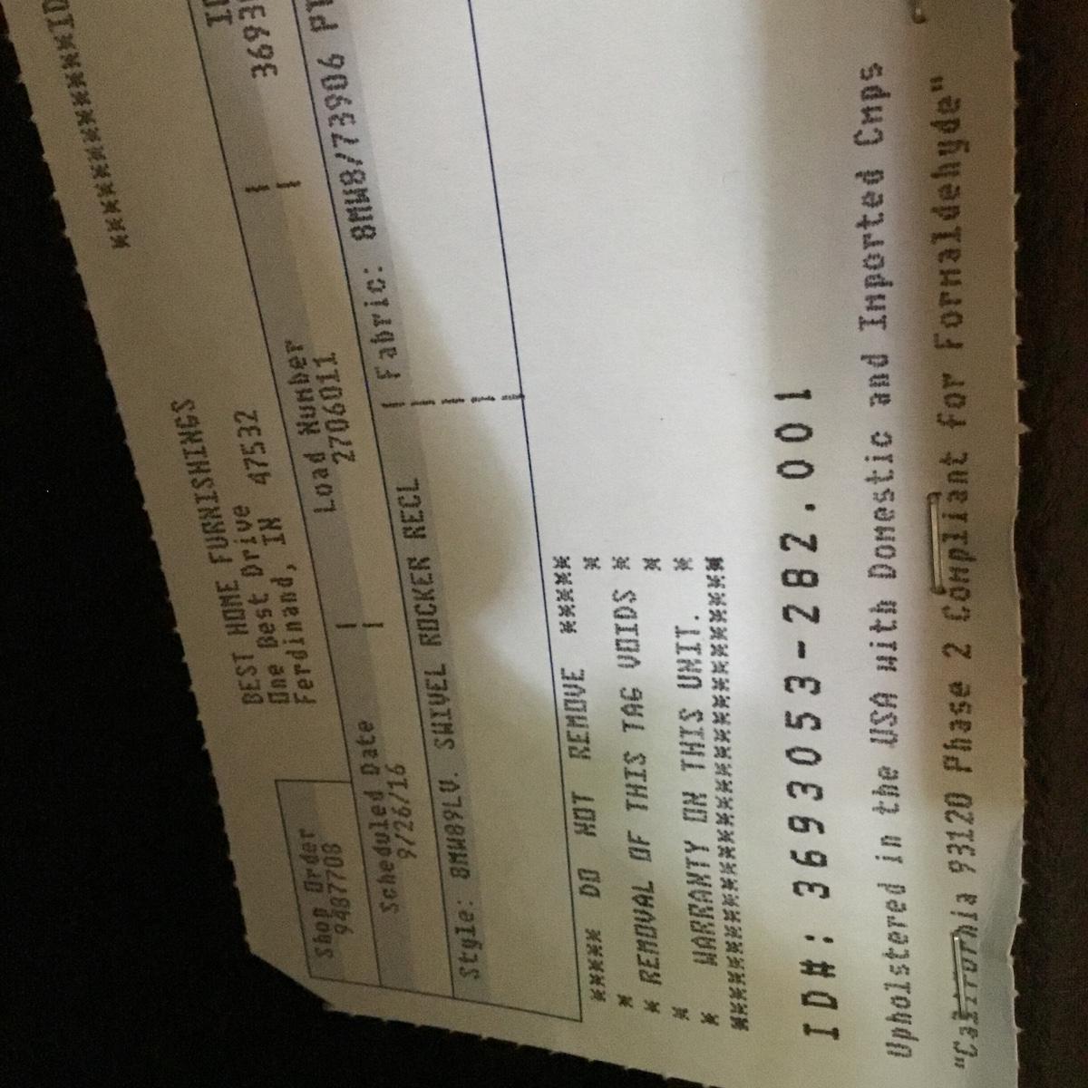 Lot includes a leather-like reclining chair that matches the reclining couch included in lot 43. Be sure to take a look. In good condition, rocks and swivels. Chair seat measures 25”x23”x16. Seat back stands 44” tall and can recline to approx. 90” long. See photos. Local pickup only.