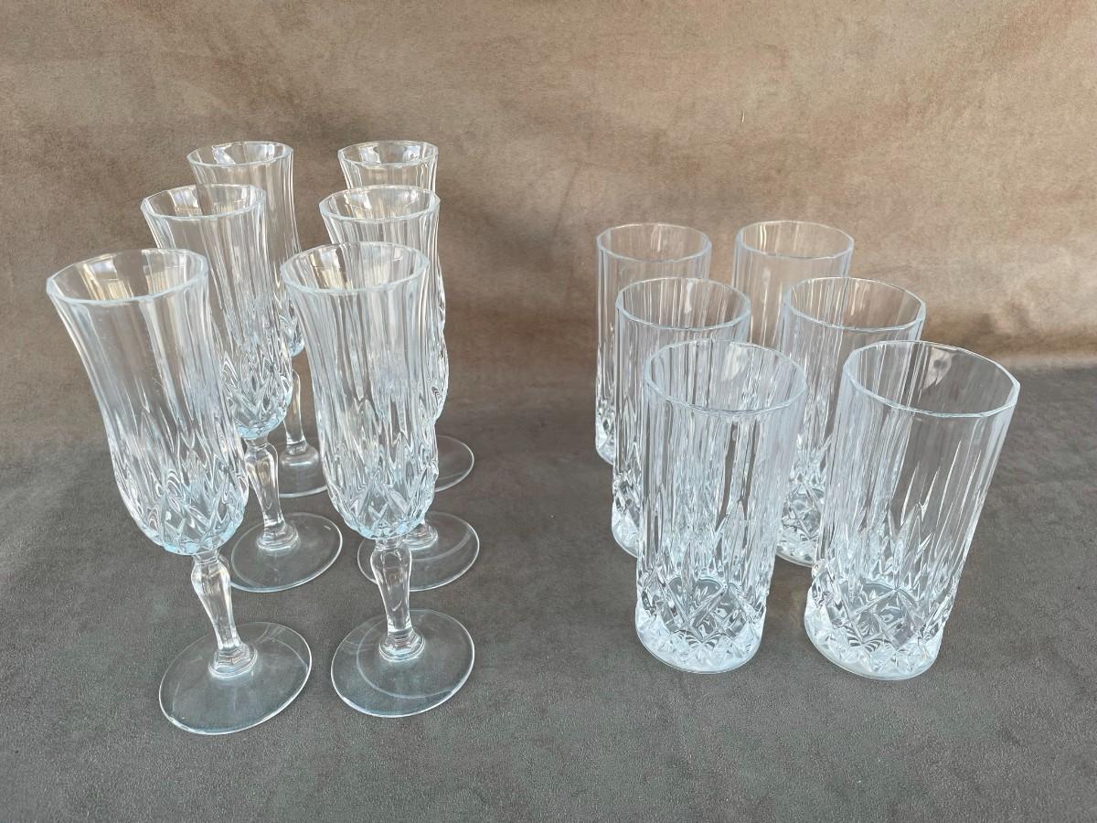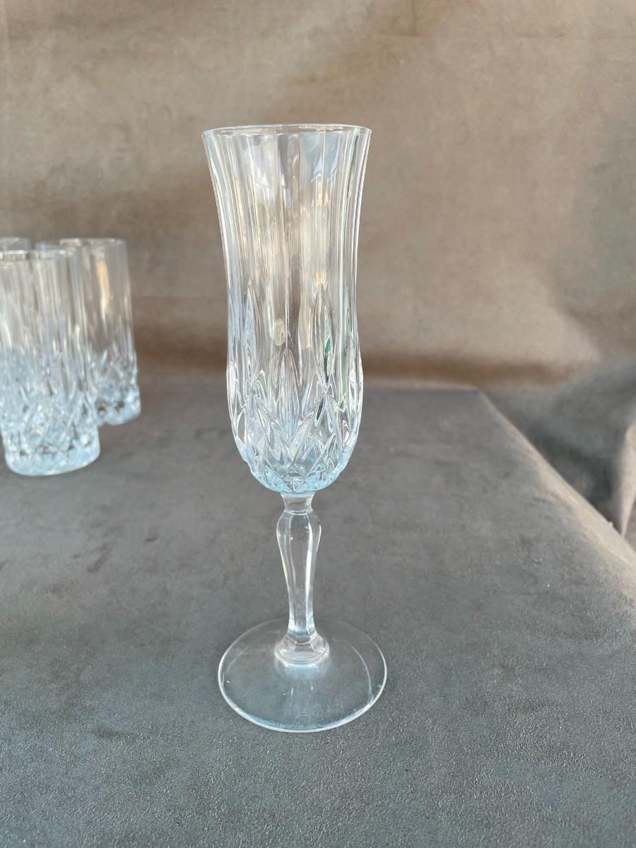 Six Crystal Champagne Glasses & Six Water Glasses.