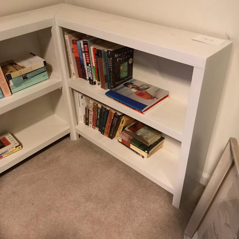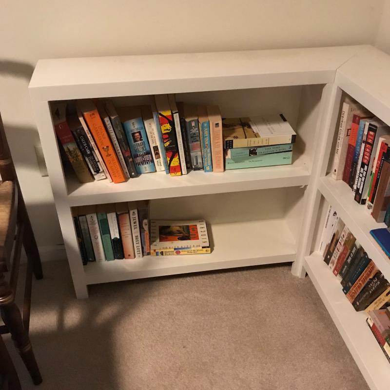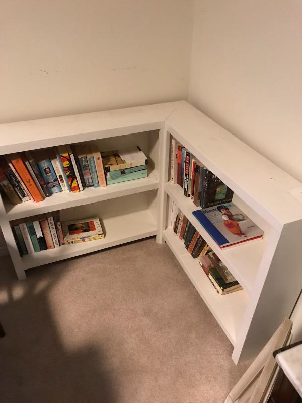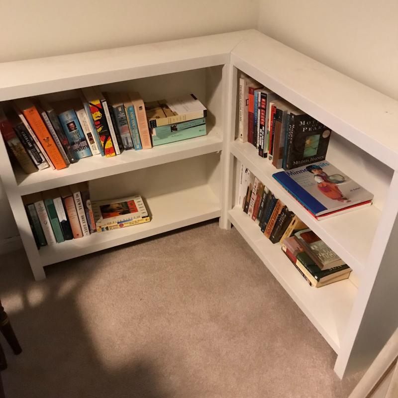 This unique hand built corner bookcase is a great solution to limited space issues. Does not include books. Approx. 39” long from each end to wall, 8” deep, and 30” tall.