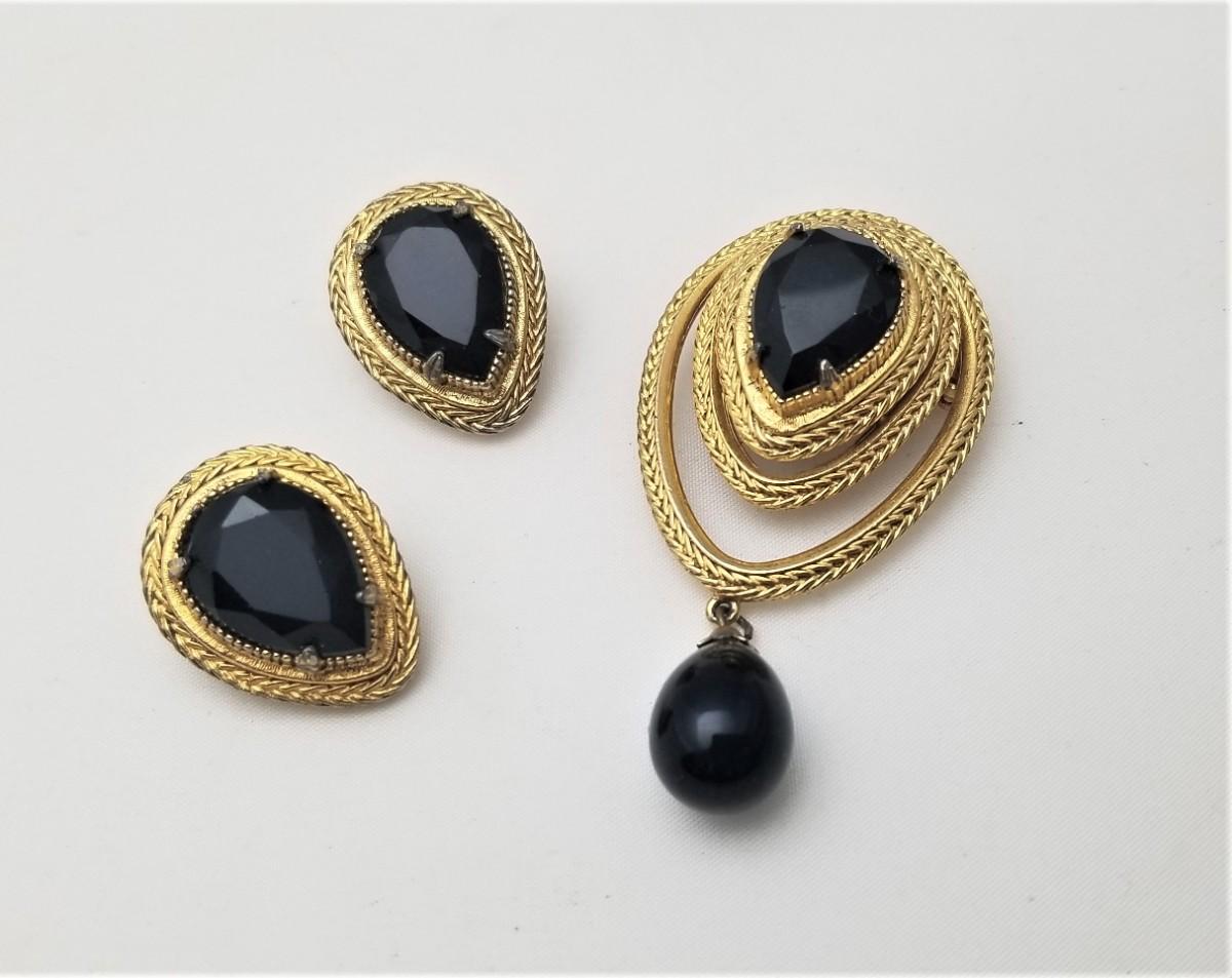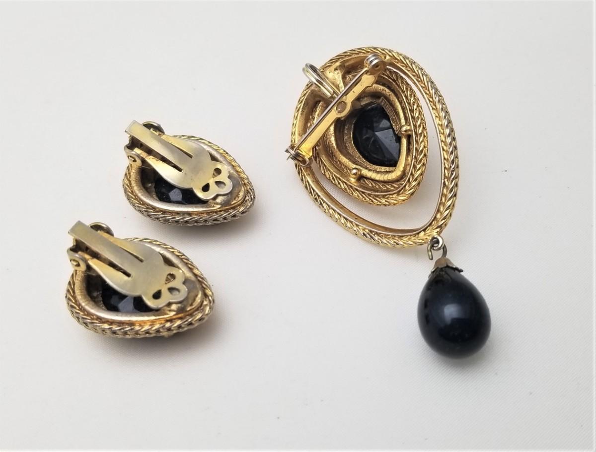 Brooch is also an enhancer, earrings are clip - marked FLORENZA - featuring prong set, faceted black rhinestones. A classic - very good looking. Brooch is 2.5" long. Excellent condition.