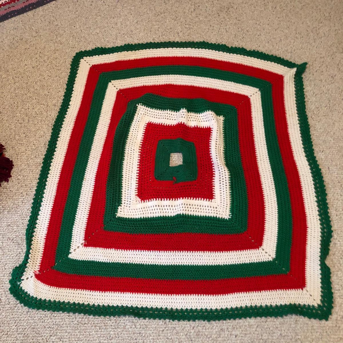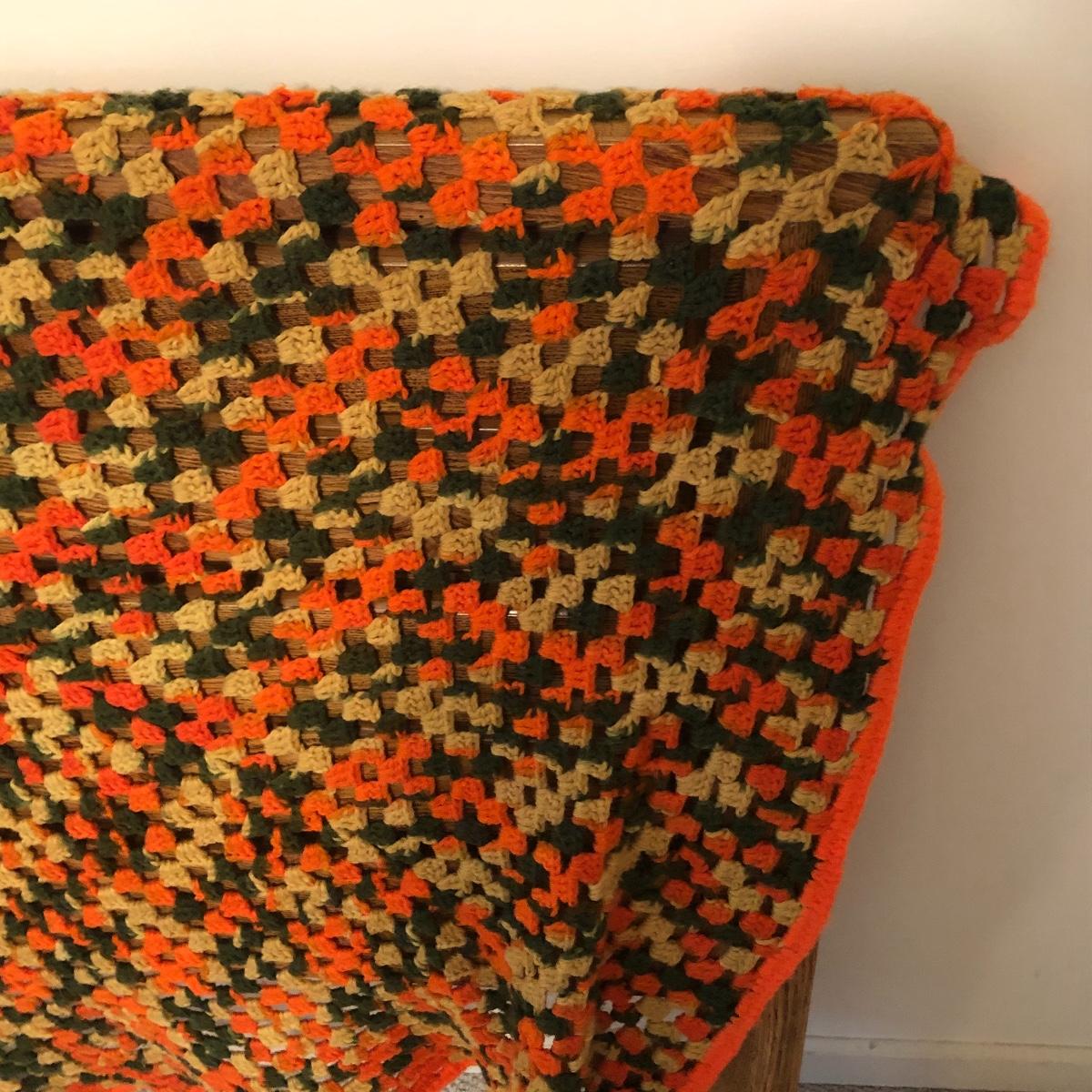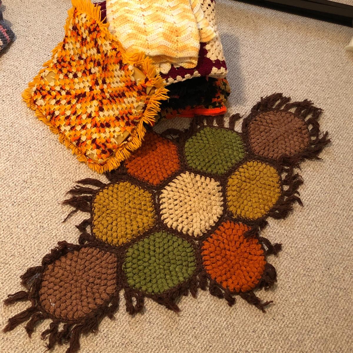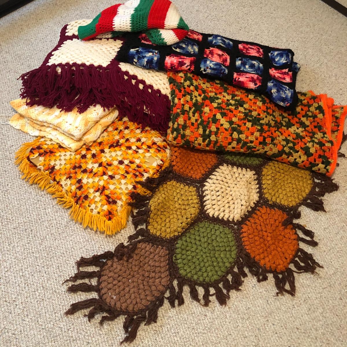 The majority of the blankets in this lot are vintage, some with a great retro look. The unique retro knitted table cloth comes in brown, green and orange wool. Also included is a red, white and green crocheted tree stand cover and a retro crocheted pillow which does have a tear on the one side.
