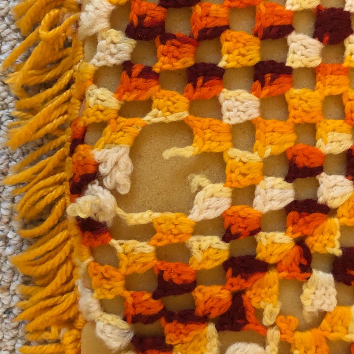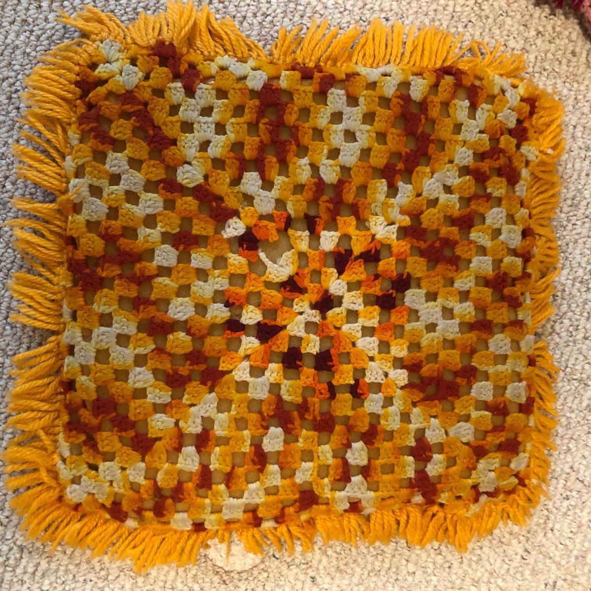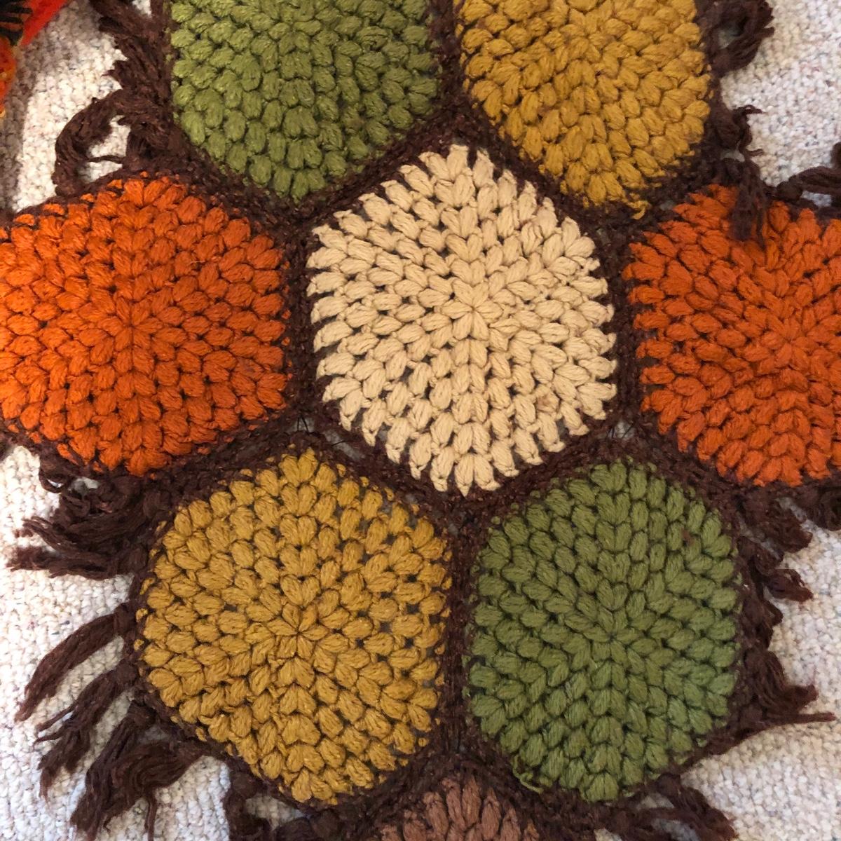 The majority of the blankets in this lot are vintage, some with a great retro look. The unique retro knitted table cloth comes in brown, green and orange wool. Also included is a red, white and green crocheted tree stand cover and a retro crocheted pillow which does have a tear on the one side.