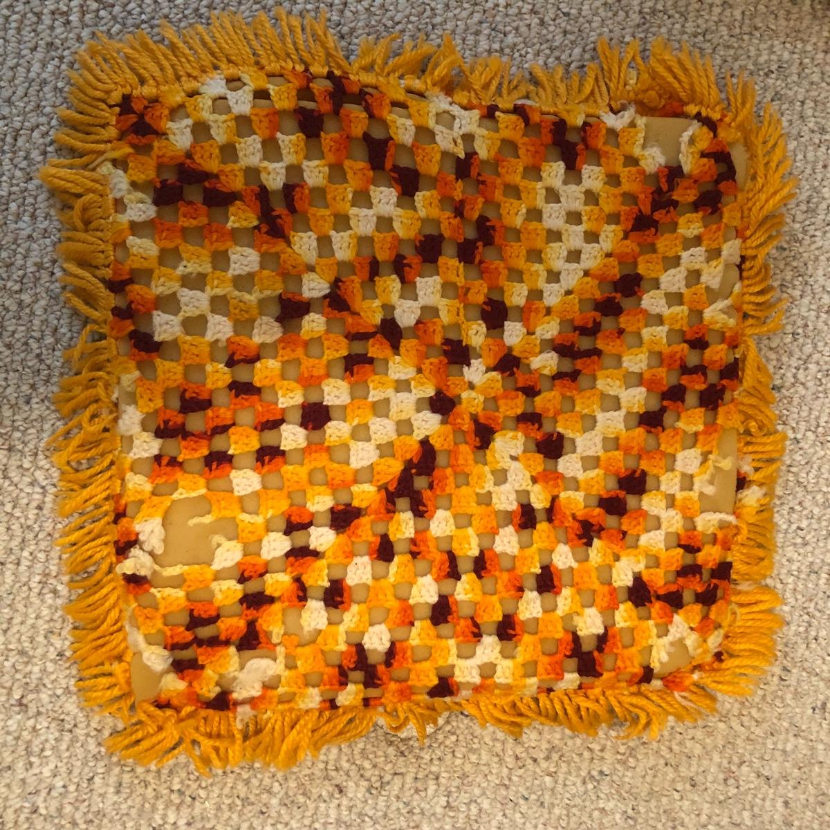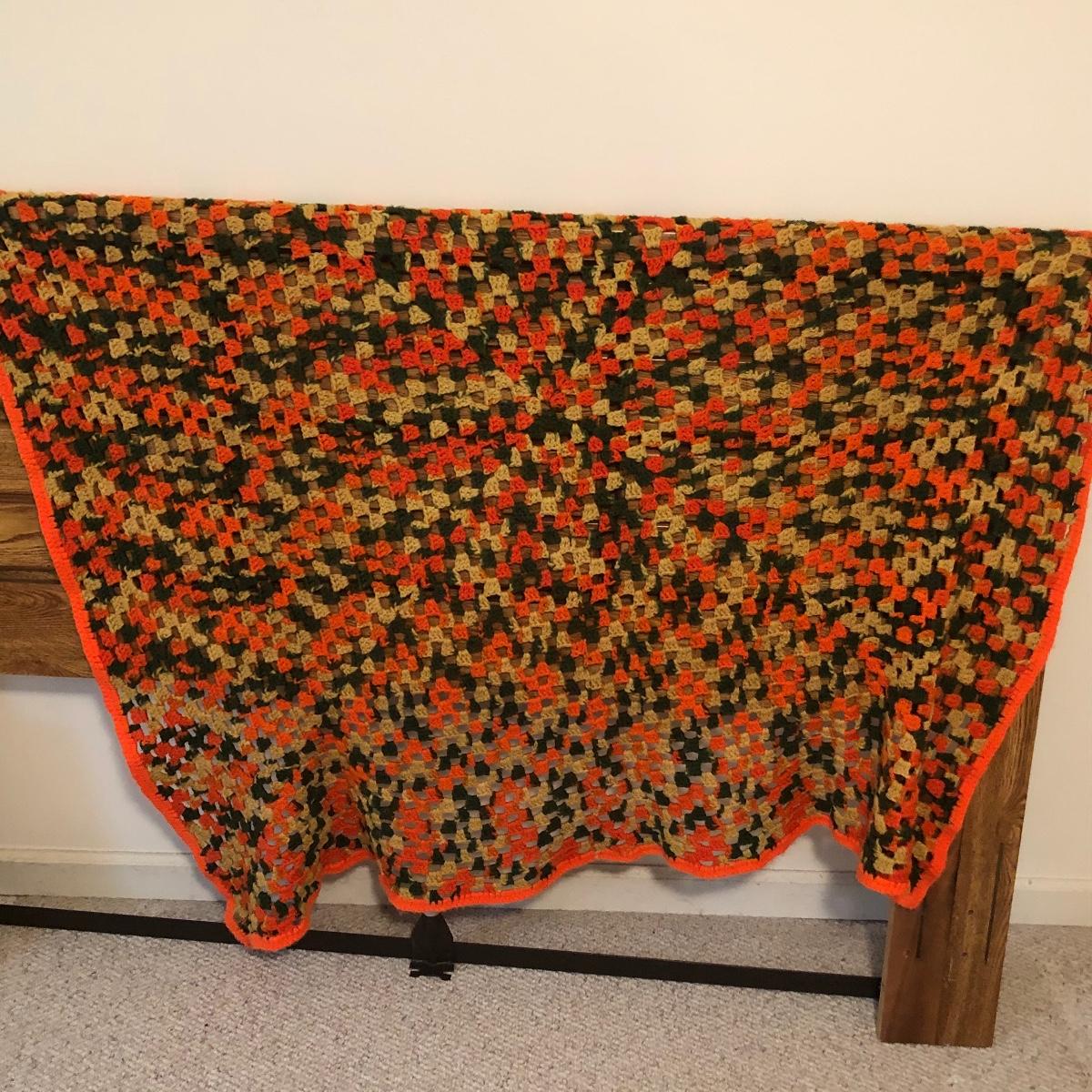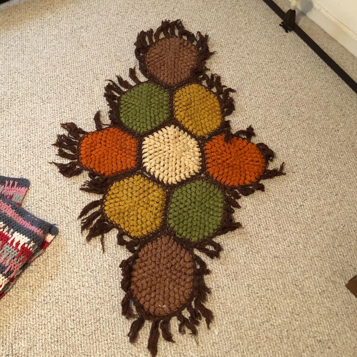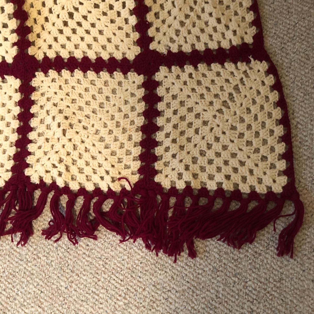 The majority of the blankets in this lot are vintage, some with a great retro look. The unique retro knitted table cloth comes in brown, green and orange wool. Also included is a red, white and green crocheted tree stand cover and a retro crocheted pillow which does have a tear on the one side.