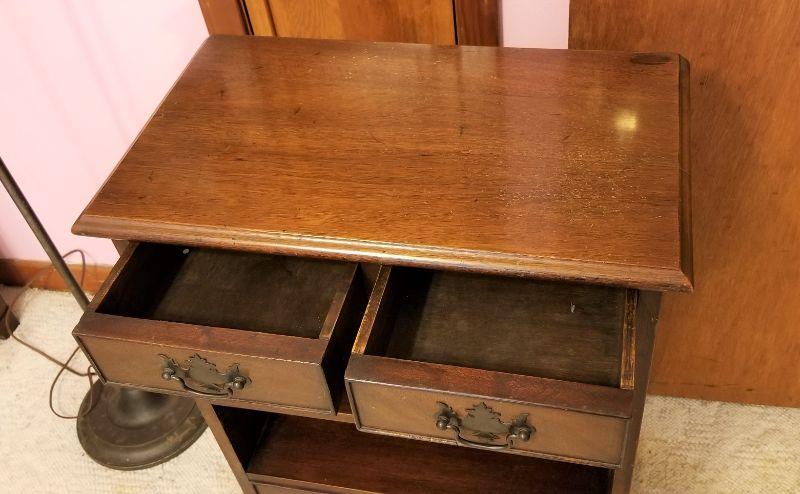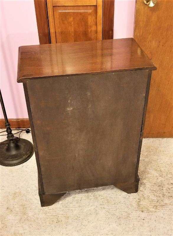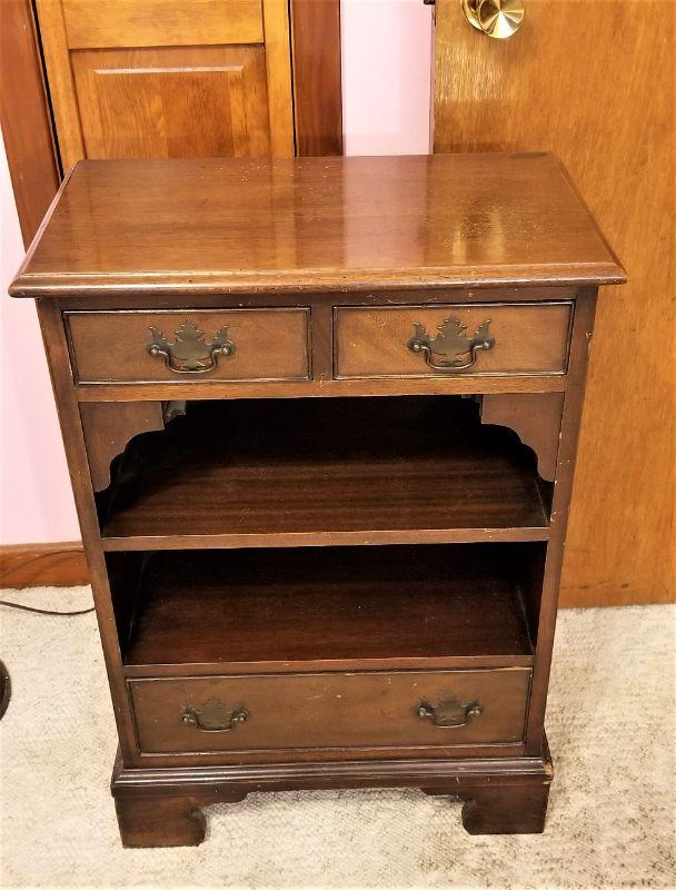 Use as nightstand or small bookcase - nice heavy mahogany table with 3 drawers. One small ding at bottom corner. 30" tall, 21" across, 12" deep. Solid wood.