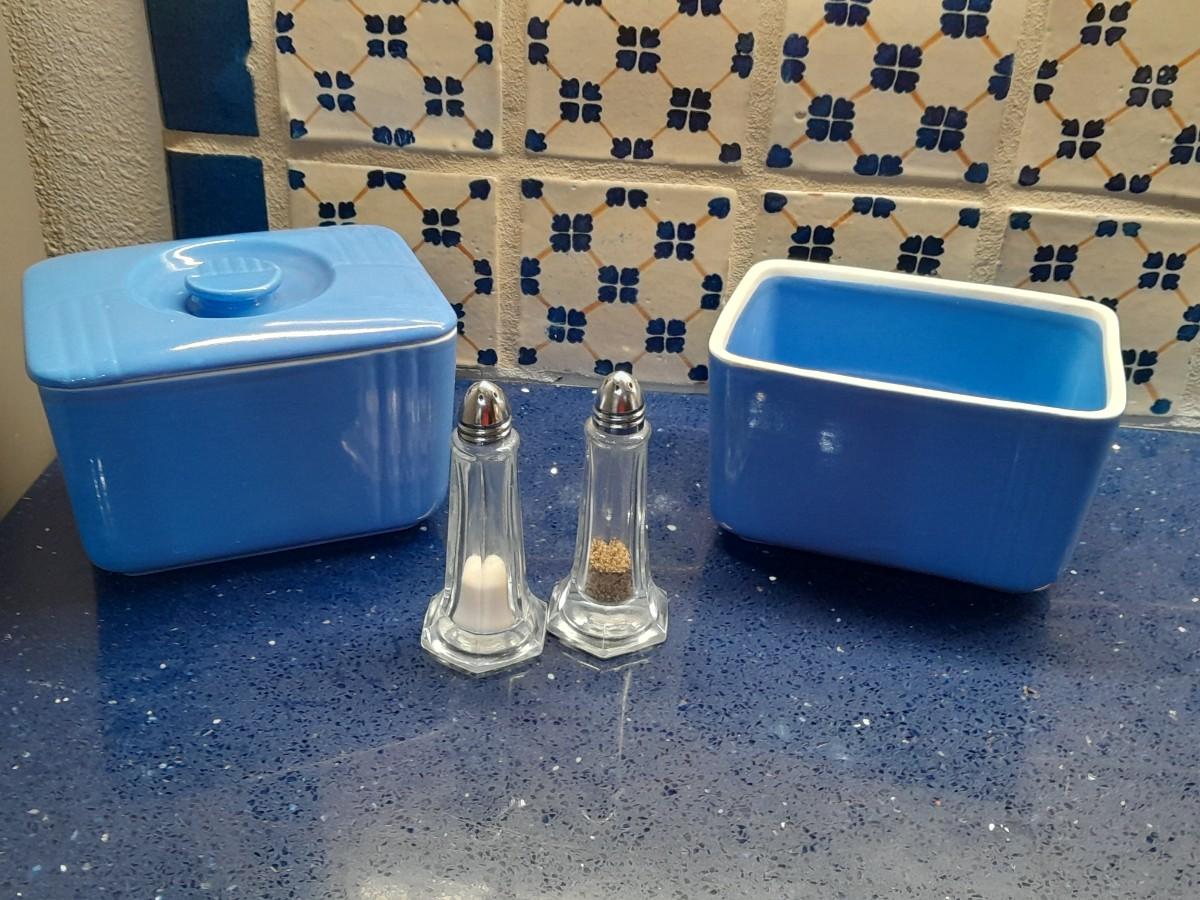 TWO VINTAGE WESTINGHOUSE CONTAINERS, ONE WITH LID, AND A NICE SALT AND PEPPER SHAKER PAIR