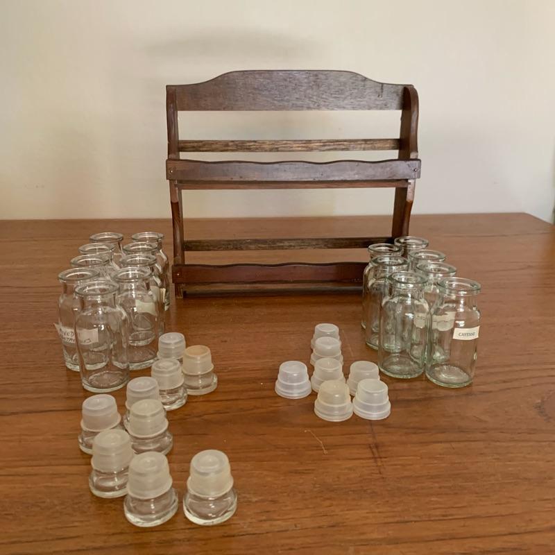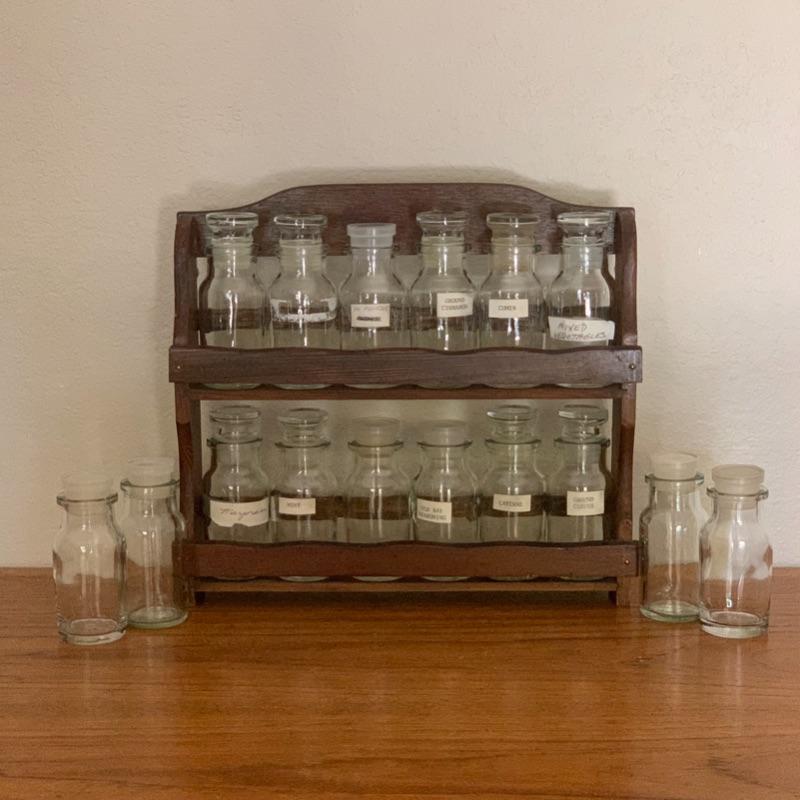 Vintage wood spice rack with Set of 12 vintage spice bottles with tops and 4 extra.