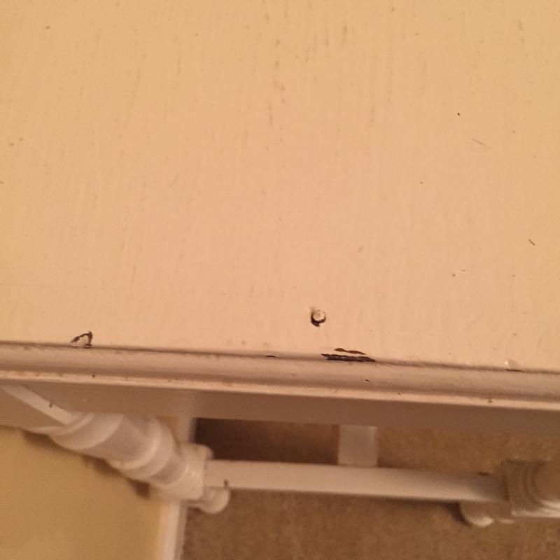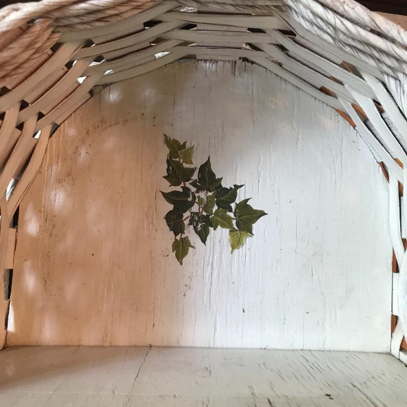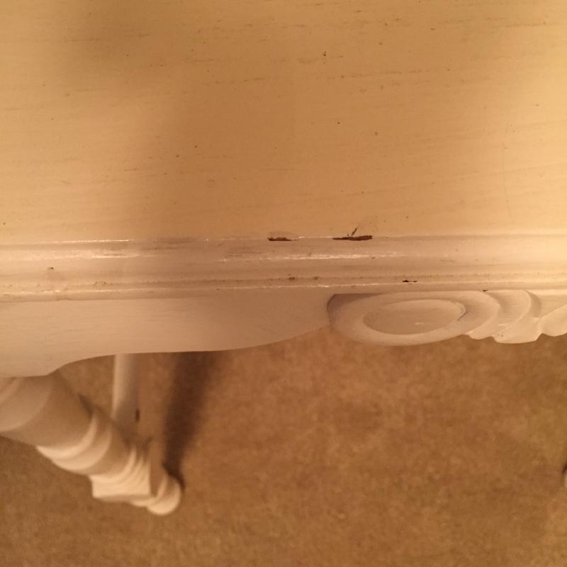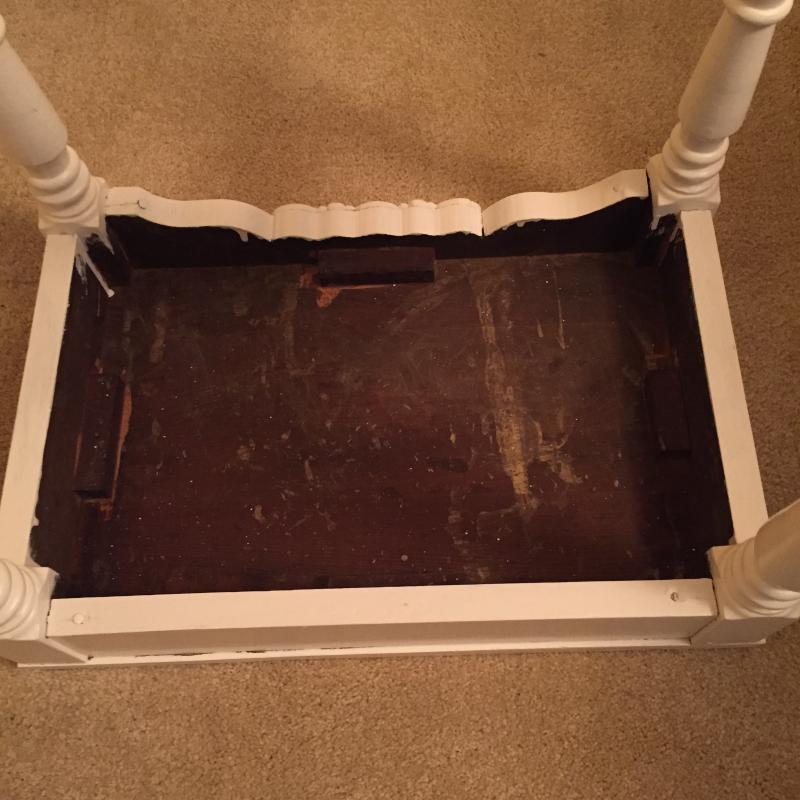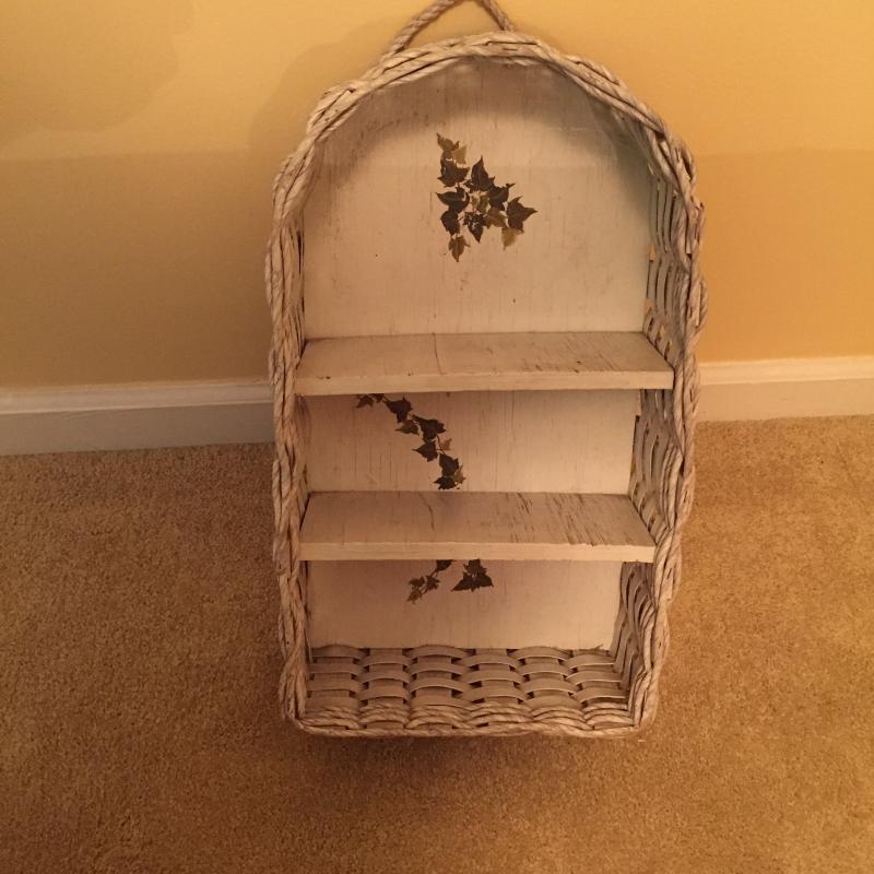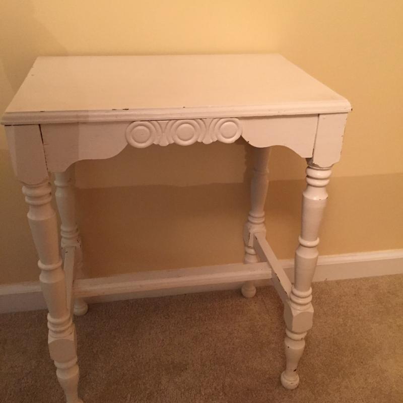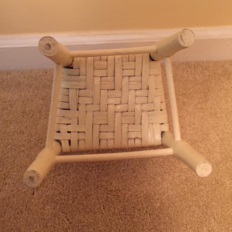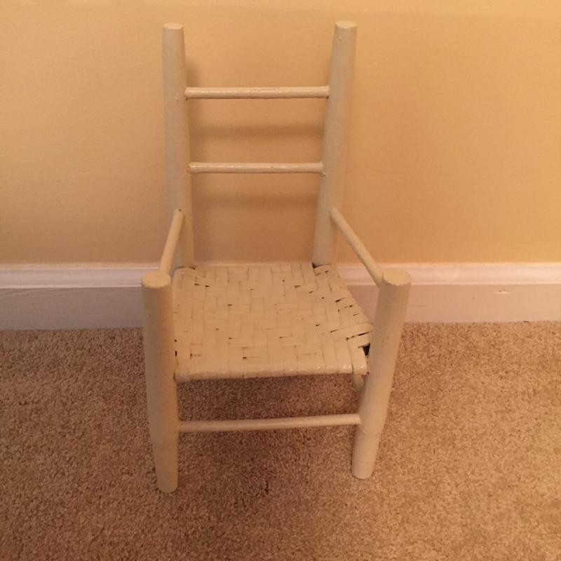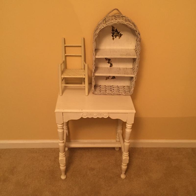 White Wooden Side Table, Woven Shelf and Doll Chair. Table has a few nicks in paint. See Pictures. Table Measures 19”x 12.75”x 23.75”. Local Pickup Only