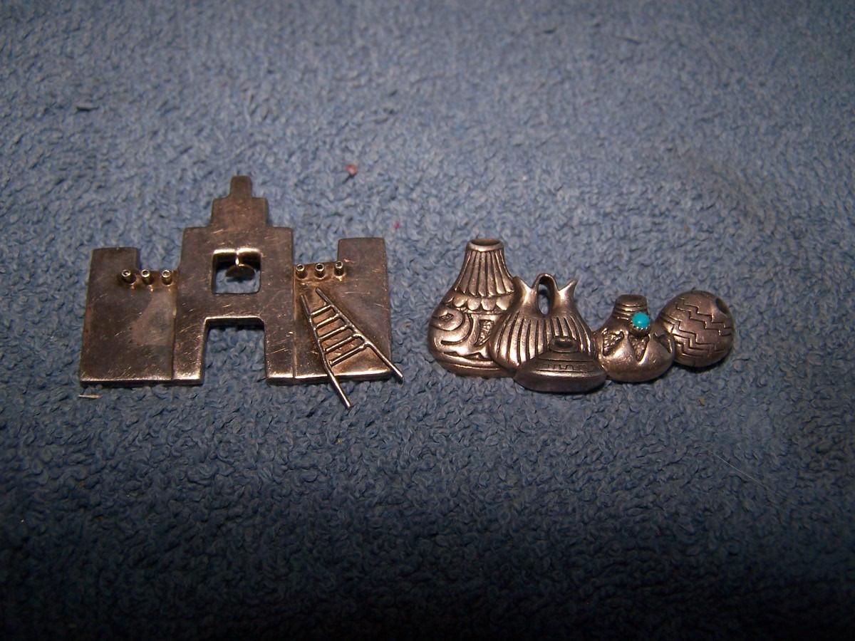 LOT 44 WONDERFUL STERLING NATIVE AMERICAN PINS-- POTS WITH TURQUOISE & PUEBLO