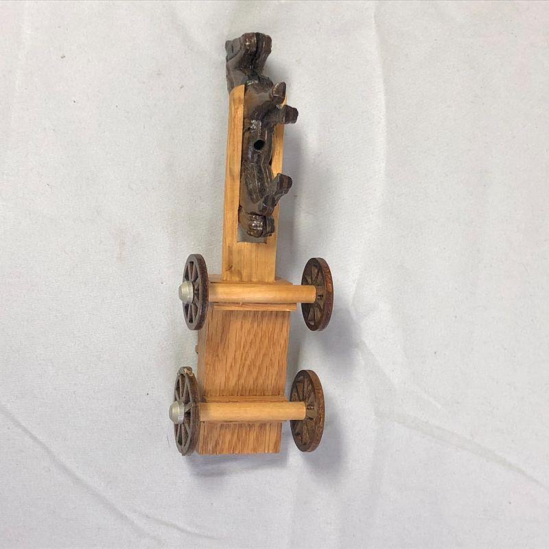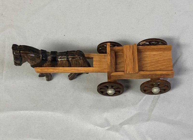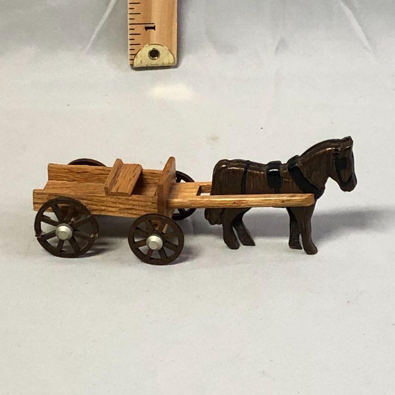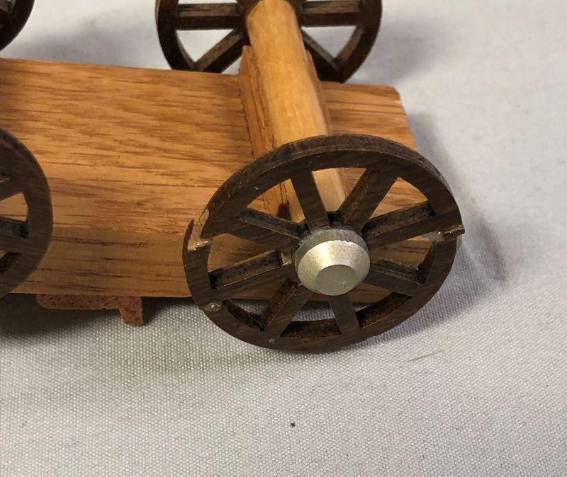 Cute little rustic piece. The only issue is the one wheel was broken and repaired and now it doesn't spin like the other three. It is 6.25" long.