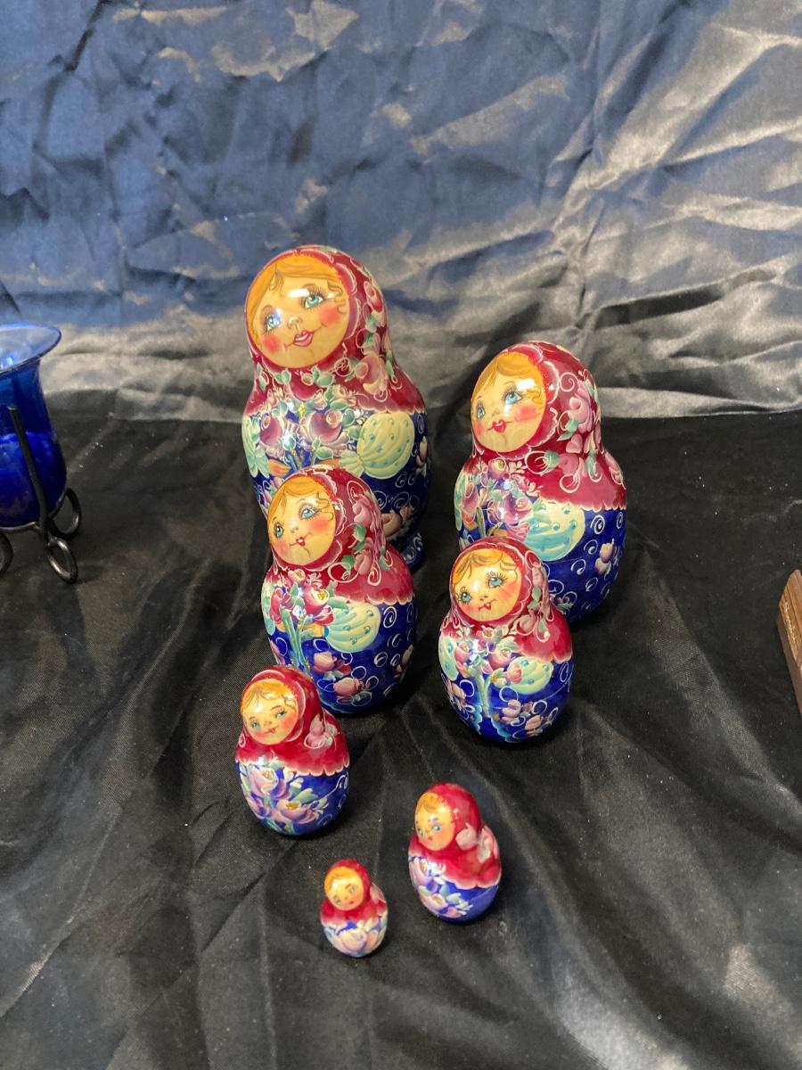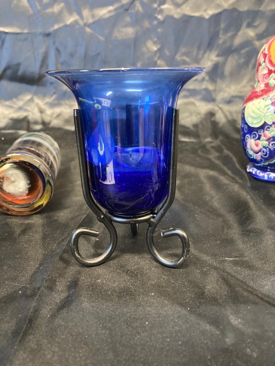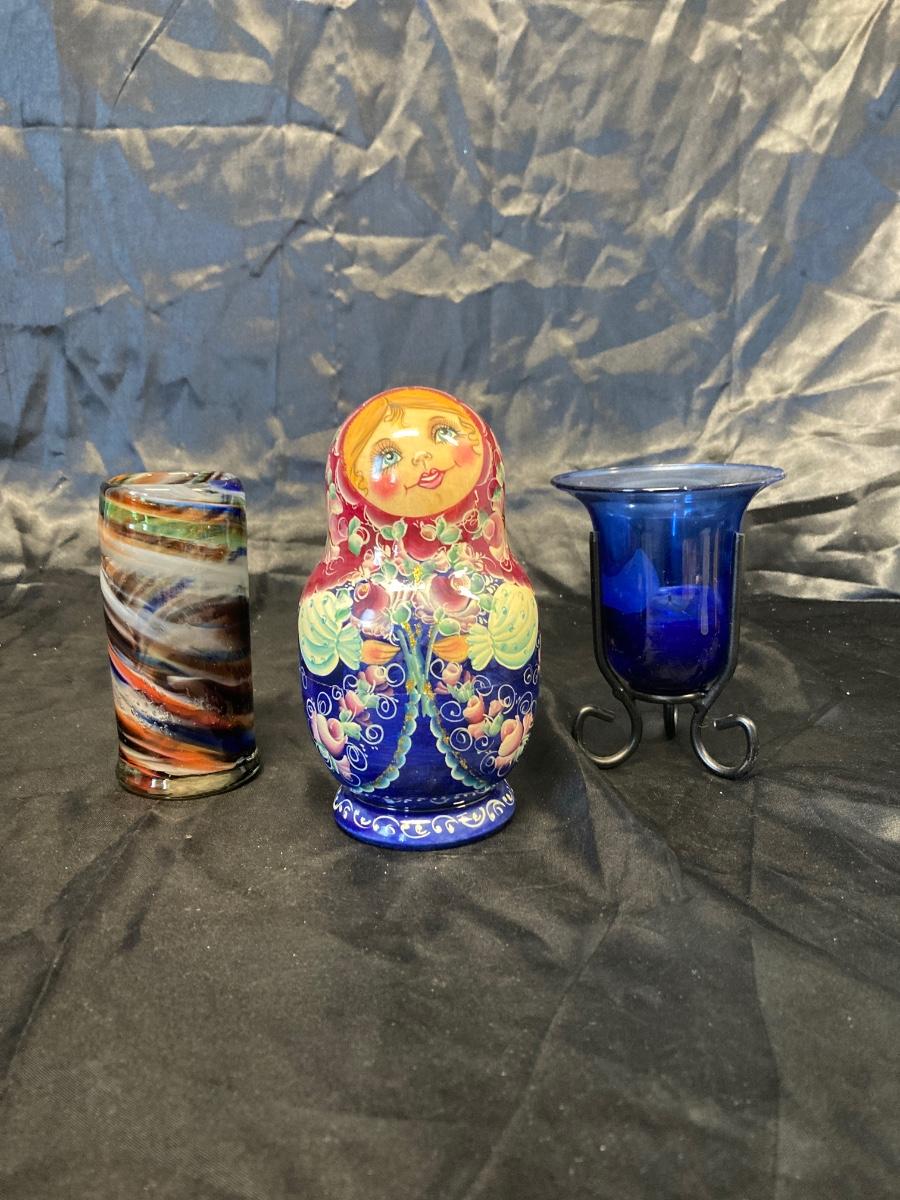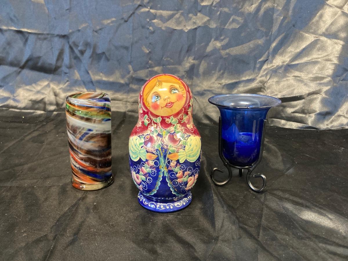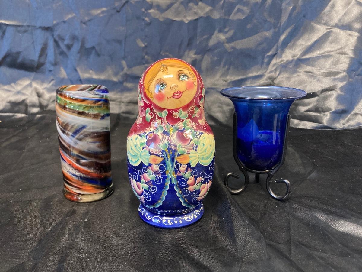 VINTAGE RUSSIAN NESTING DOLL, COLORFUL SWIRLED GLASS AND BLUE CANDLEHOLDER