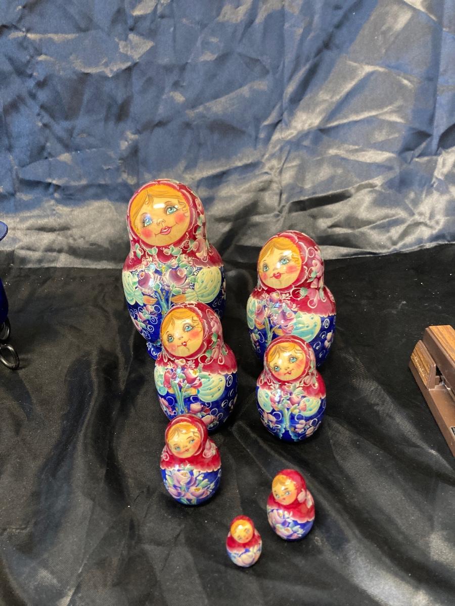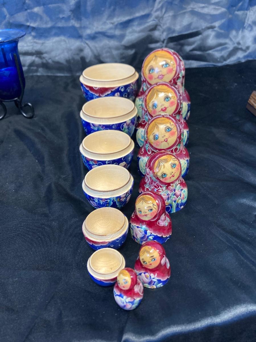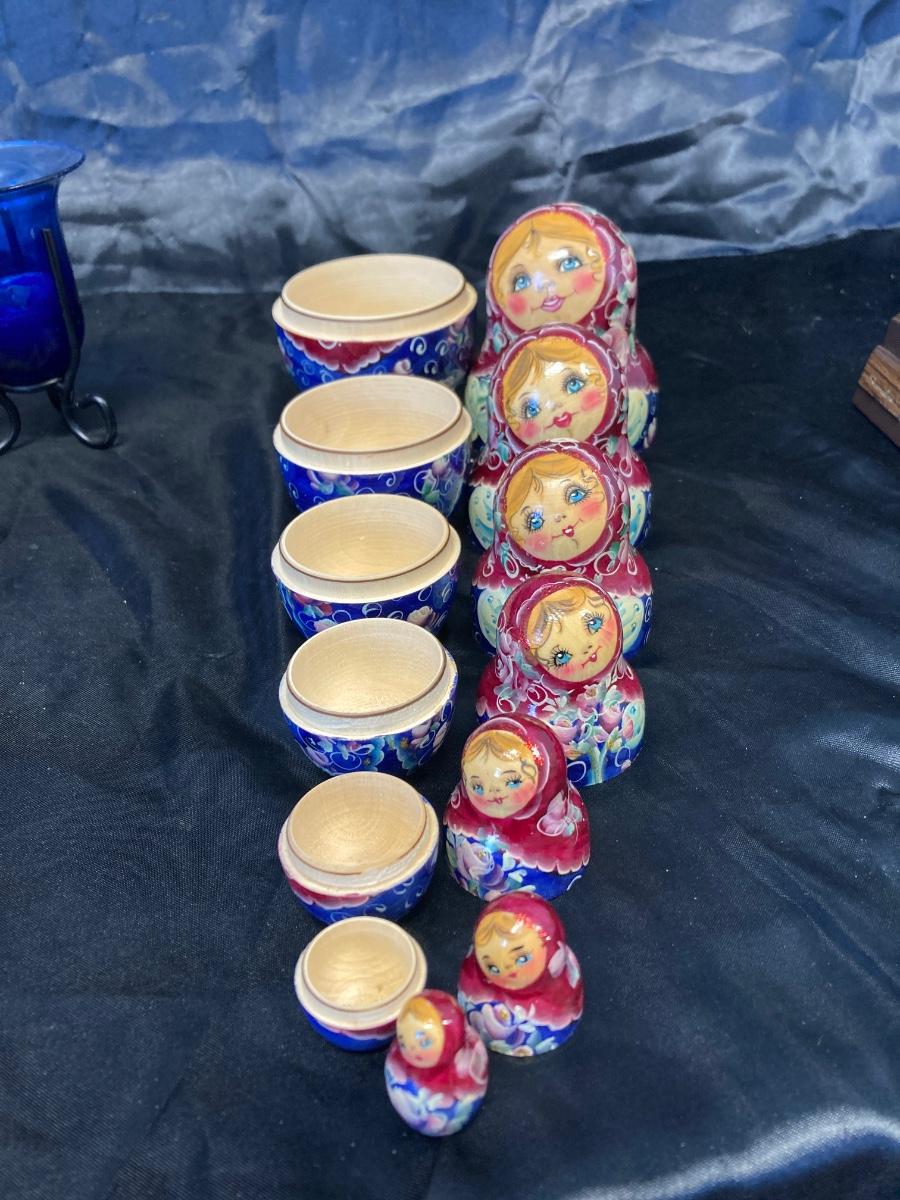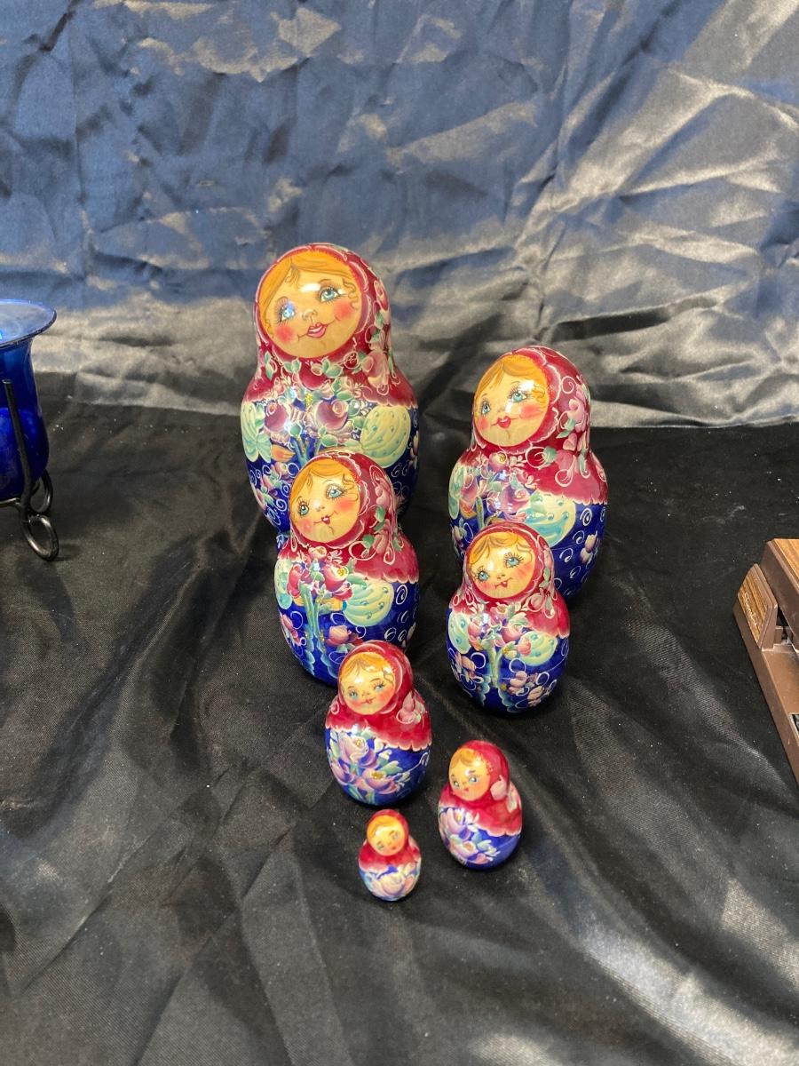 VINTAGE RUSSIAN NESTING DOLL, COLORFUL SWIRLED GLASS AND BLUE CANDLEHOLDER